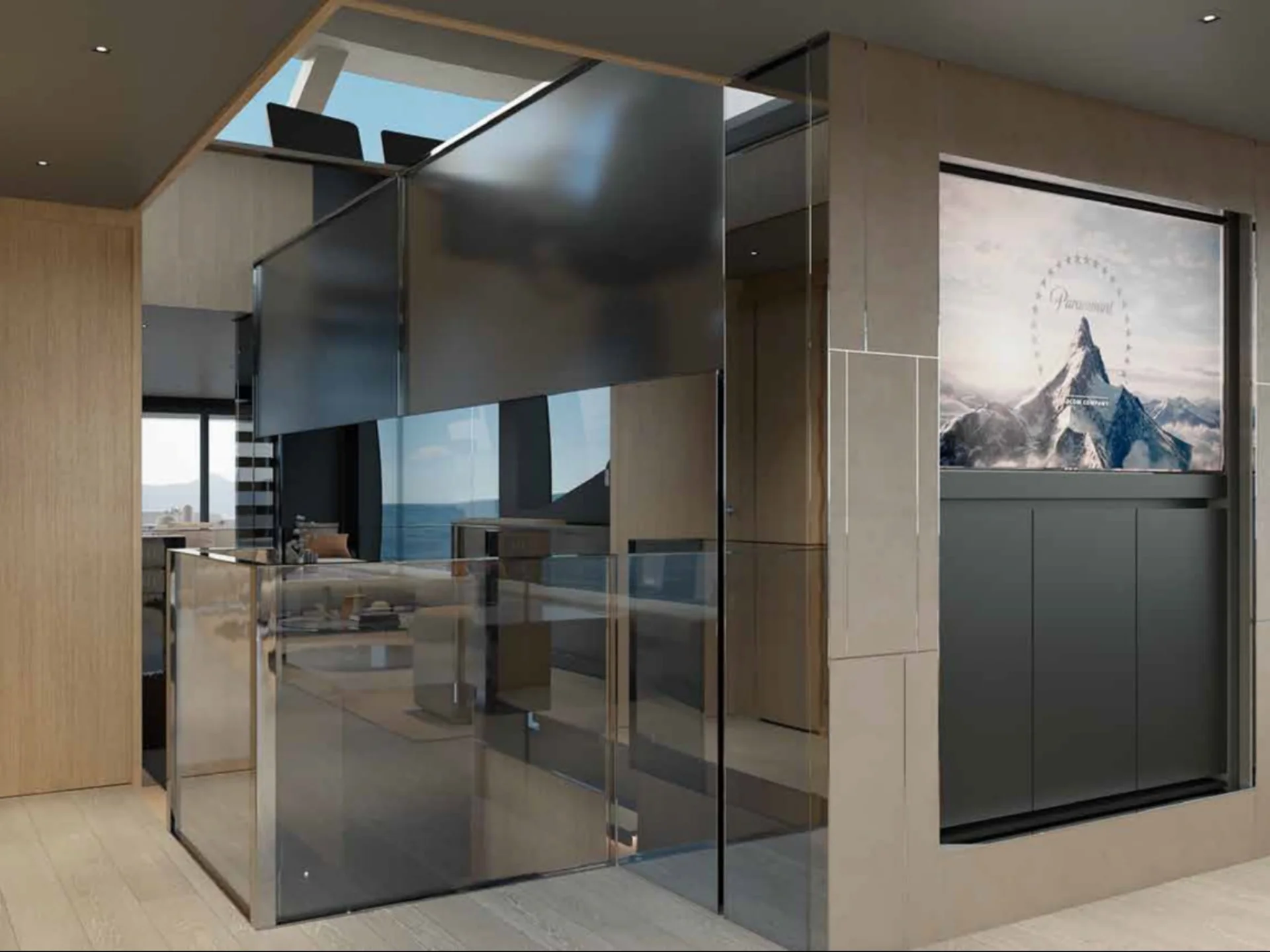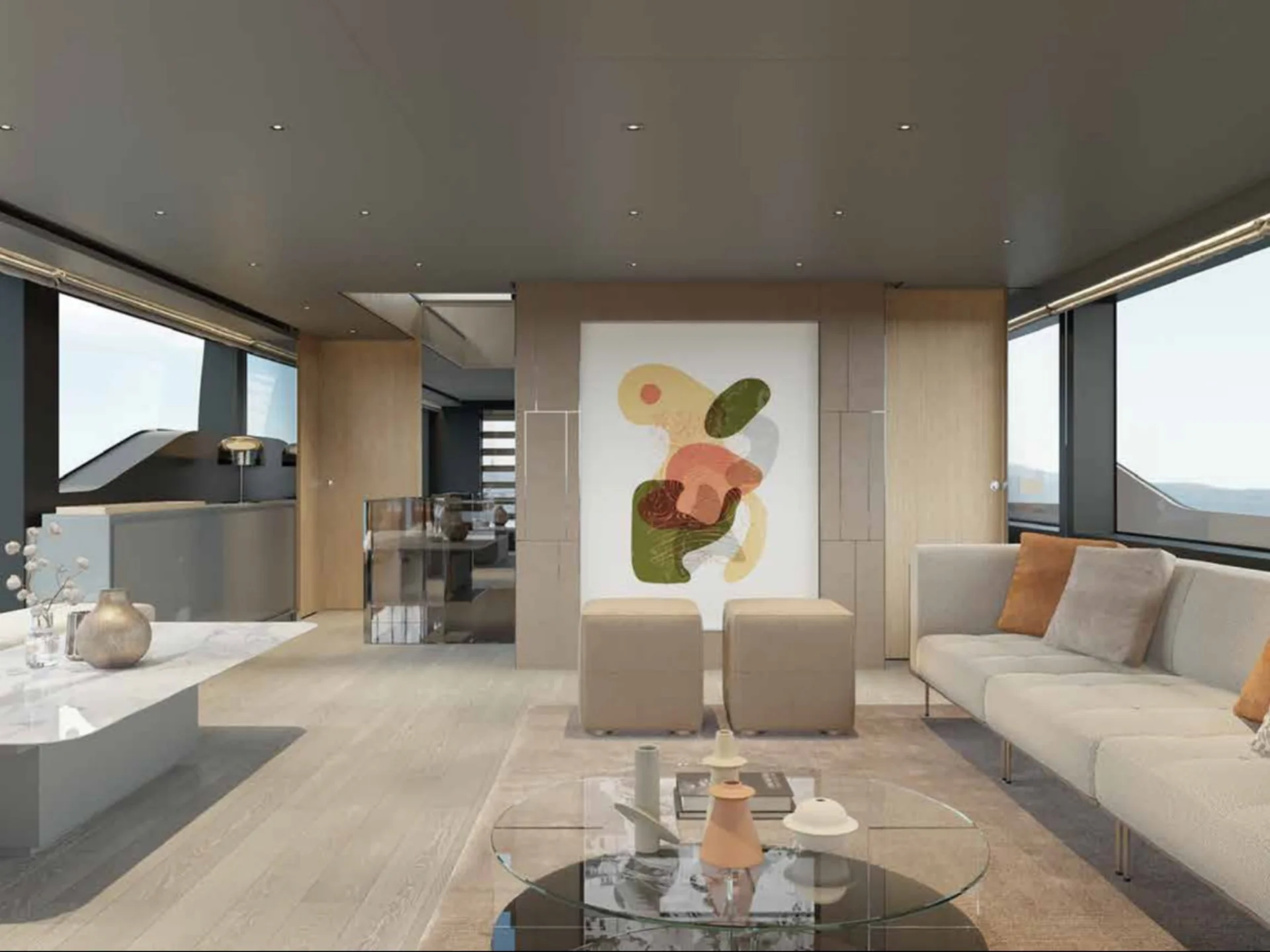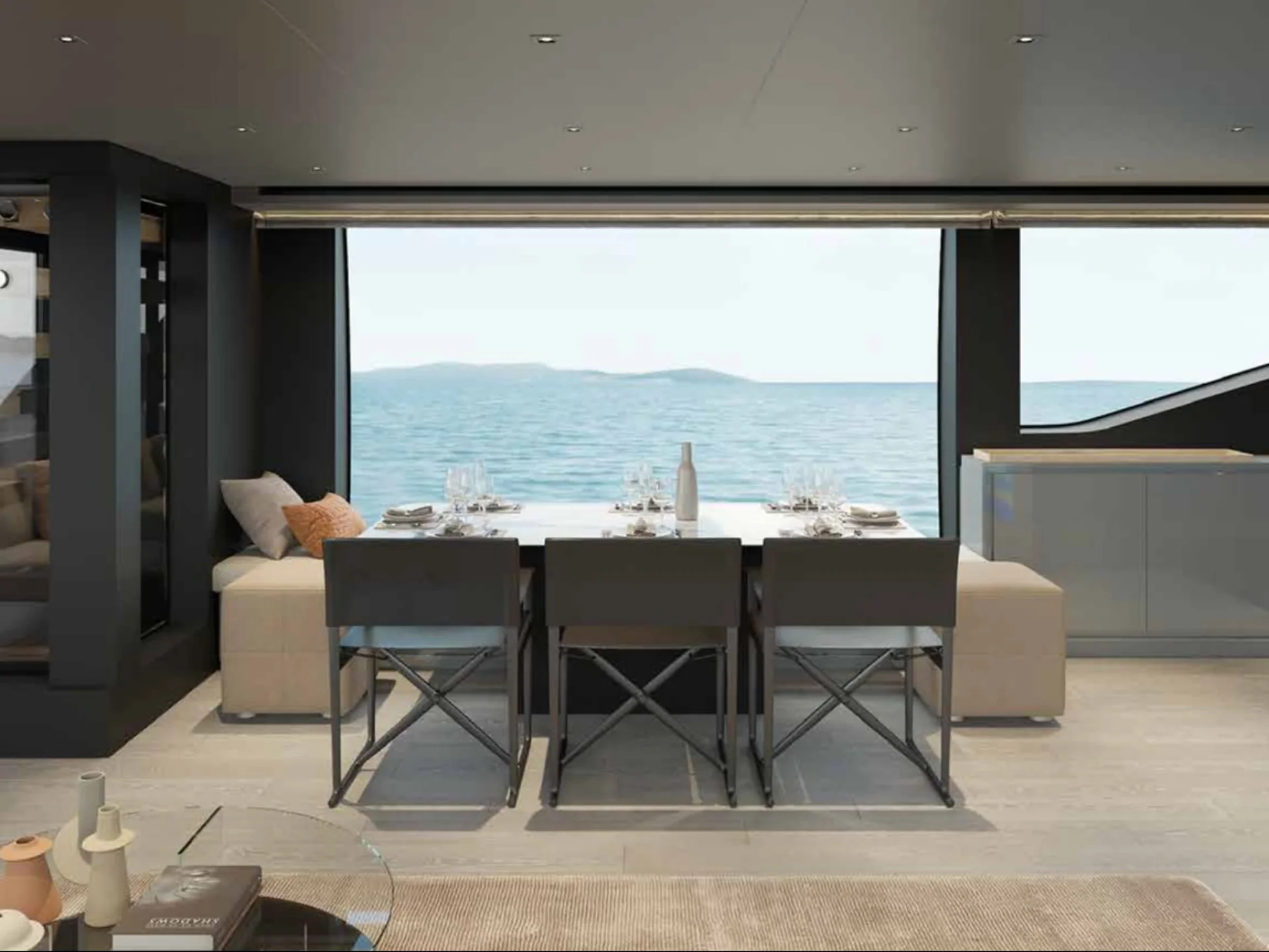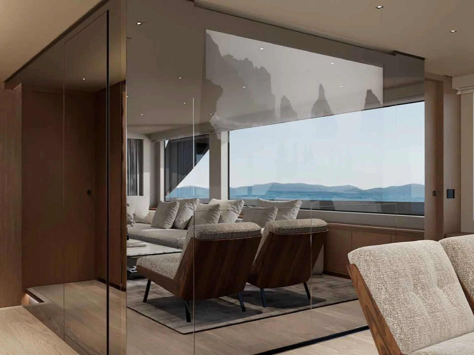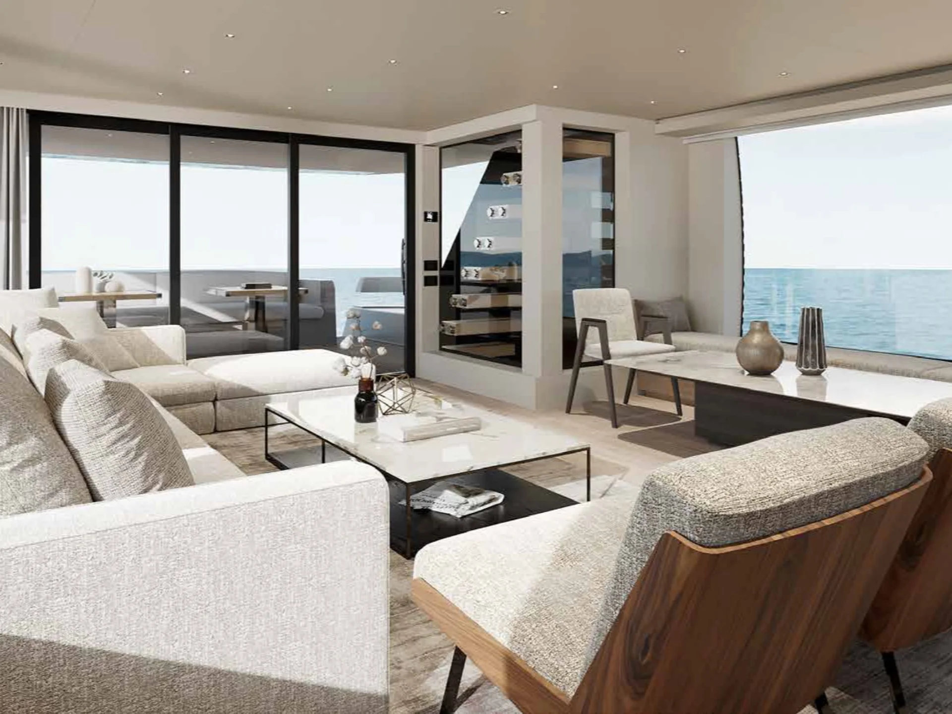 - Floor-to-ceiling windows in the main salon, creating a bright interior and a seamless connection to the sea