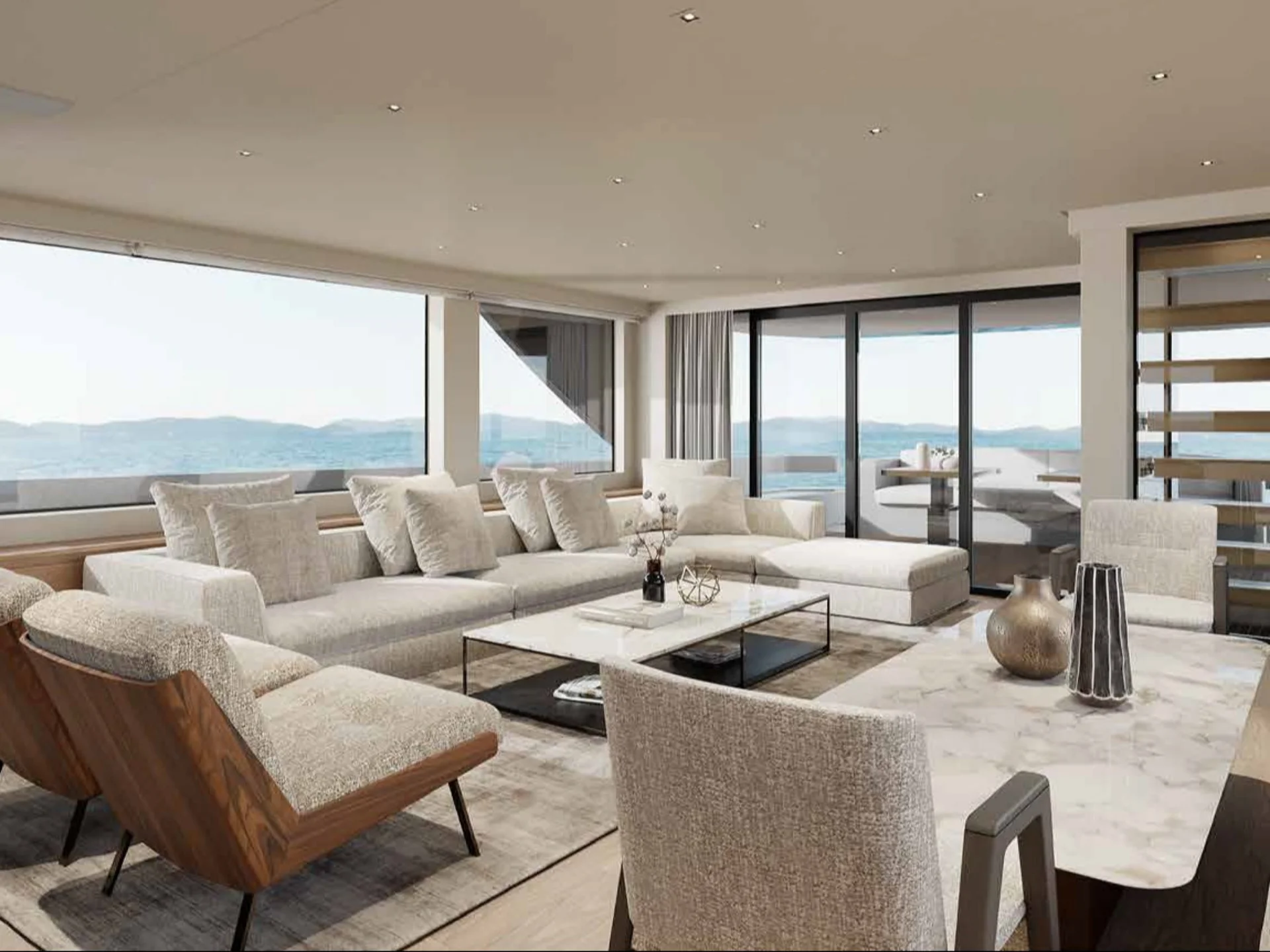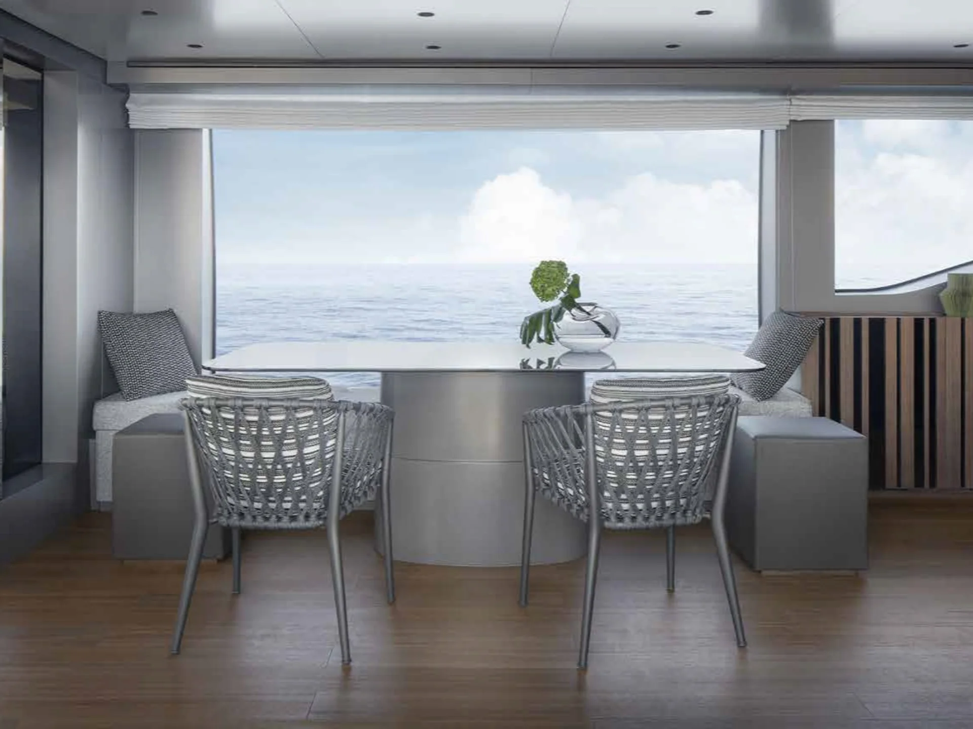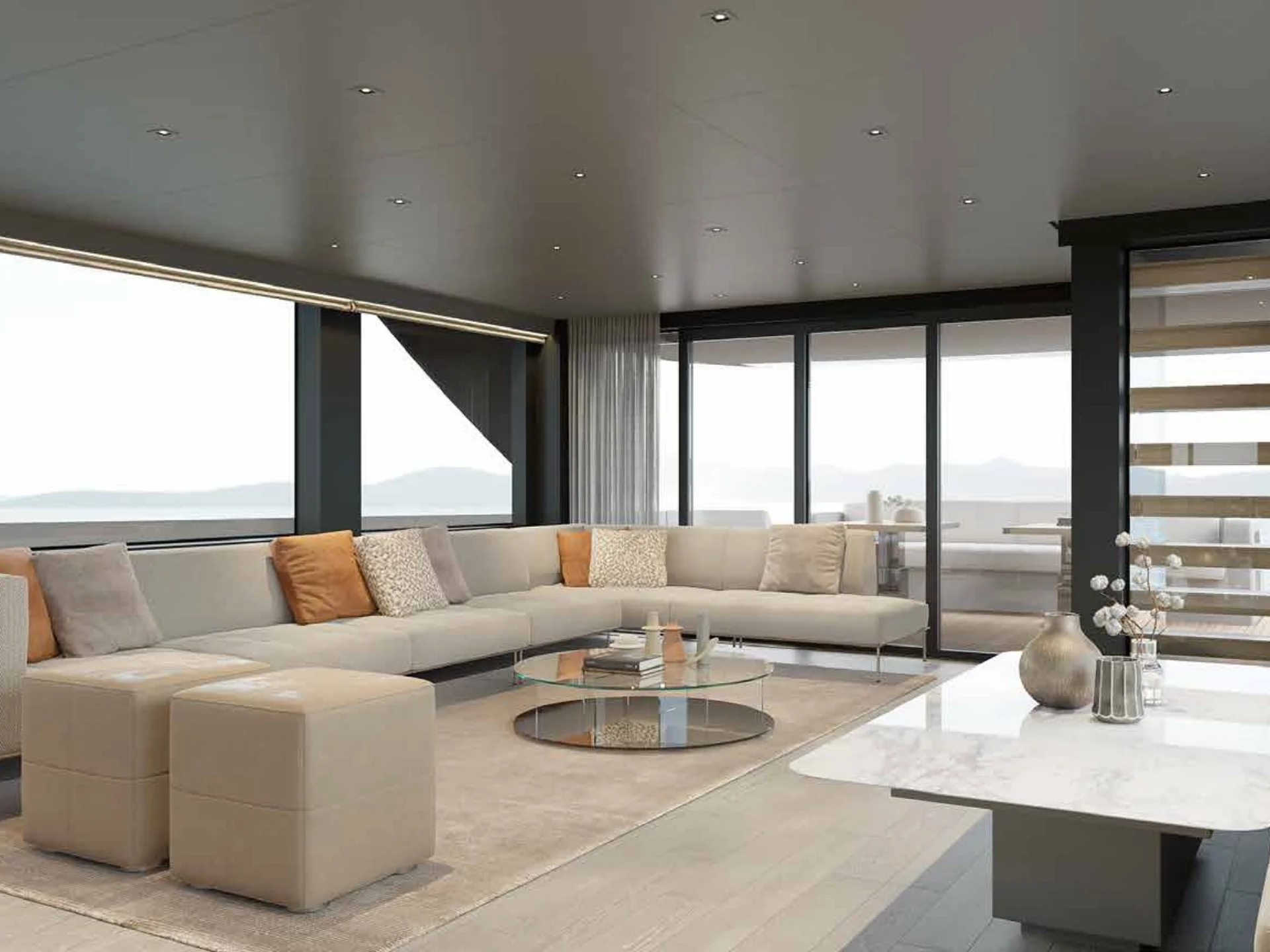 The main deck features a bright, open-plan salon with generous seating and an indoor dining area, enhanced by expansive windows that flood the space with natural light and offer uninterrupted sea views. The SL90A’s unique asymmetrical layout creates a stronger connection between interior and exterior spaces, delivering a noticeably more open and airy atmosphere than traditional yachts of her size.