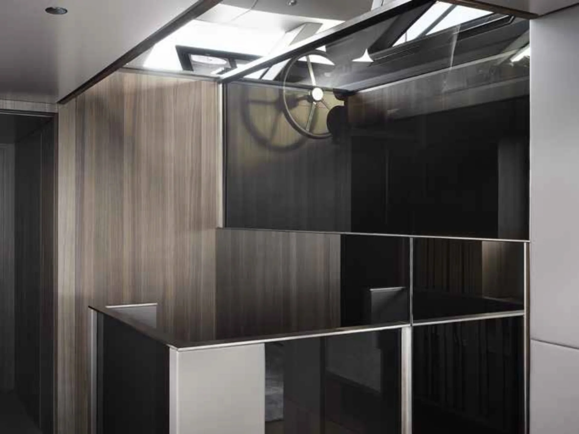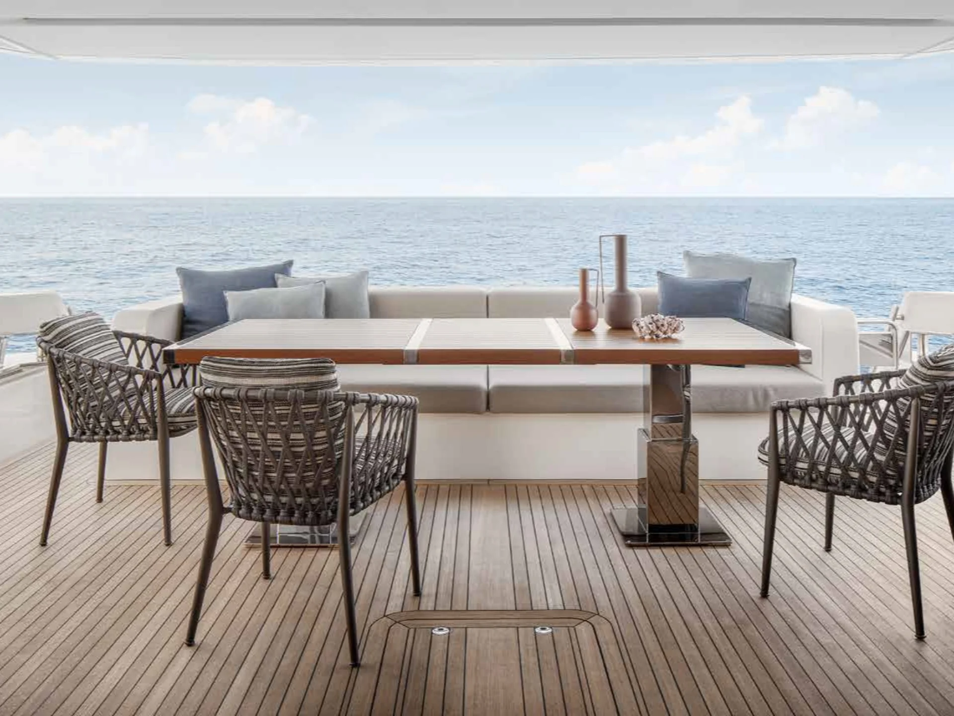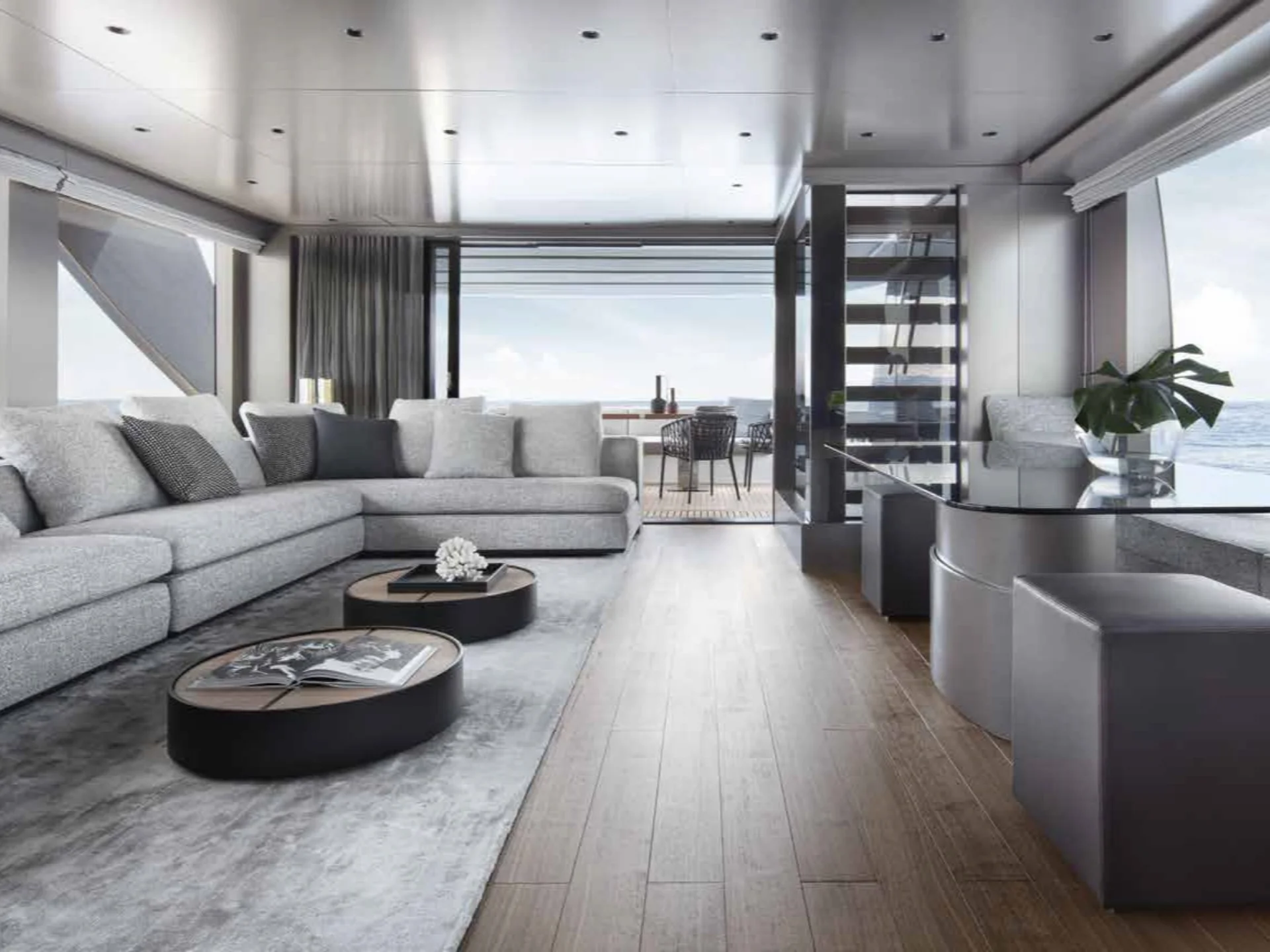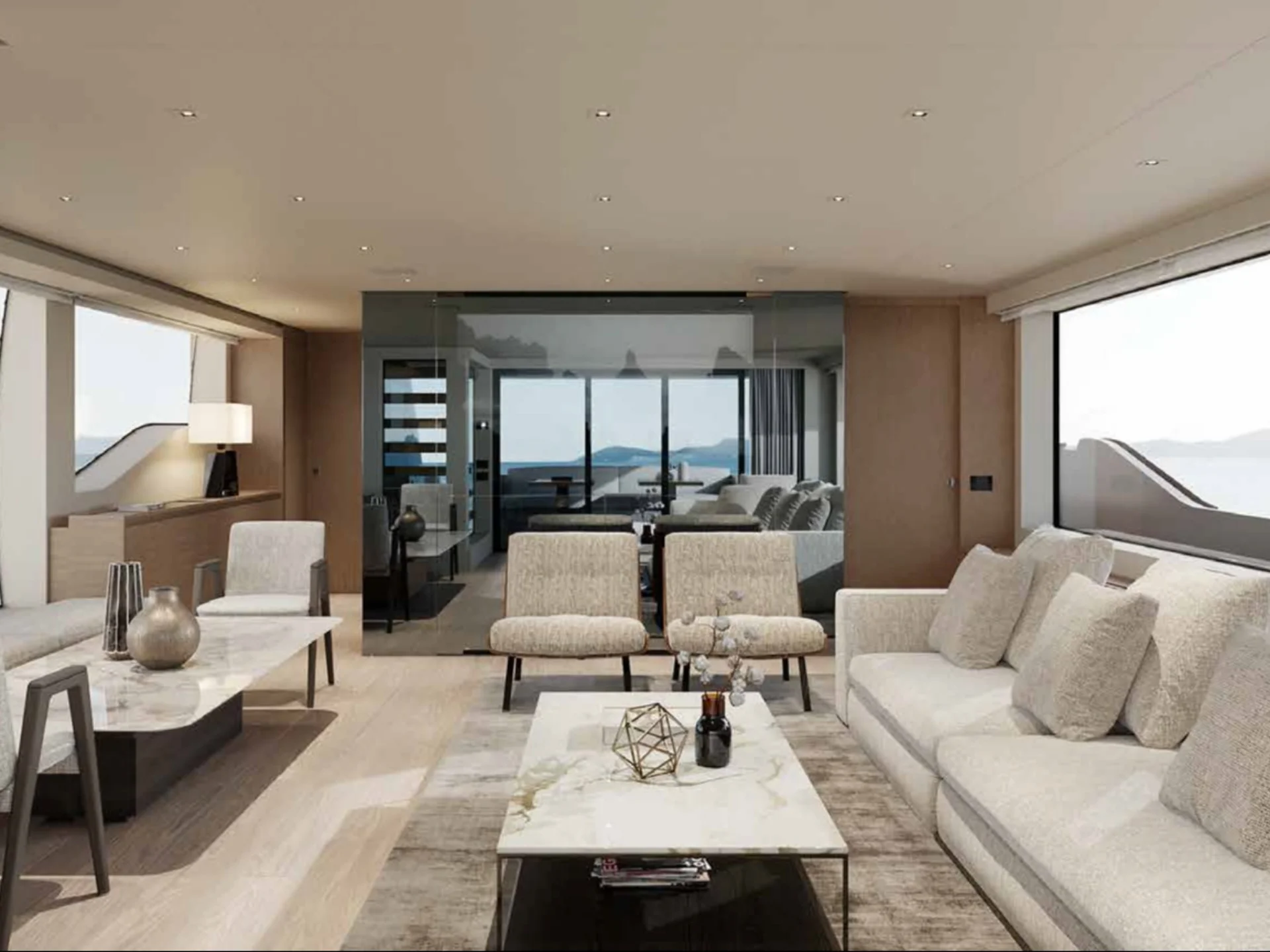 The main deck features a bright, open-plan salon with generous seating and an indoor dining area, enhanced by expansive windows that flood the space with natural light and offer uninterrupted sea views. The SL90A’s unique asymmetrical layout creates a stronger connection between interior and exterior spaces, delivering a noticeably more open and airy atmosphere than traditional yachts of her size.