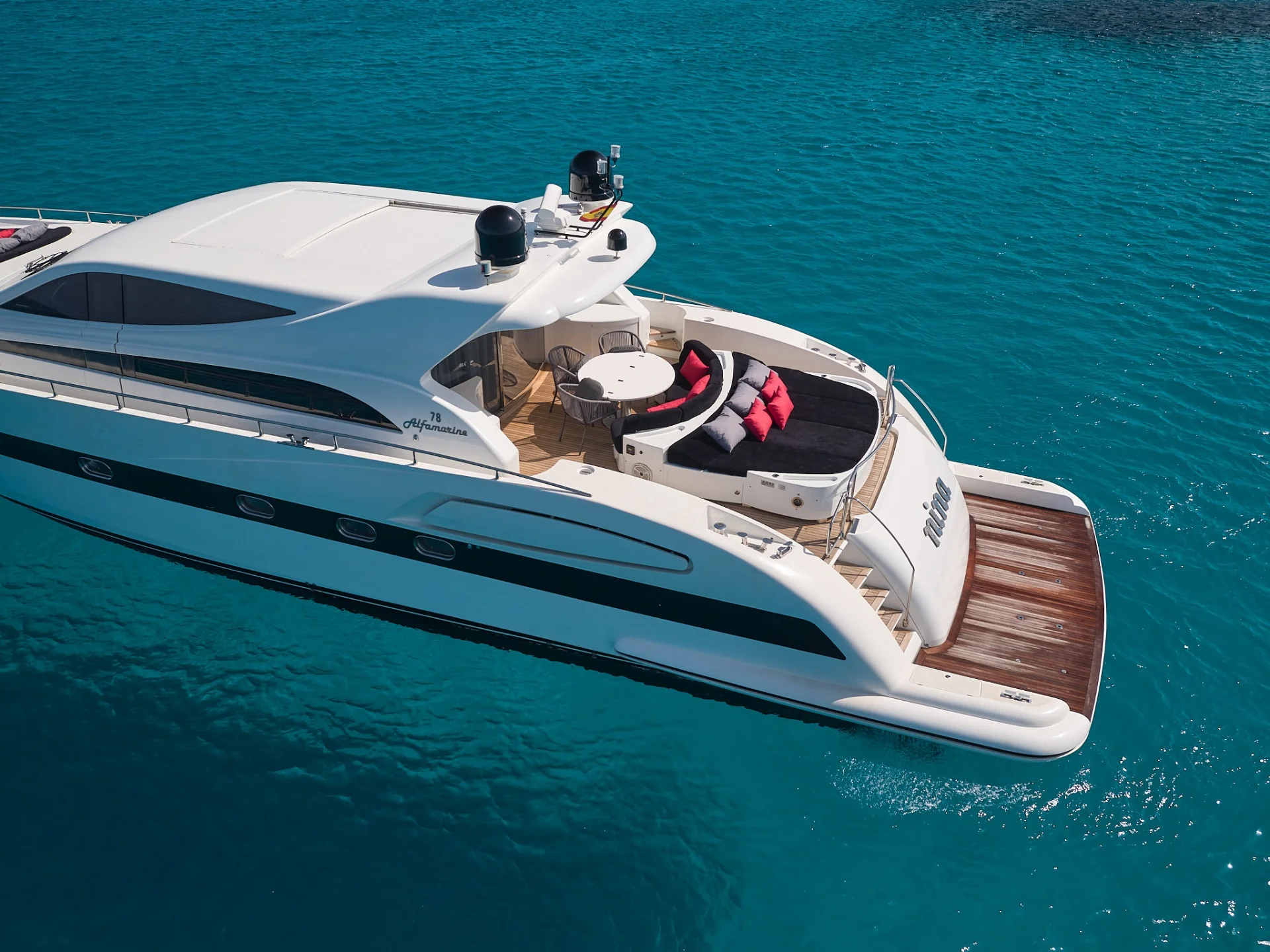 Mit einer Länge von 23,72 Metern (77' 10") ist die von Alfamarine gebaute Motoryacht NINA eine atemberaubende Wahl für einen Yachtcharter auf Ibiza, die italienische Handwerkskunst mit einem raffinierten, großzügigen Design verbindet. Die NINA wurde 2008 vom Stapel gelassen und 2018 wunderschön überholt. Ihr Layout ist ideal für Familien und Freunde. Das Interieur stammt von Cantiere di Fiumicino und der Hauptsalon besticht durch sein zeitloses, elegantes Design und bietet bequeme Sitzgelegenheiten für alle Gäste.