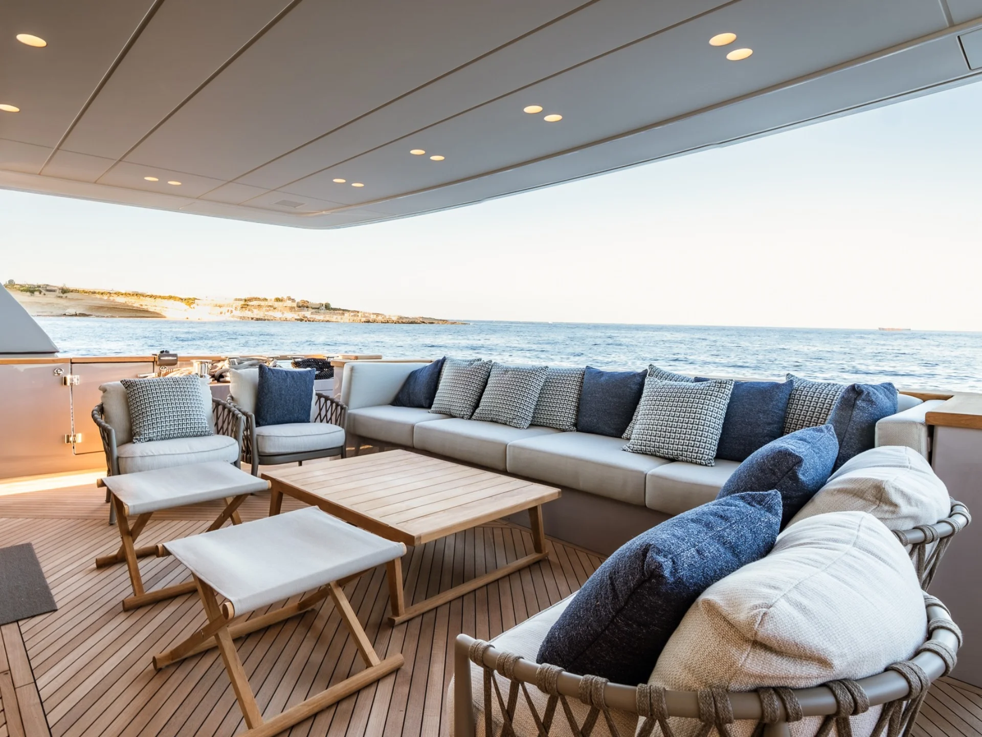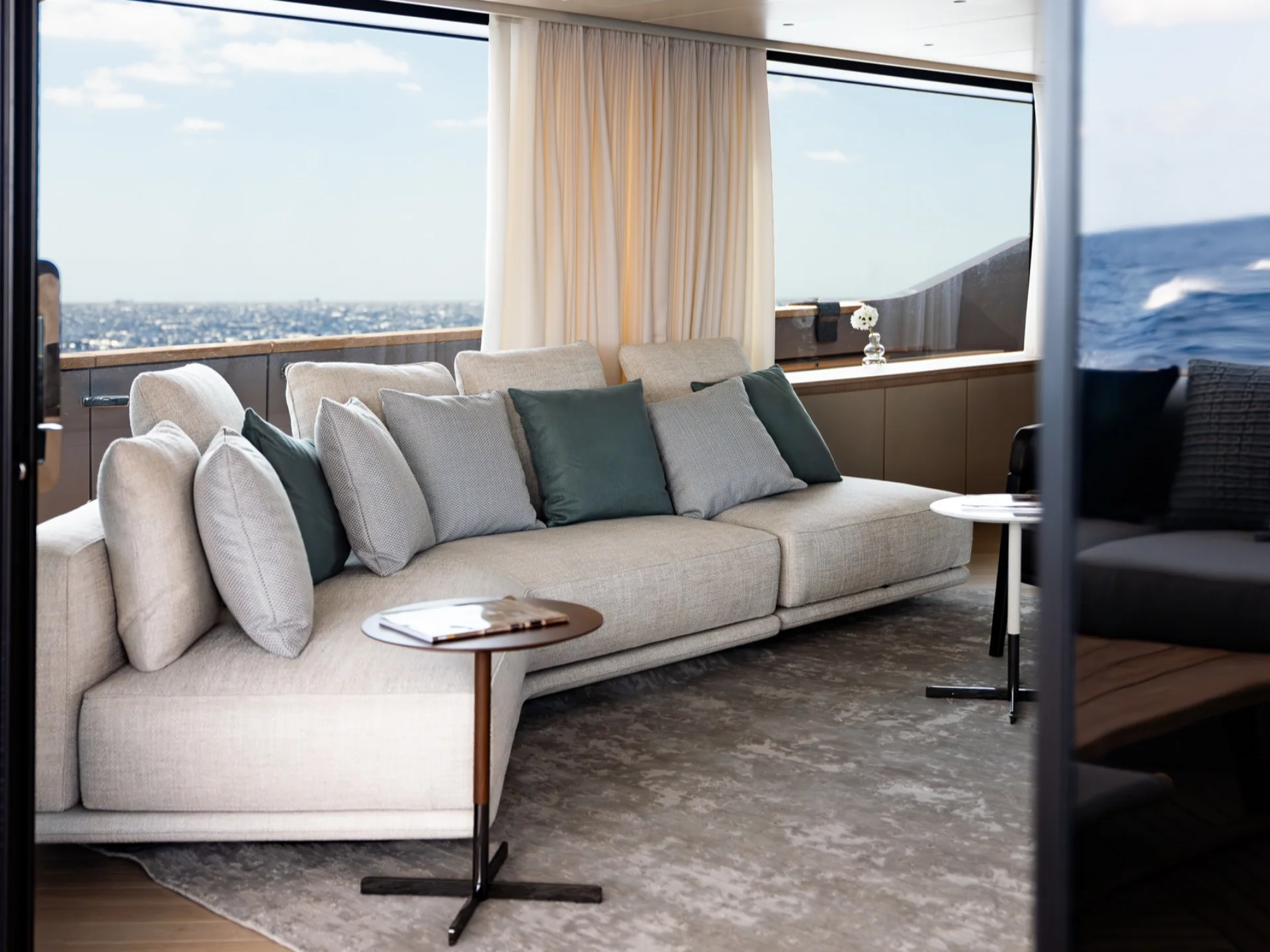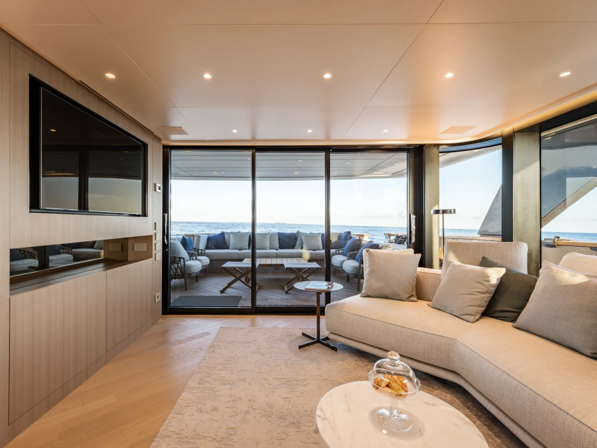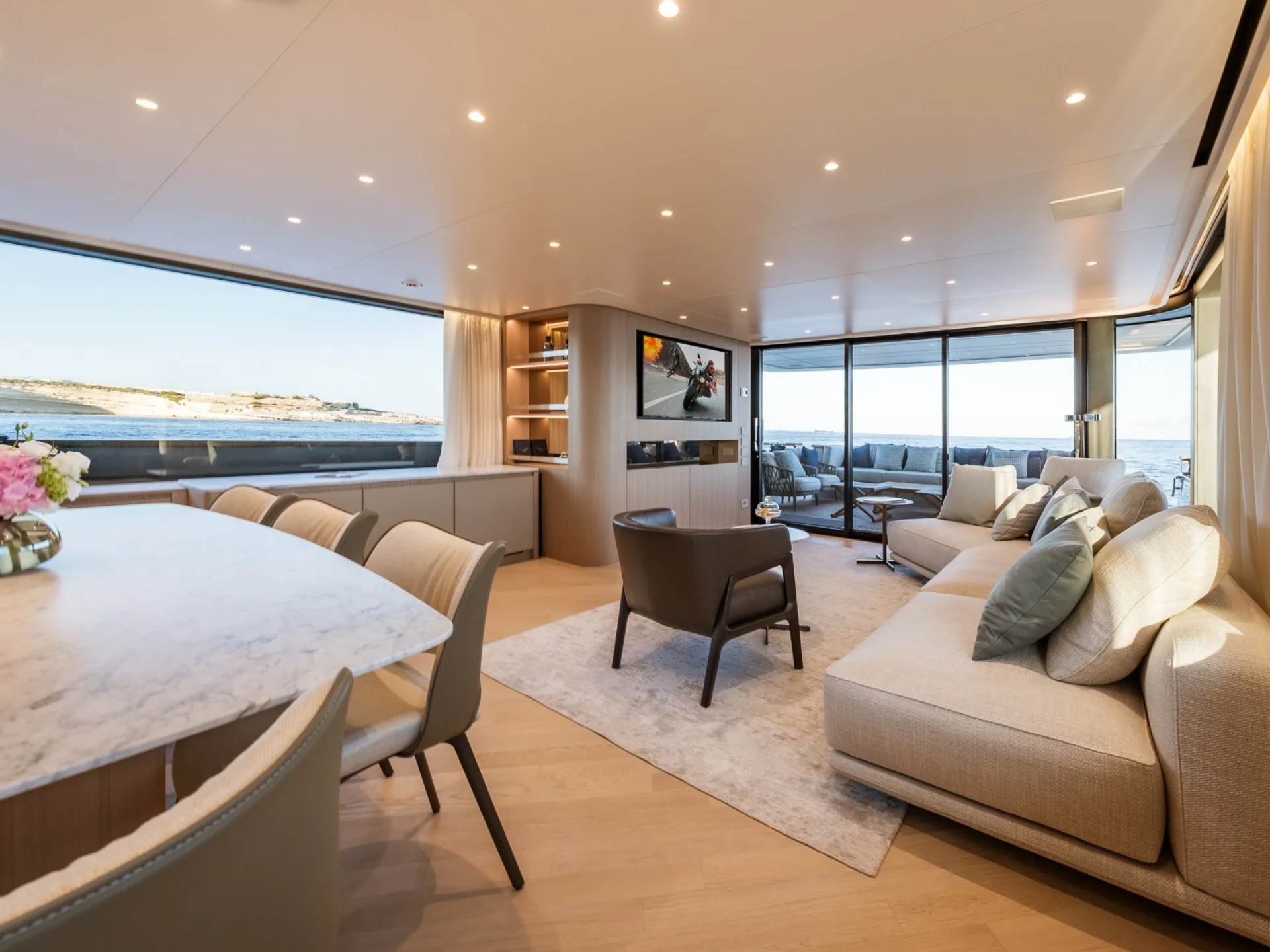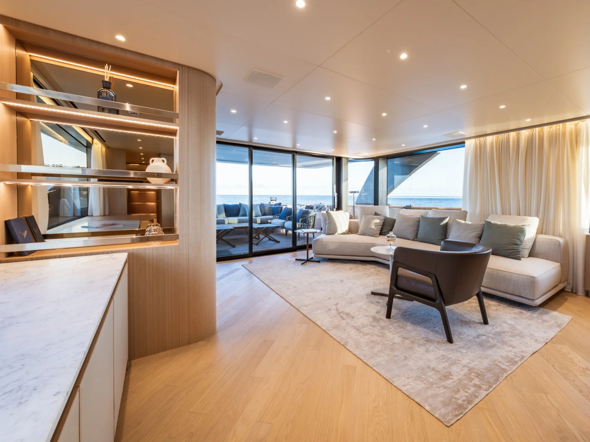 - Light-filled main salon with refined finishes and panoramic sea views