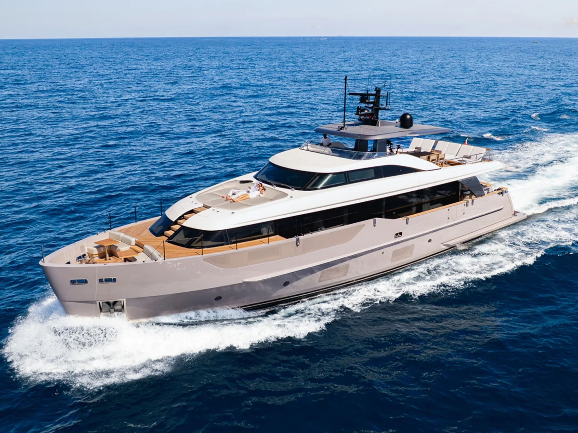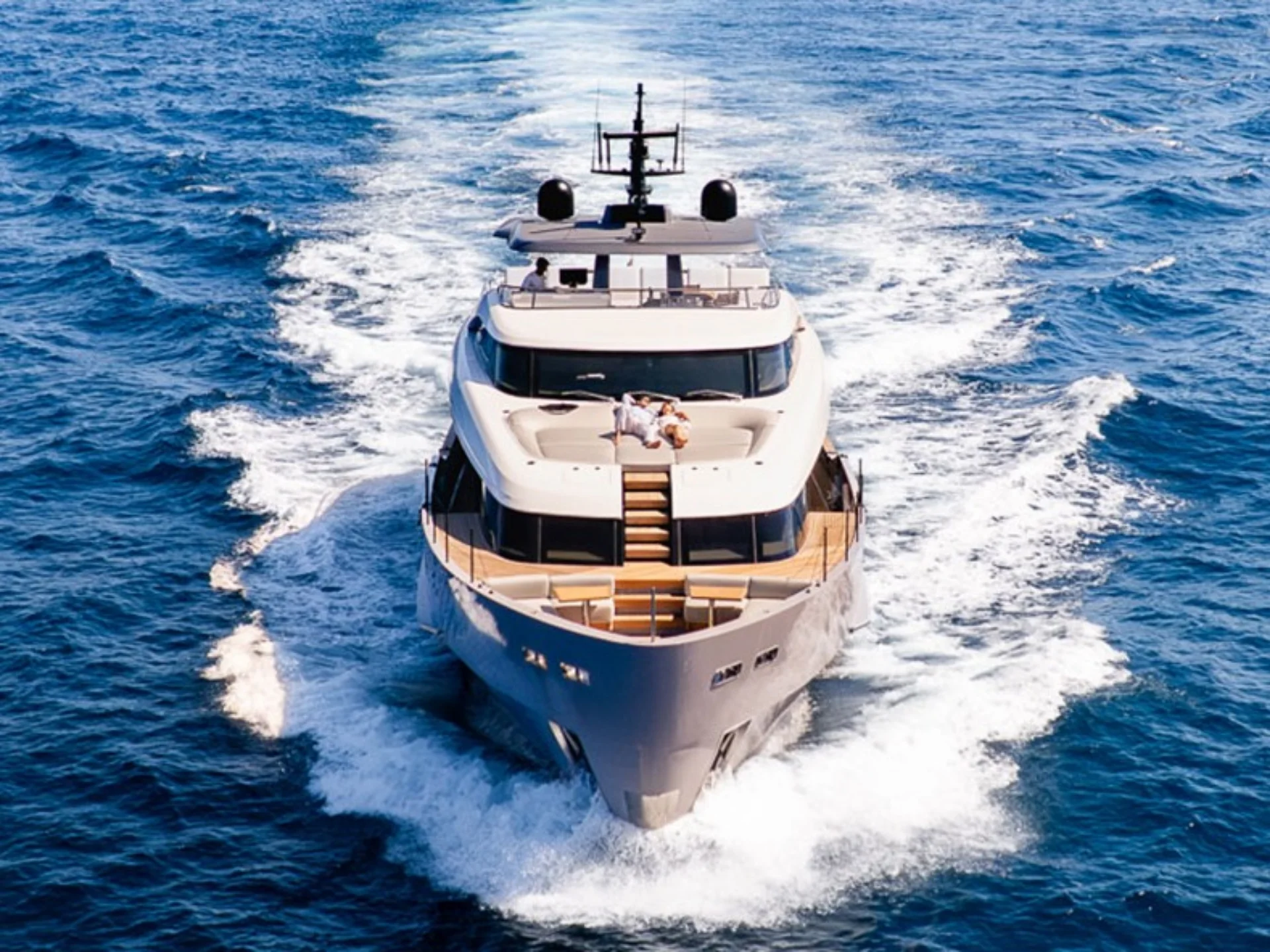 The yacht’s bow is dedicated to ultimate relaxation, featuring a generous sunbathing area and a lounge zone fully surrounded by the sea, allowing guests to enjoy open views and a complete immersion in the surrounding marine environment. The flybridge is one of the yacht’s most exclusive spaces, designed for tranquil cruising or social moments, and equipped with a helm station, table, and sofas, offering an ideal setting for relaxing and spending time together on board.