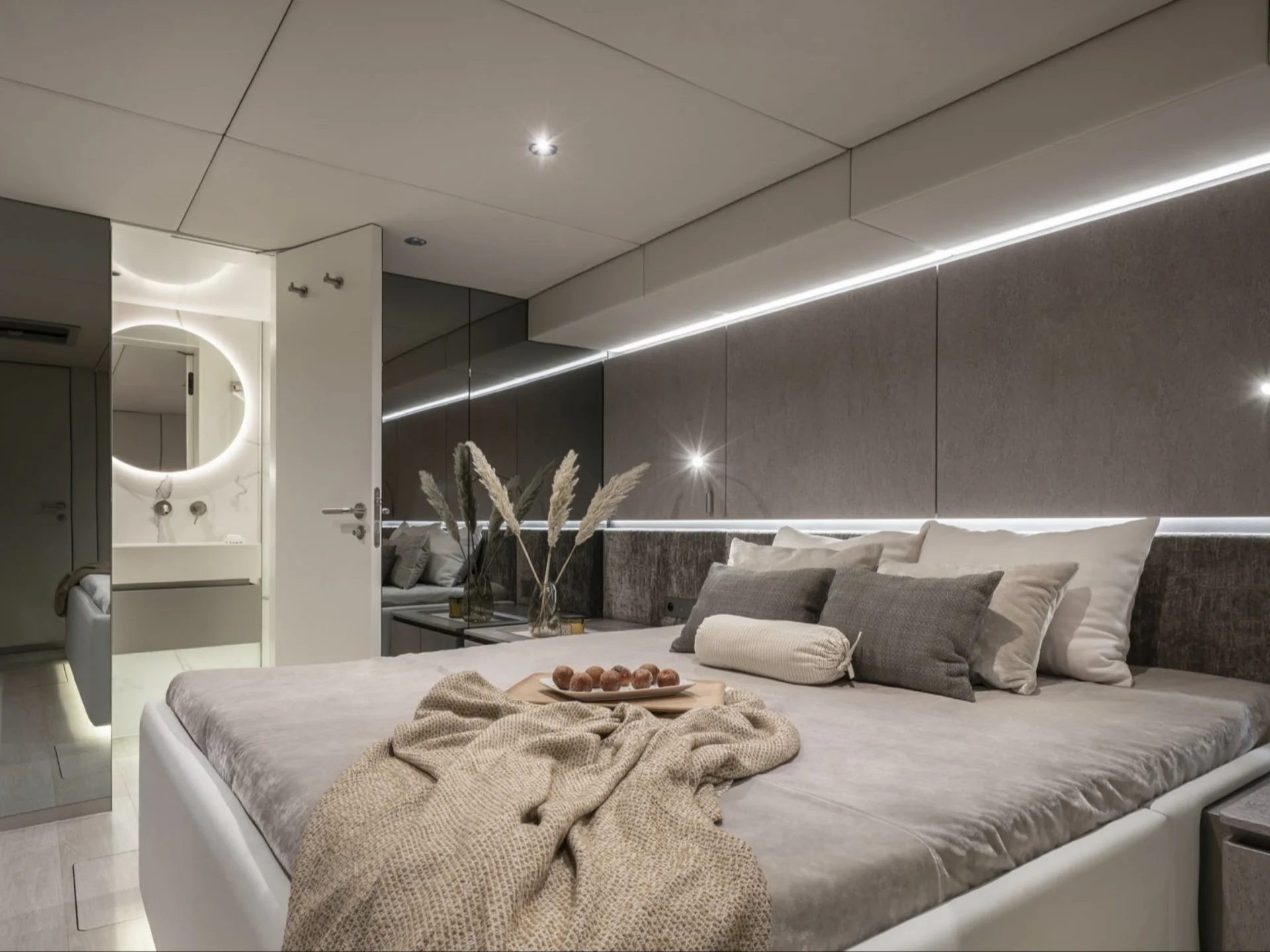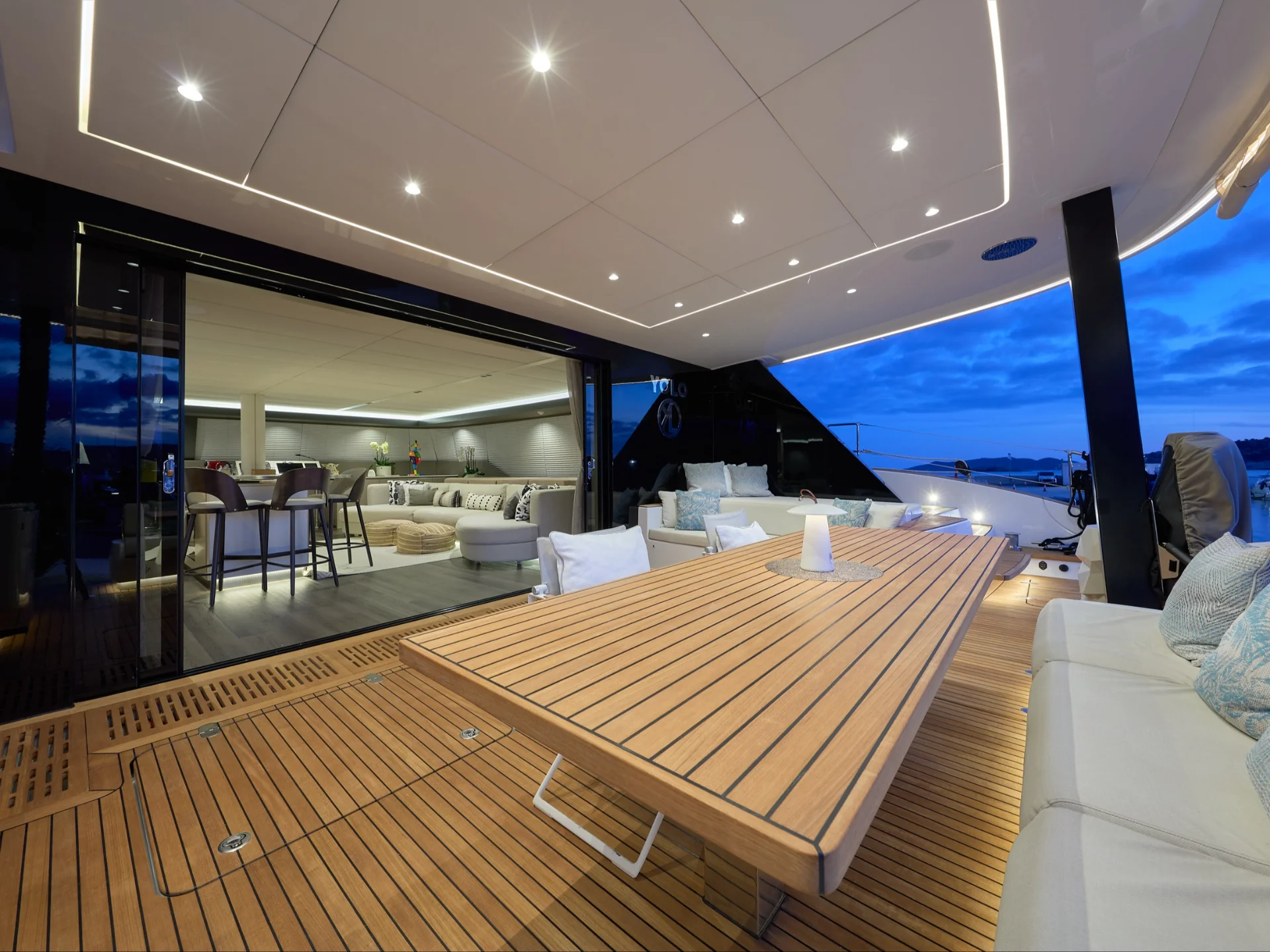 YOLO’s exterior spaces are designed to maximise relaxation and outdoor living. The expansive flybridge features comfortable lounge seating and dining areas with panoramic sea views, creating the perfect setting for alfresco meals or sunset drinks. Guests can unwind on the spacious bow lounge with large sunpads, while the aft cockpit provides shaded seating and dining just steps from the water.