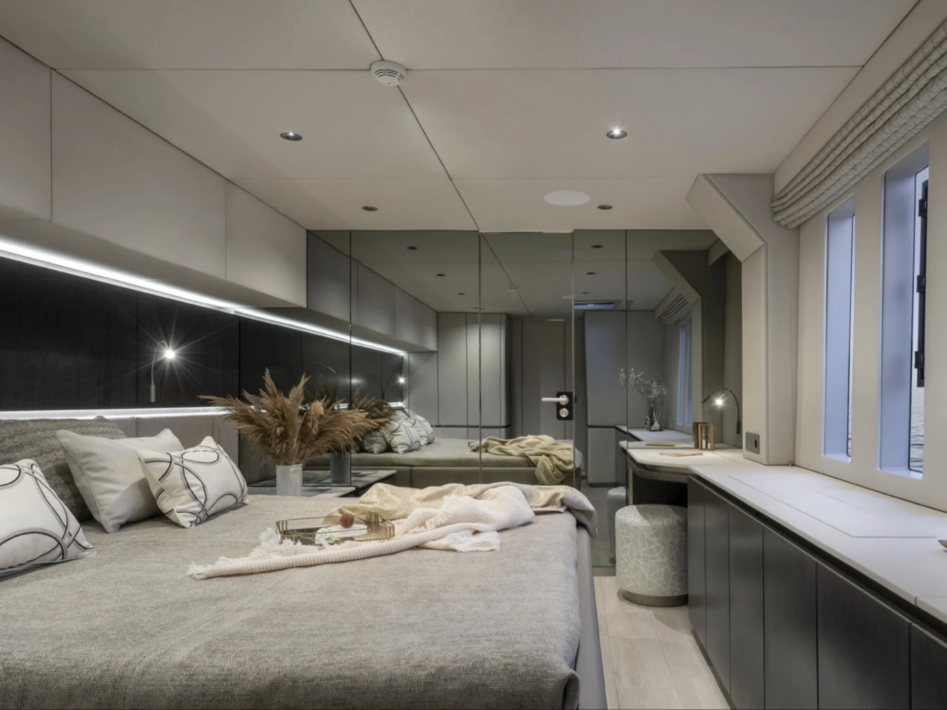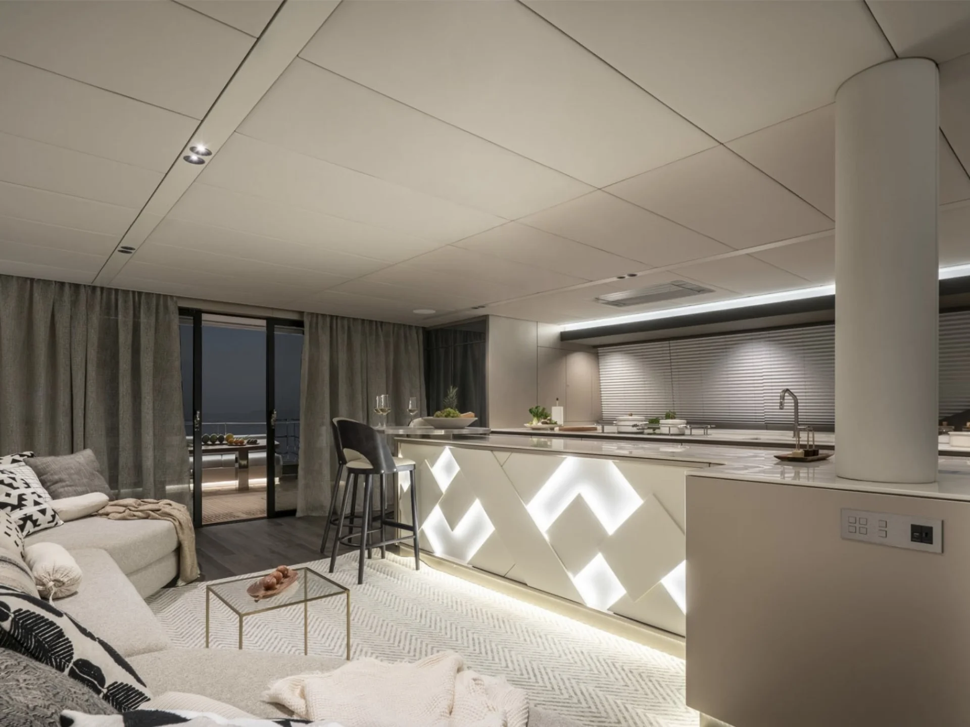 • Large windows in the main salon fill the interior with natural light and ocean views.