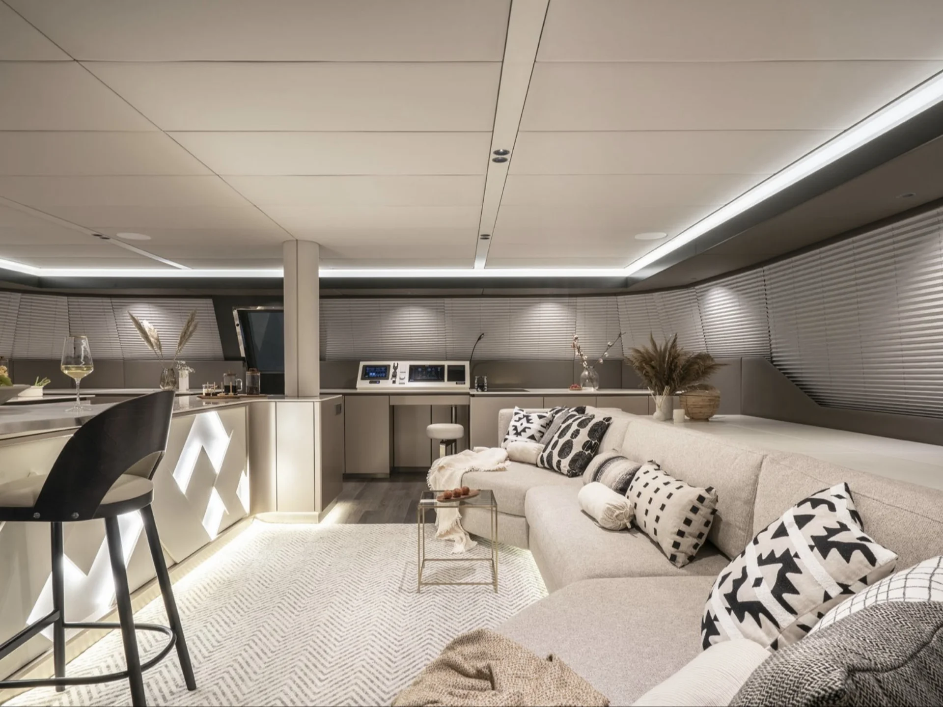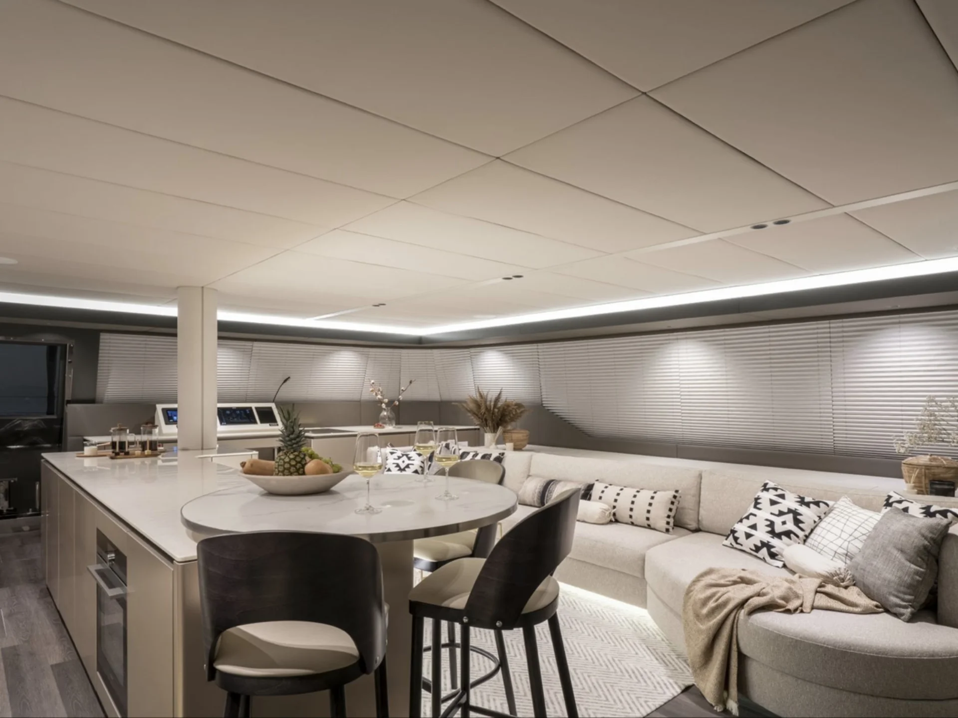 Inside, the open-plan salon is bright and welcoming, with large panoramic windows that fill the space with natural light and uninterrupted ocean views, creating a relaxed atmosphere throughout the yacht.