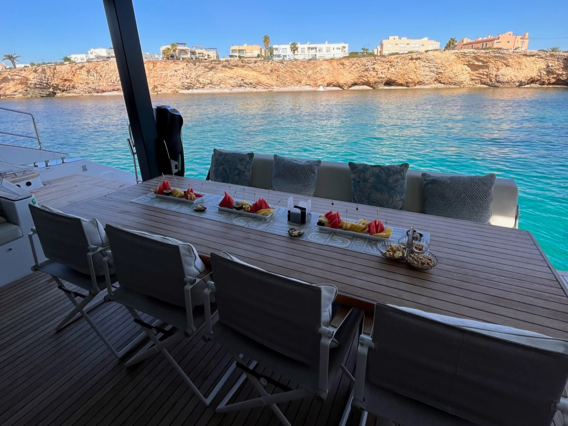 • Guests can relax on the bow sunpads or enjoy shaded seating and dining on the aft deck.