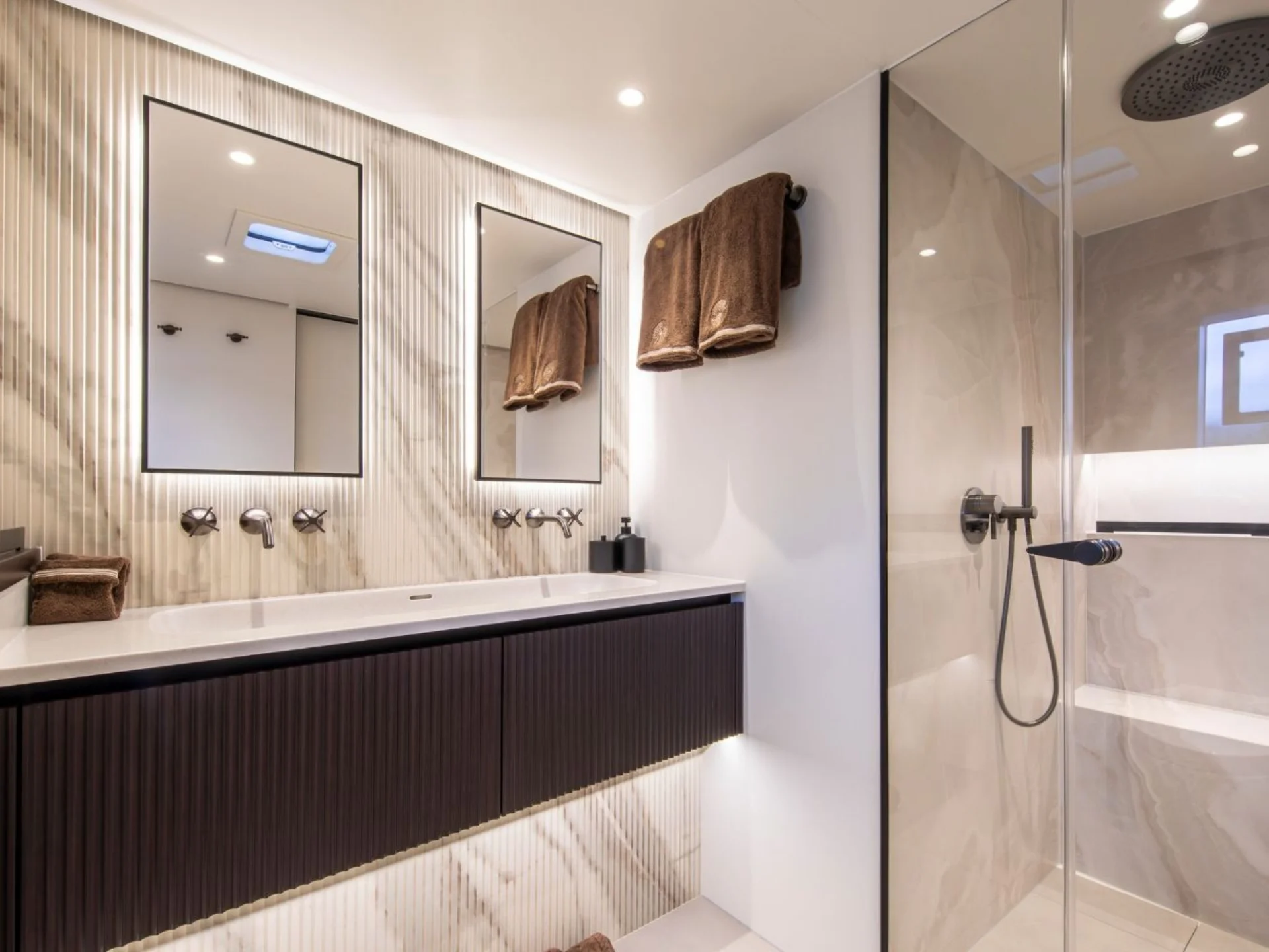 A-PLAN accommodates up to nine guests across four elegantly designed cabins, including a master suite, a VIP cabin, a convertible guest cabin, and a cabin with a bunk bed and single berth. Mirrored panels enhance the sense of space, while ambient lighting ensures each cabin feels calm and inviting. The modern en-suite bathrooms are sleek and stylish, delivering hotel-level comfort on board.