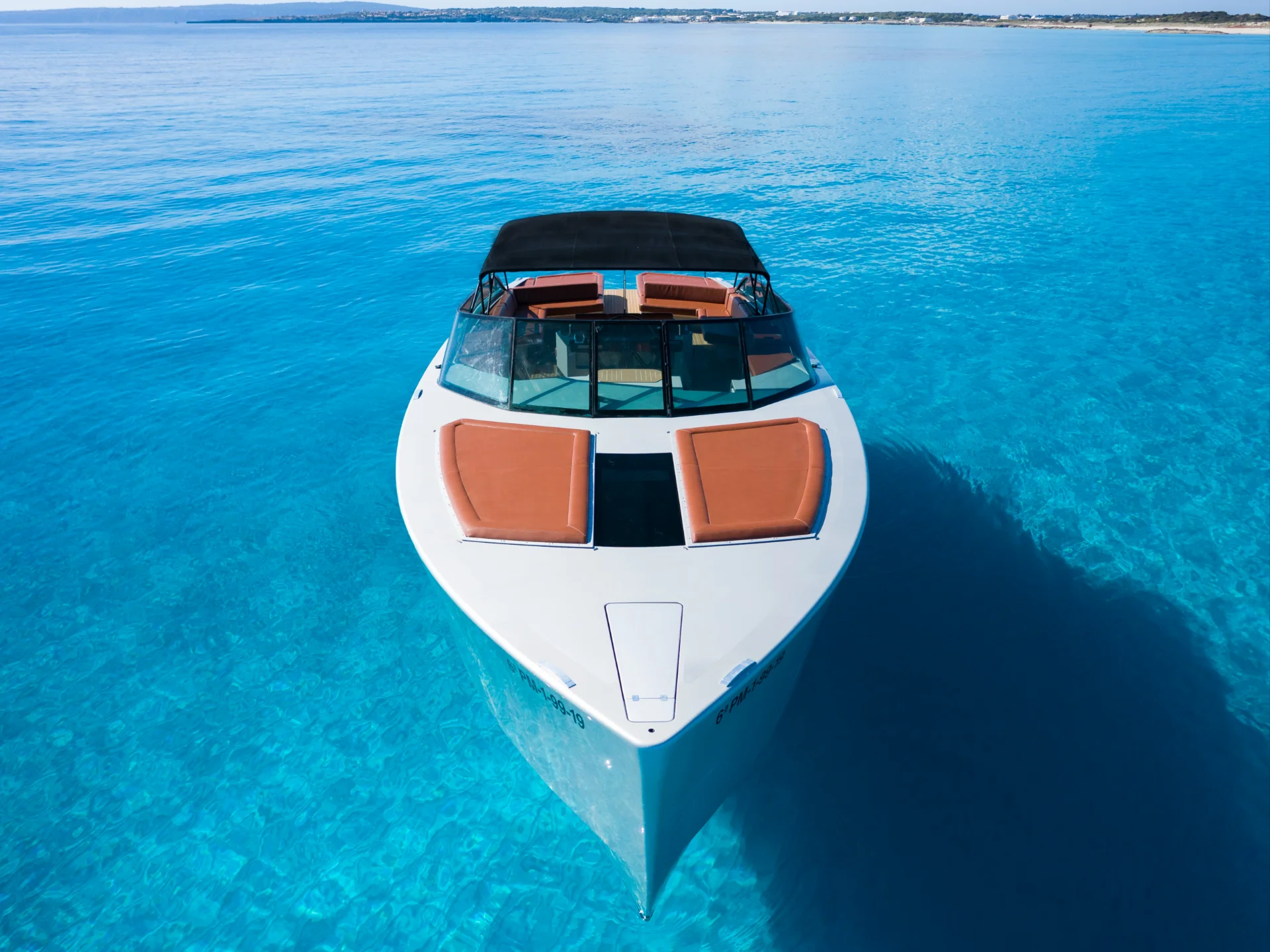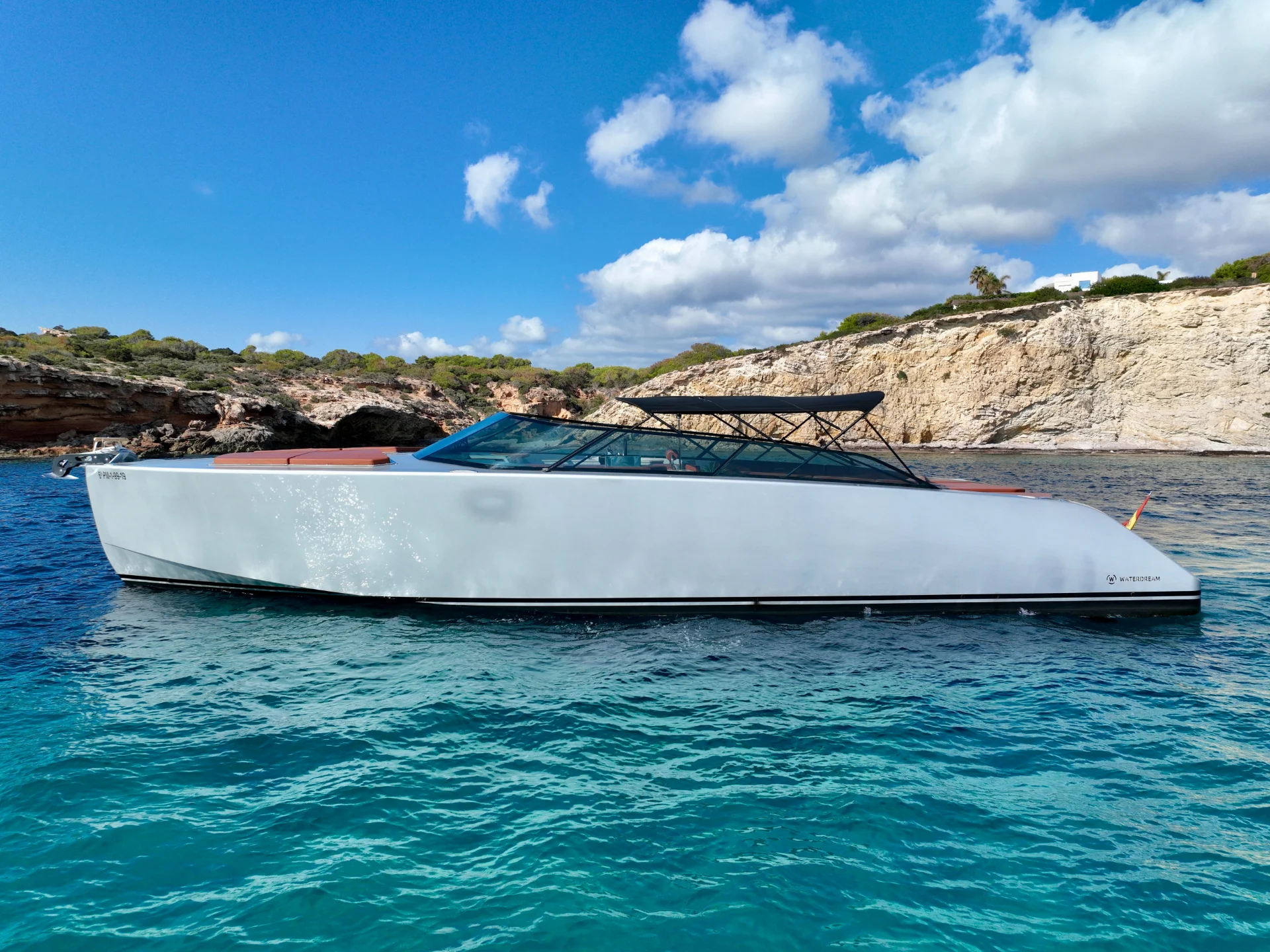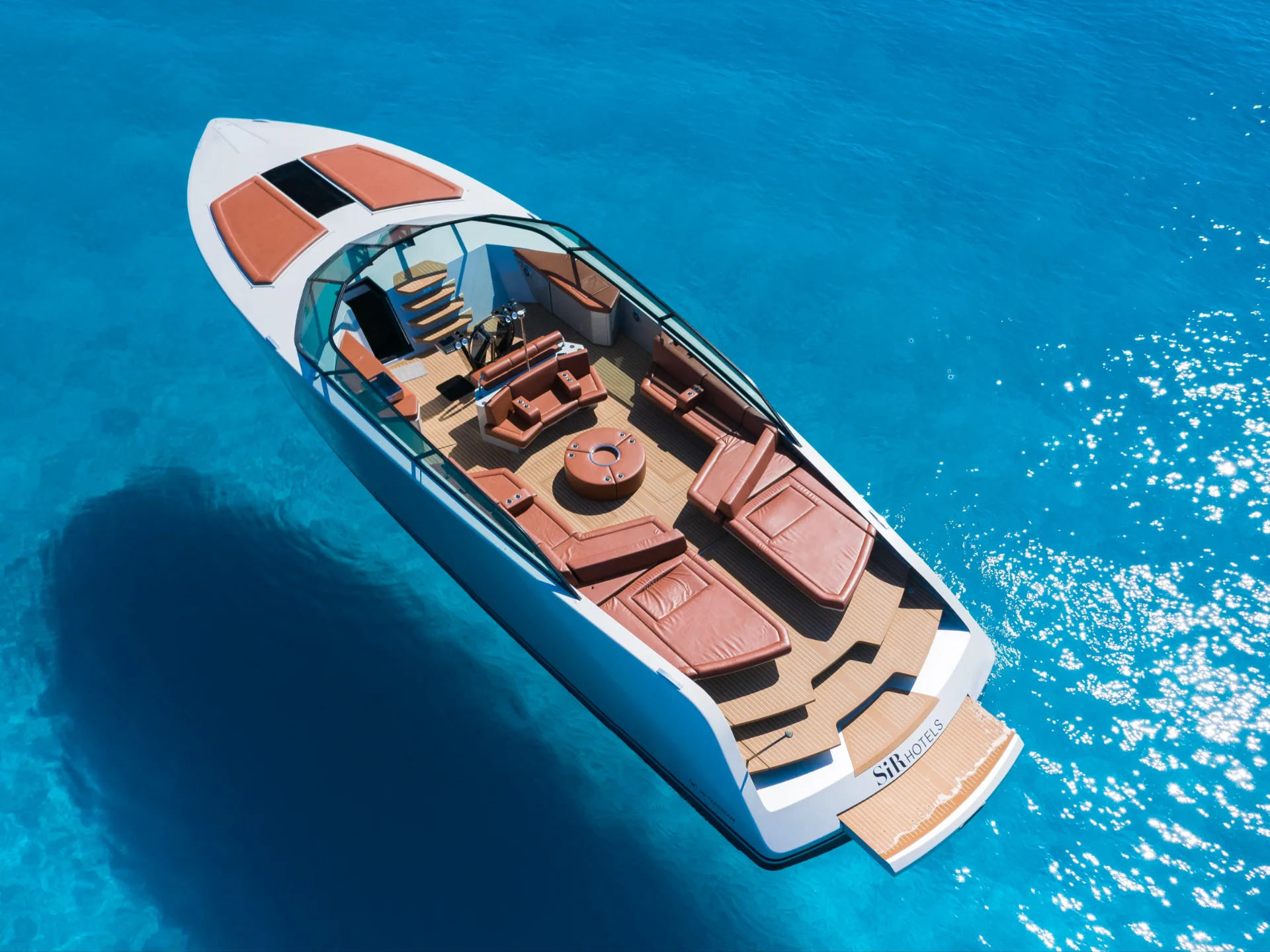 She features an incredible sound system and a huge, open deck with plenty of room for dancing, relaxing, and chatting with friends. This yacht is the perfect choice for large groups who want to arrive at their destination in style and enjoy their day to the fullest. On board, guests enjoy a premium drinks package, linen and towels, and full insurance coverage.