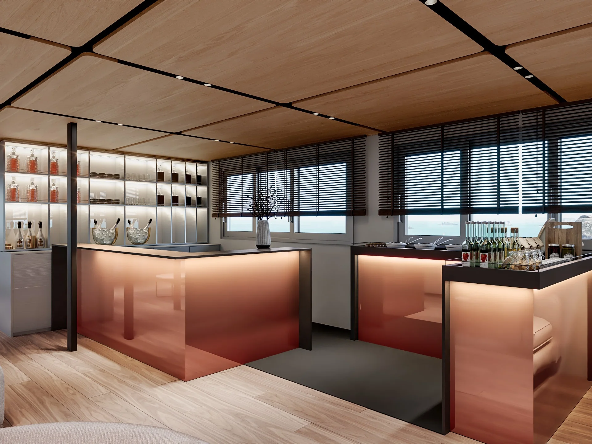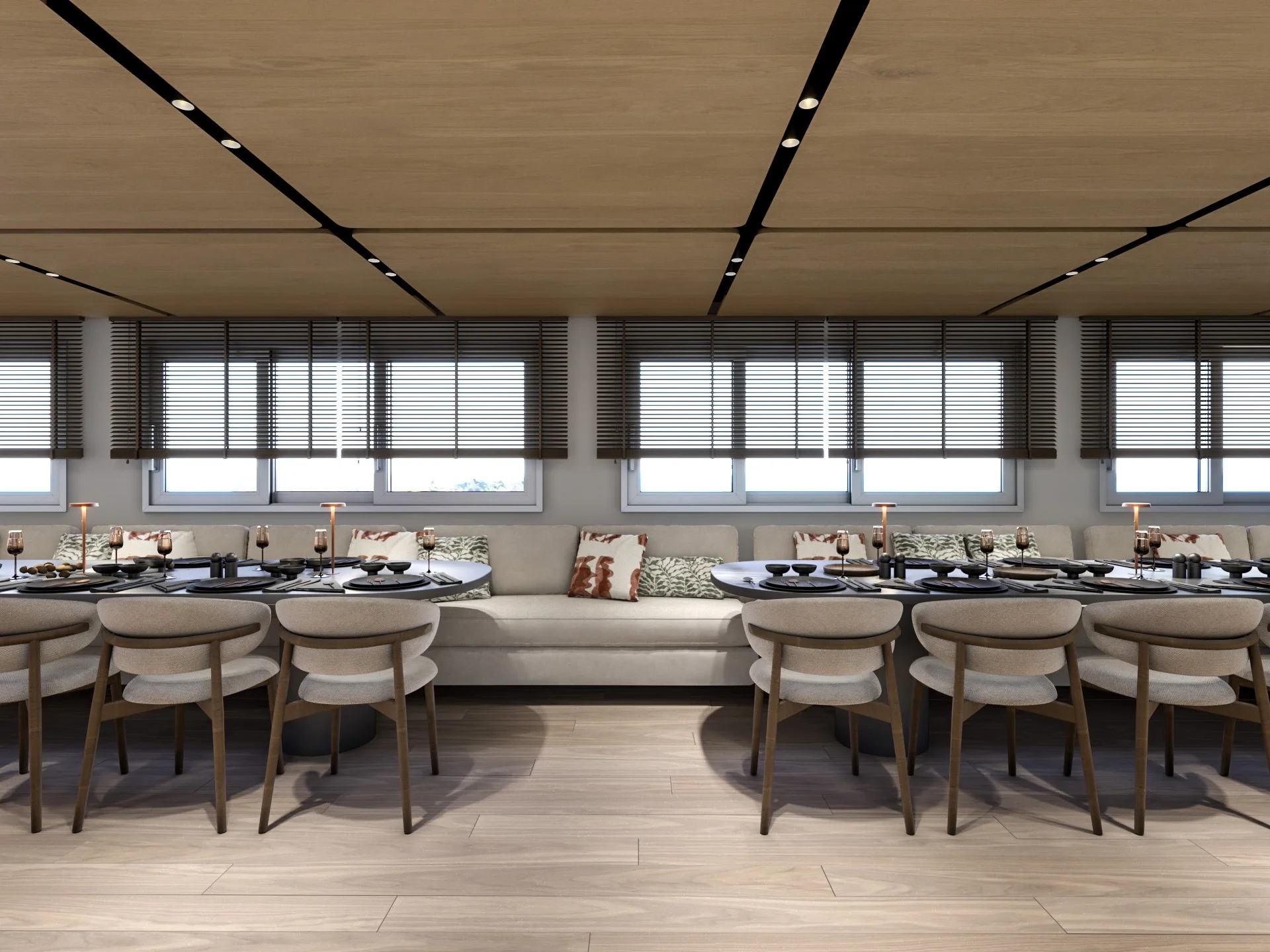 In perfect balance, Premier’s interior offers a bright, modern atmosphere with clean lines and minimalistic design. The spacious main deck salon provides comfortable seating and an elegant dining area, enhanced by large windows that flood the space with natural light. Thoughtfully designed interiors and calming tones create a welcoming environment where guests can relax, dine, and enjoy time together in complete comfort.