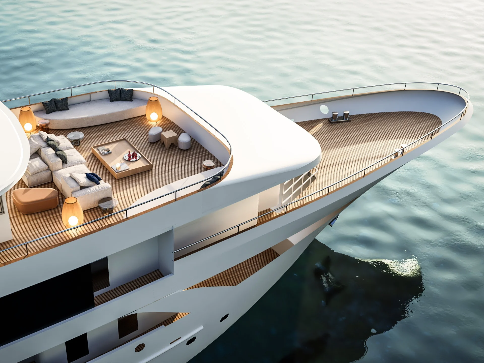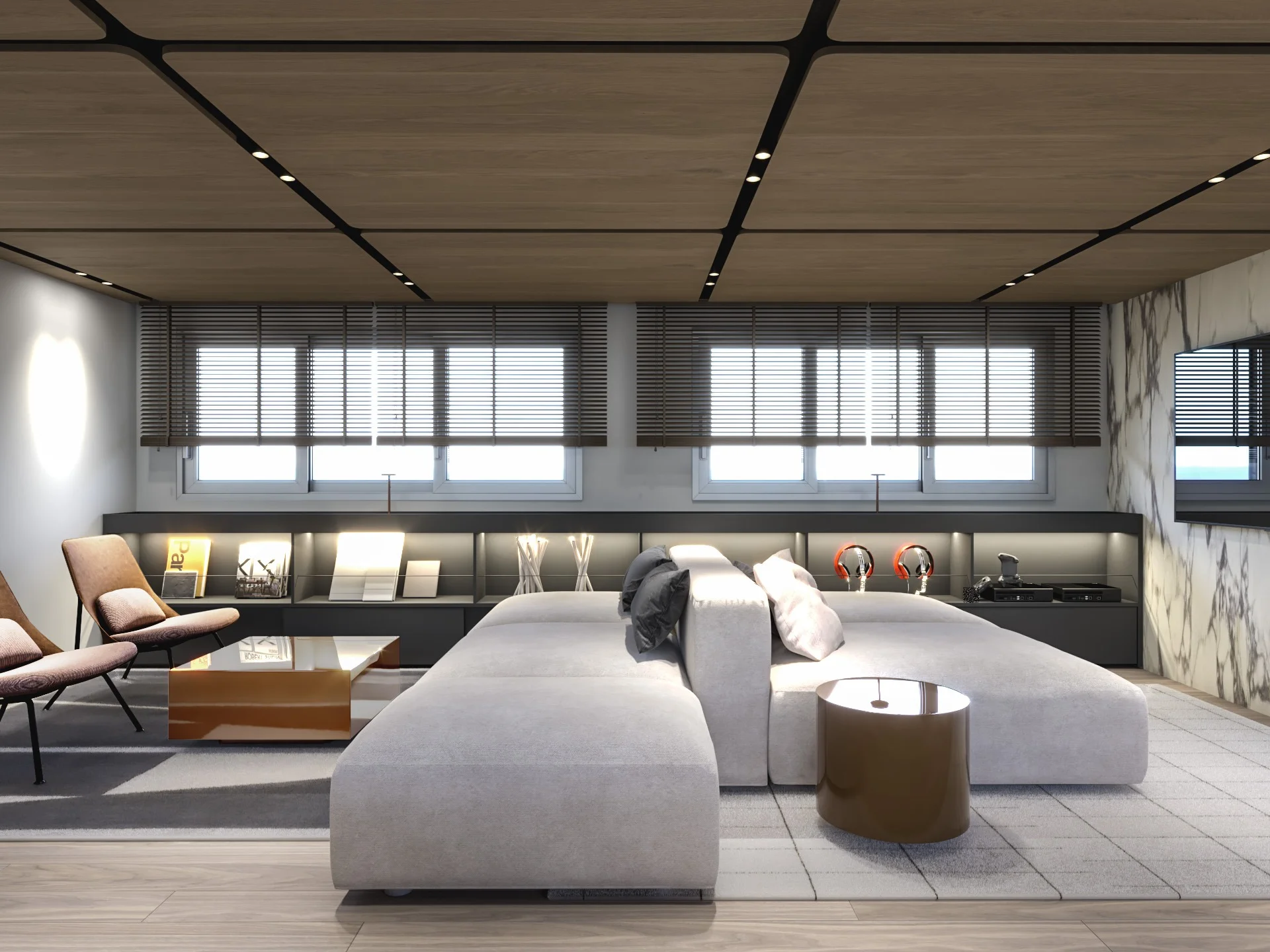 Her exterior spaces are designed for effortless enjoyment, offering generous volume and multiple areas to relax and socialise. The expansive sundeck is a true highlight, featuring a jacuzzi, lounge areas, sauna, and a private open-air cinema, perfect for unwinding with panoramic sea views. Guests can enjoy seamless indoor-outdoor living, with the main deck salon opening directly onto the aft deck and swim platform, creating an inviting space for sunbathing, dining, and easy access to the sea.