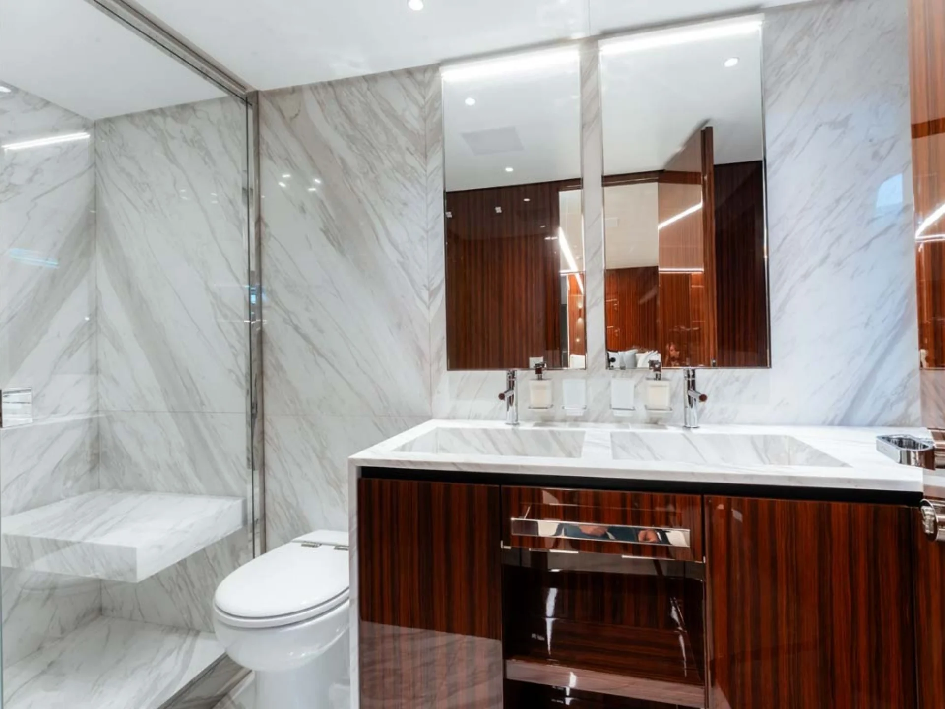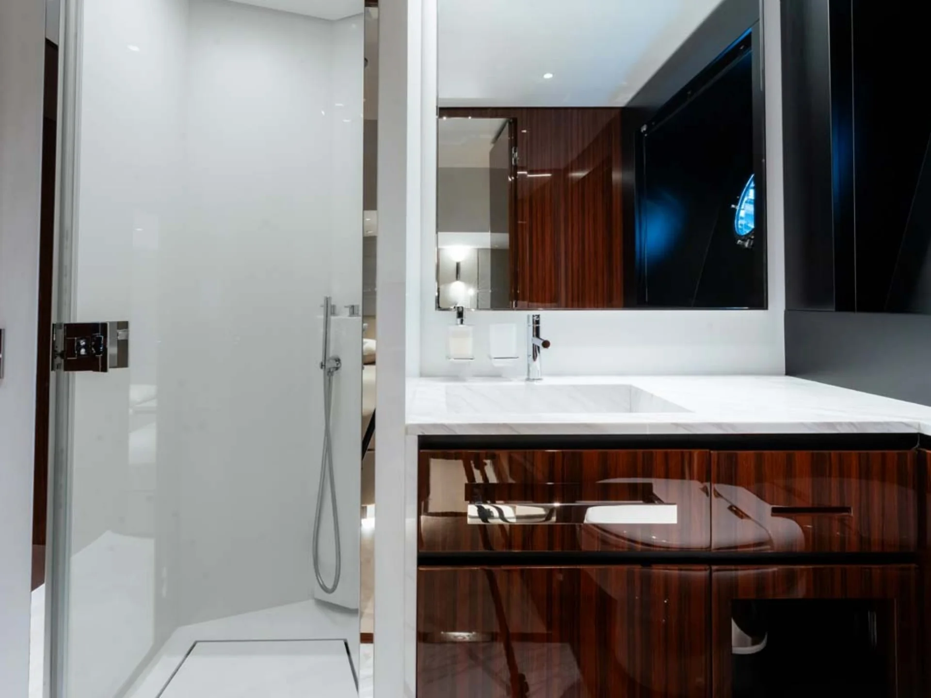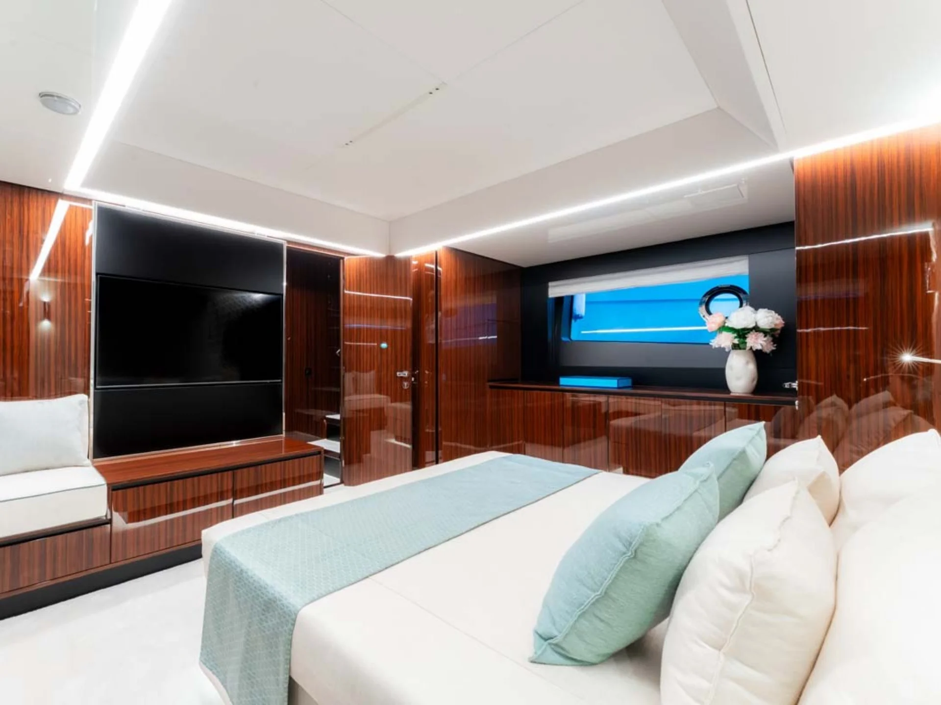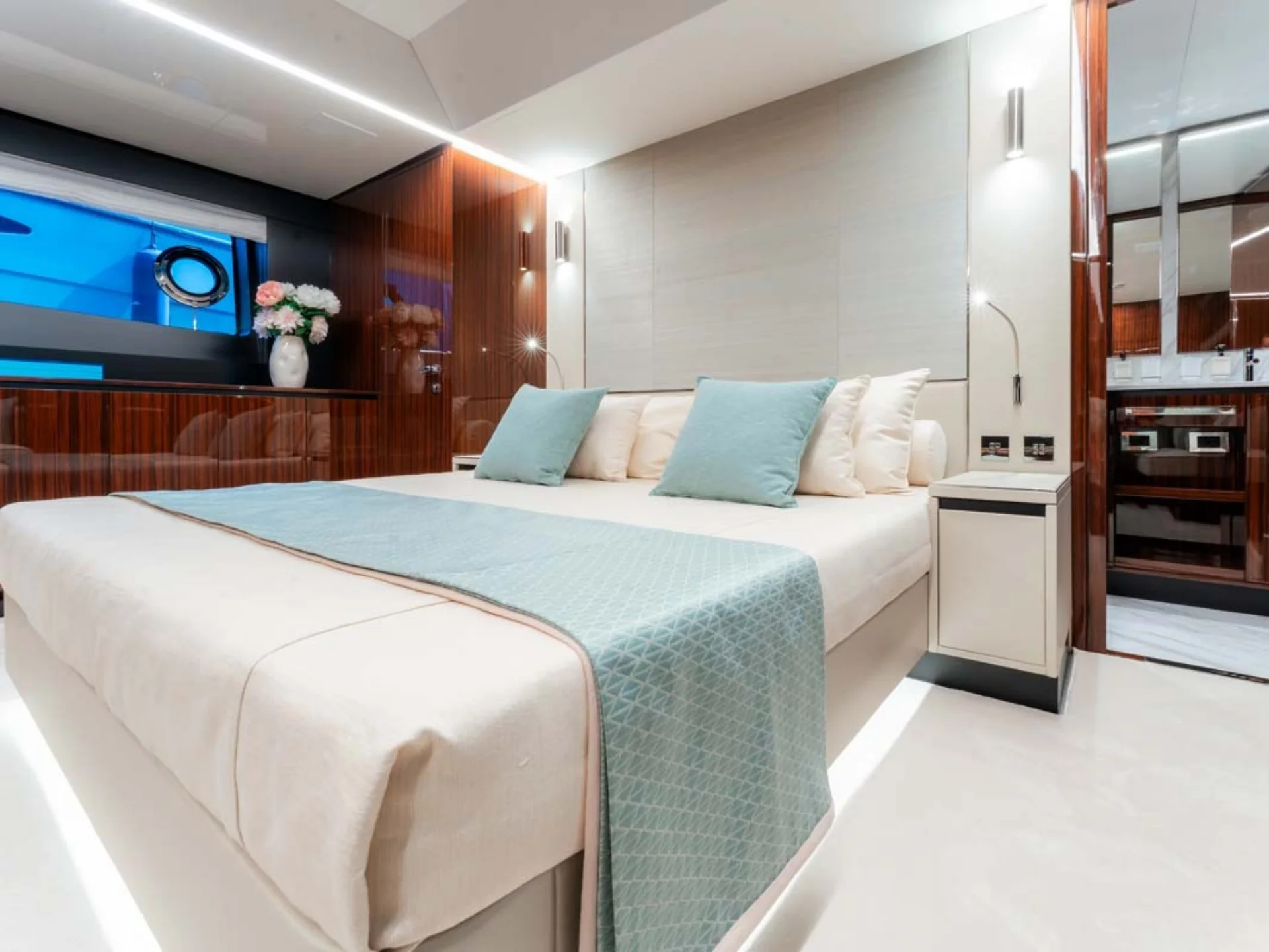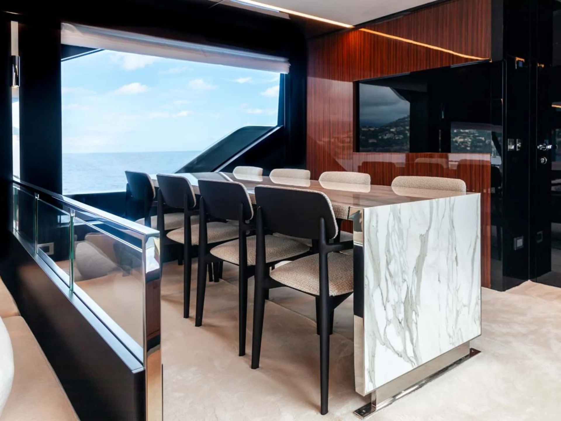 Step aboard L’AS BLEU, the brand-new Riva 82’ Diva (2025), an exceptional embodiment of Italian style and modern yacht design. Her standout beach club with two folding terraces creates a true sea-level lounge, while the expansive 40m² flybridge offers dedicated areas for dining, sunbathing, and entertaining.