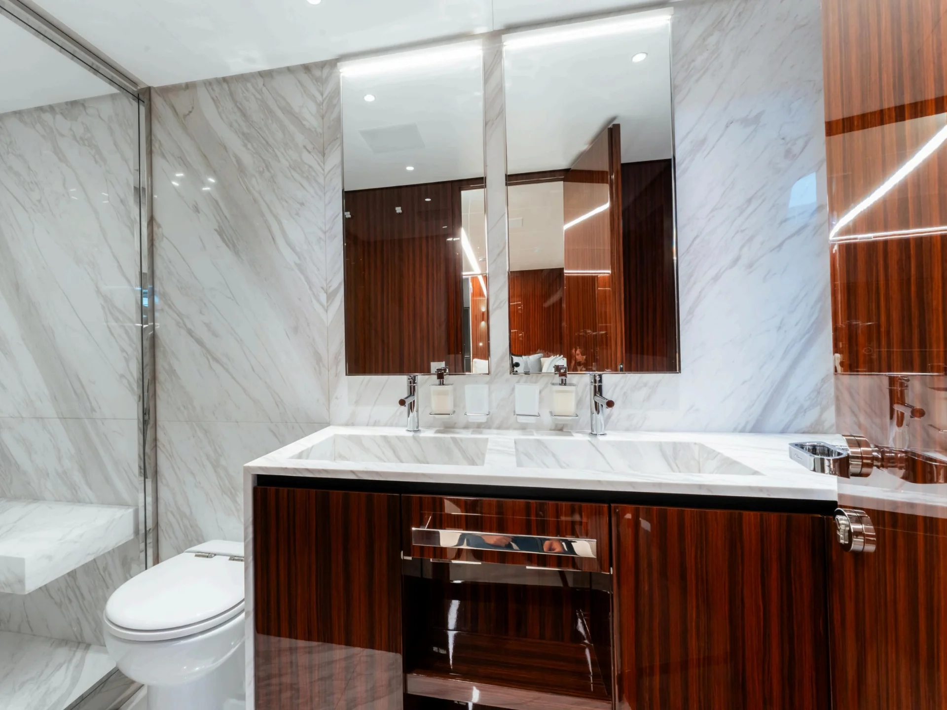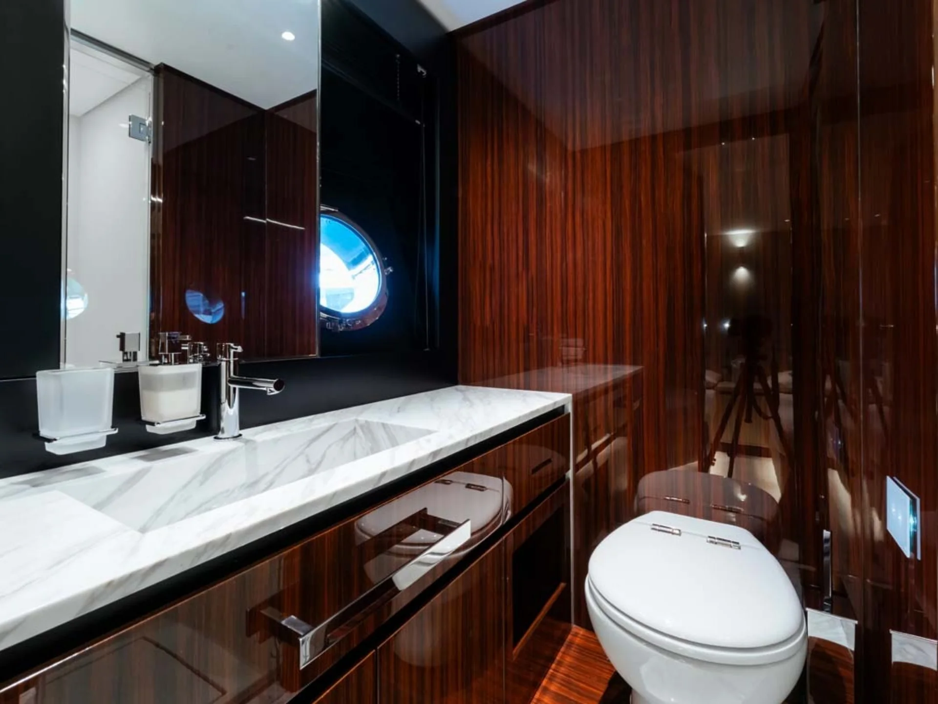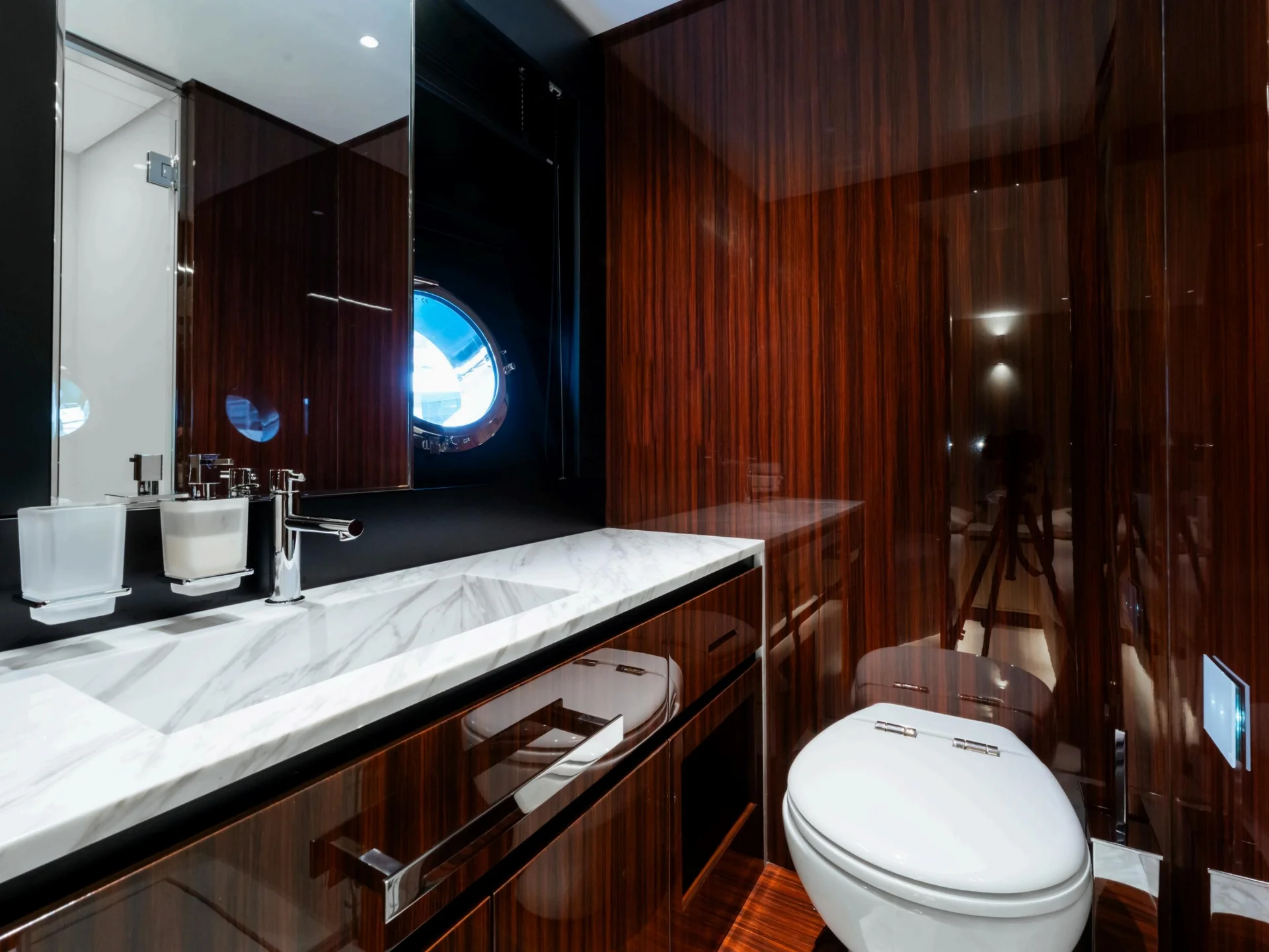 • Expansive 40m² flybridge with sunbathing, dining, bar and lounge areas.