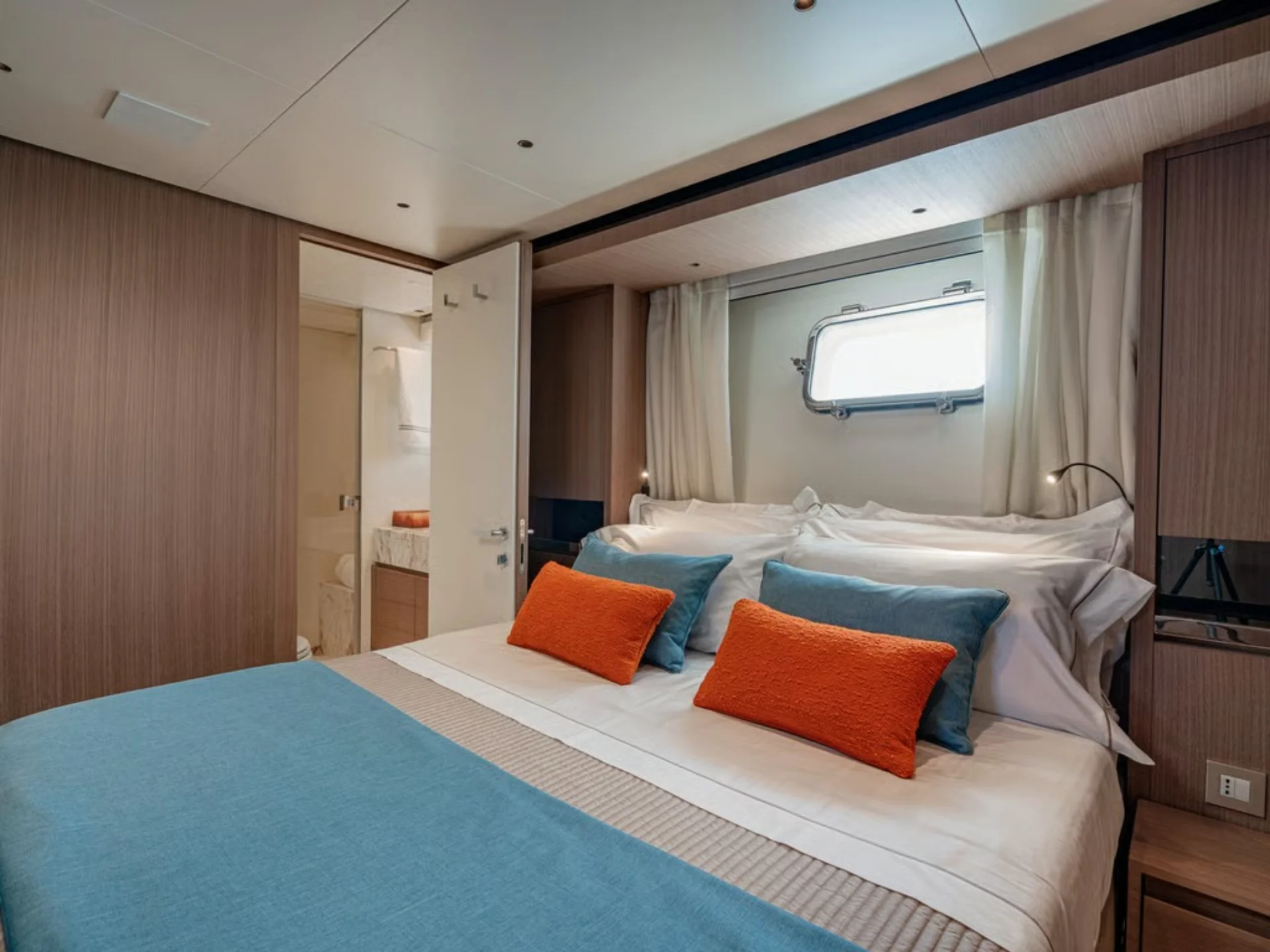 Her interior reflects understated elegance and functionality, with contemporary finishes and natural light throughout. The main salon offers a welcoming lounge area and indoor dining space, while large windows enhance the connection to the surrounding seascape. Accommodation is provided for up to eight guests in four beautifully appointed cabins, including a full-beam master suite on the main deck, two VIP cabins, and a twin guest cabin, all with en-suite bathrooms. Stabilisation systems both underway and at anchor ensure a smooth and comfortable experience at all times.