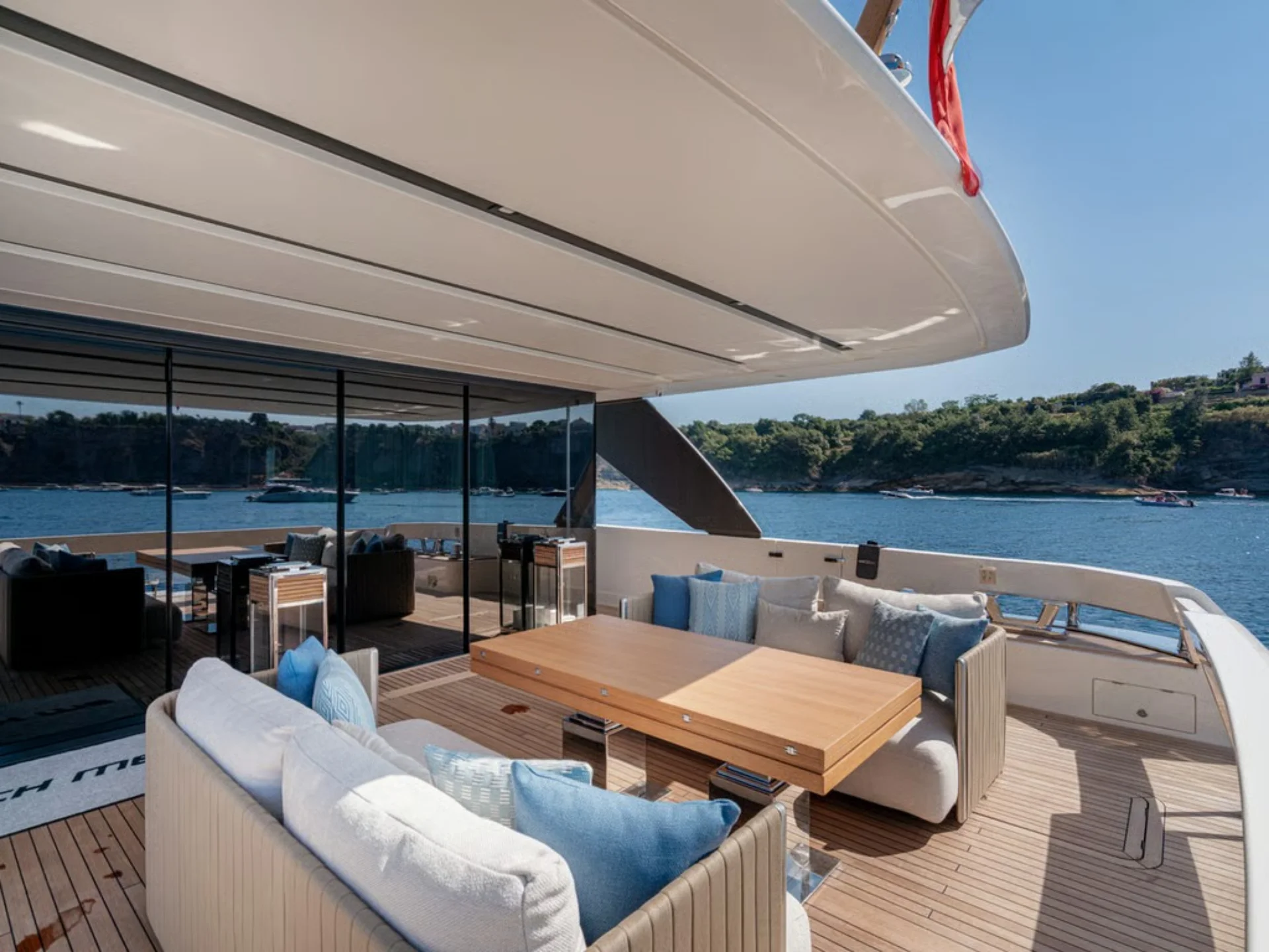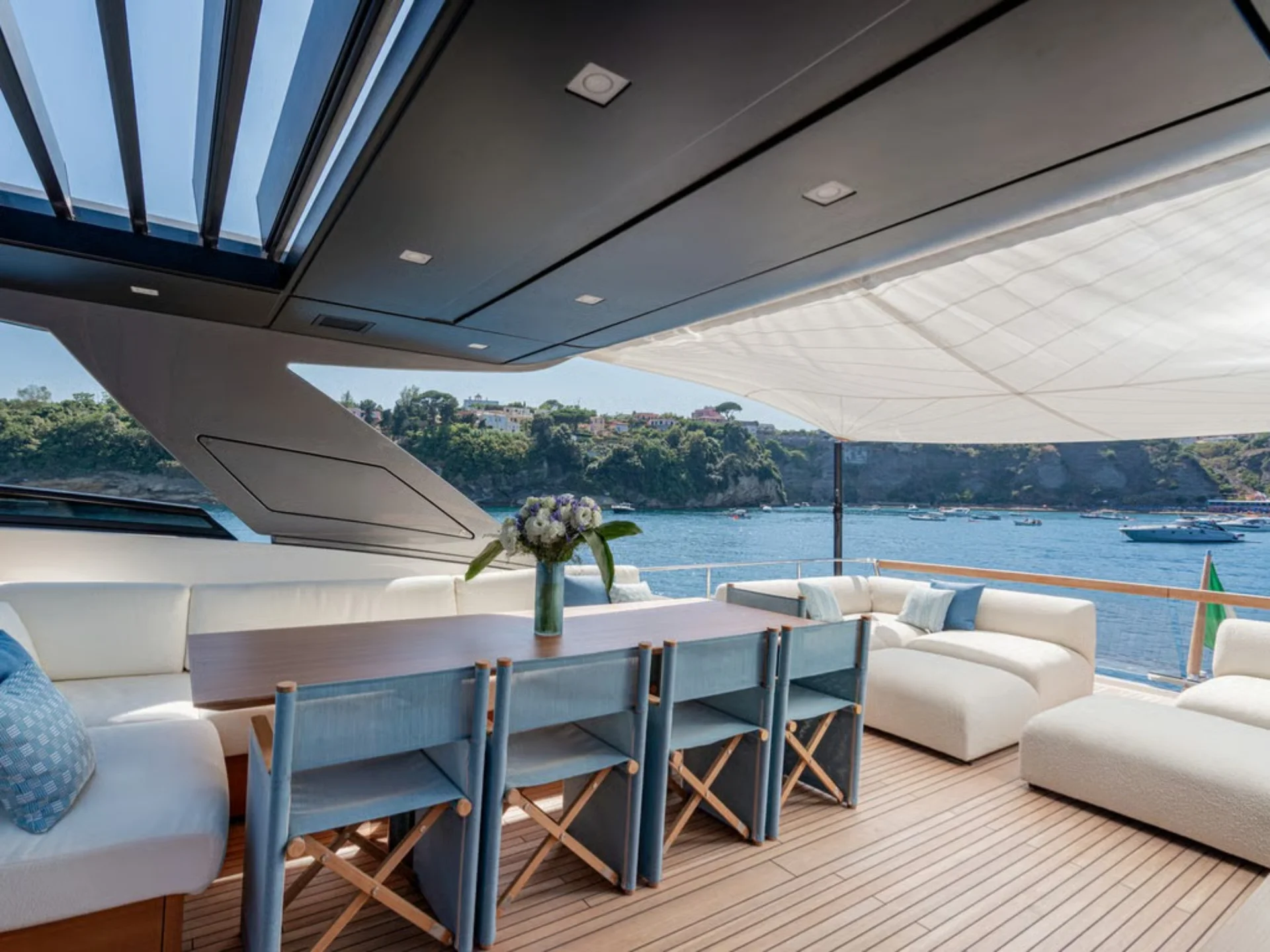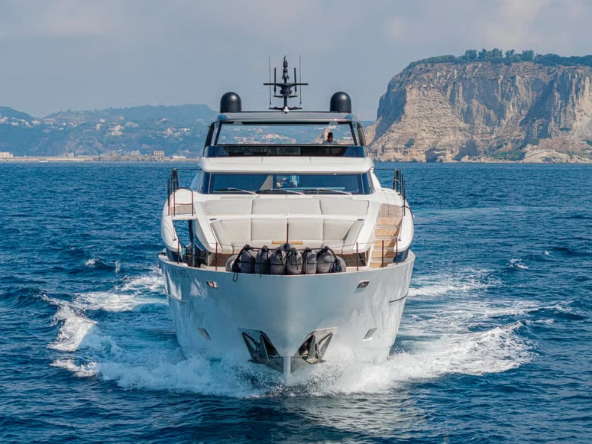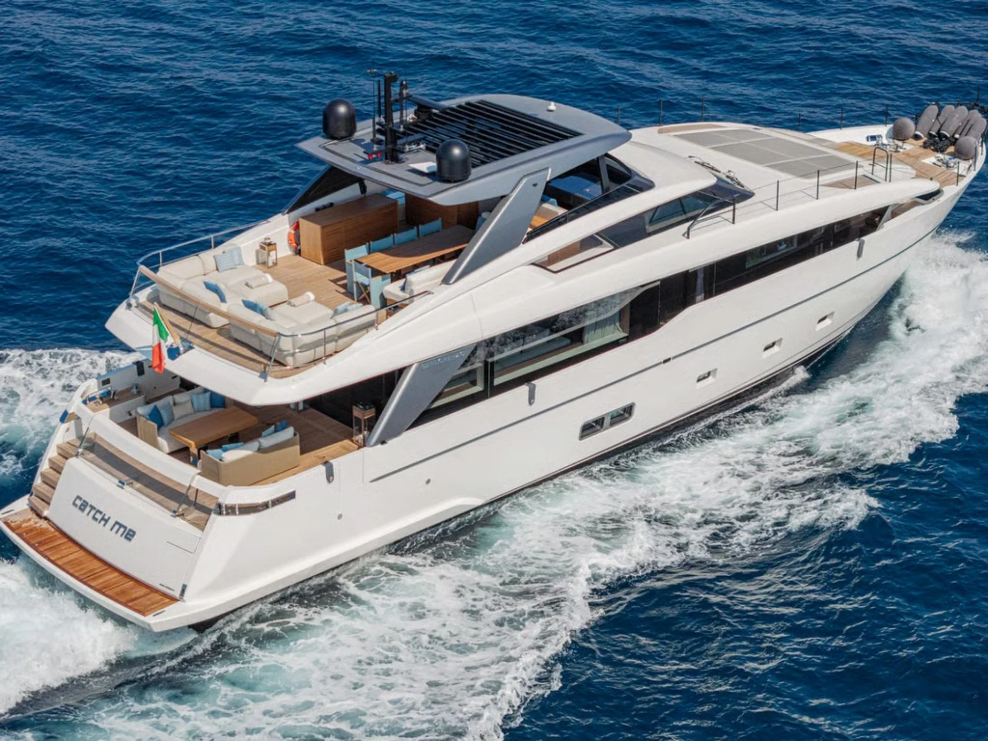 - Sleek flybridge layout with generous sunbathing and outdoor social areas