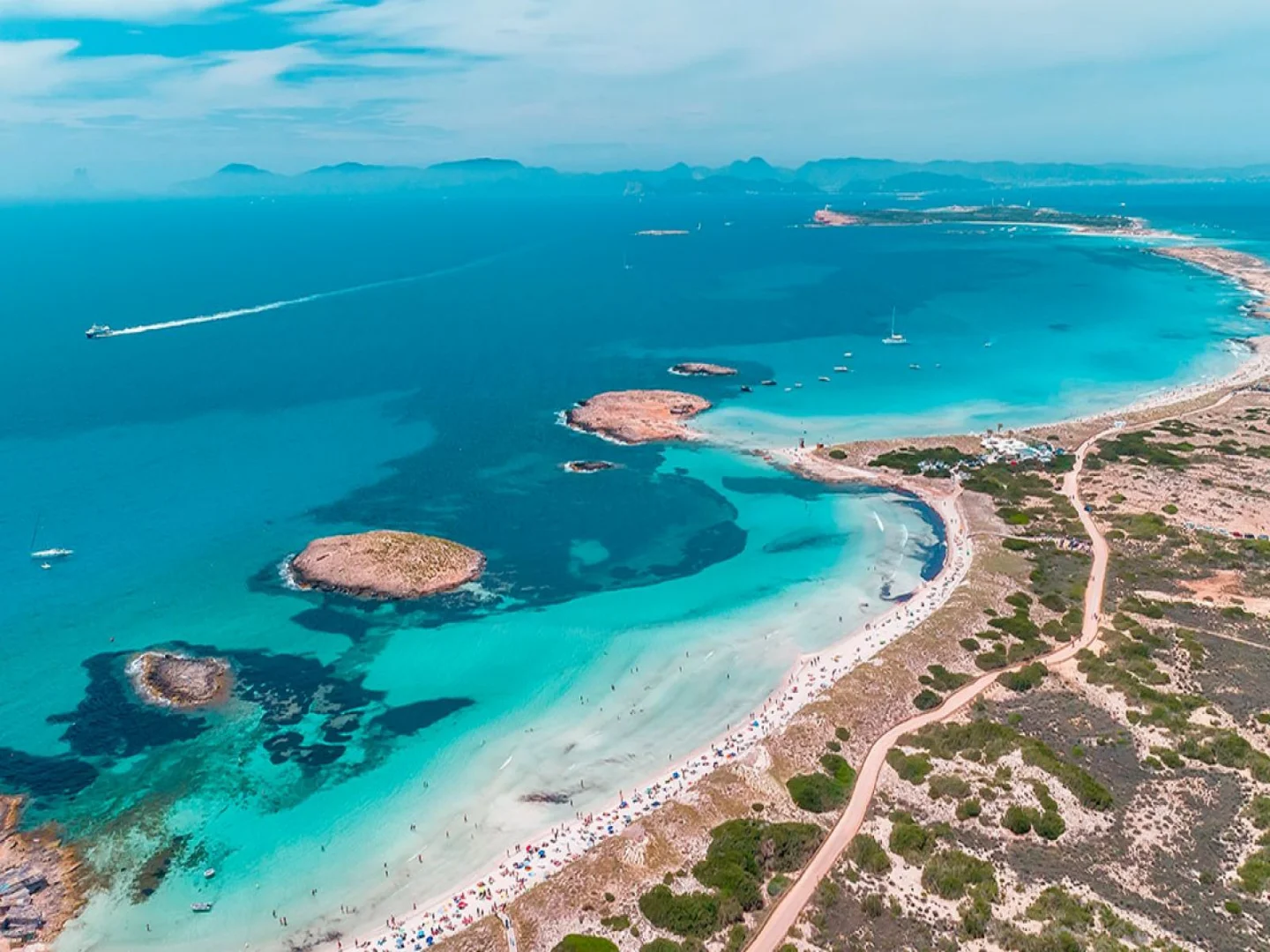 Cruise eastward toward Las Salinas Beach, a long, flat stretch of soft white sand famous for its music-filled beach bars and easygoing crowd. Spend a lively afternoon between the waves and beach clubs like Jockey Club or Sa Trinxa, where the mojitos flow freely and the playlists never disappoint.