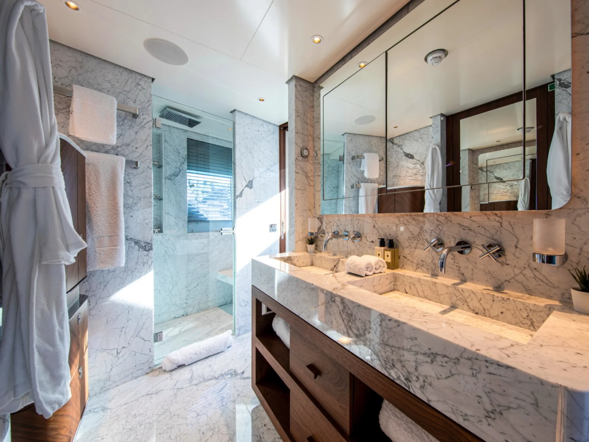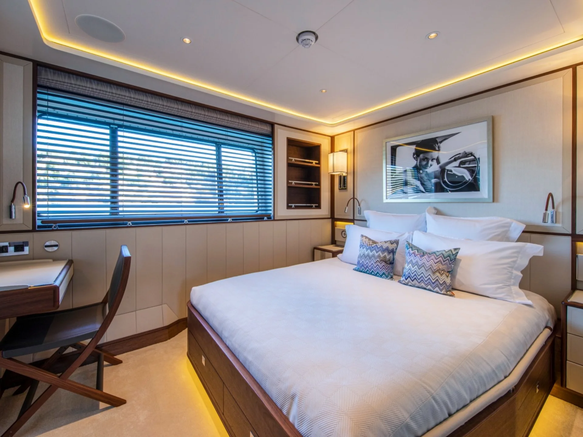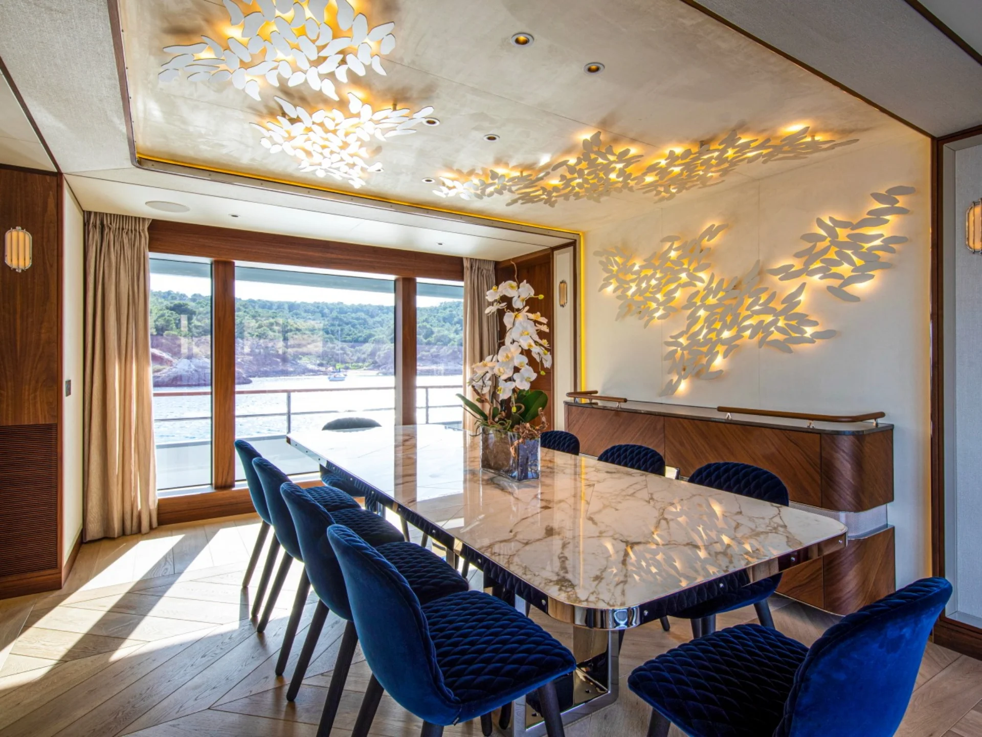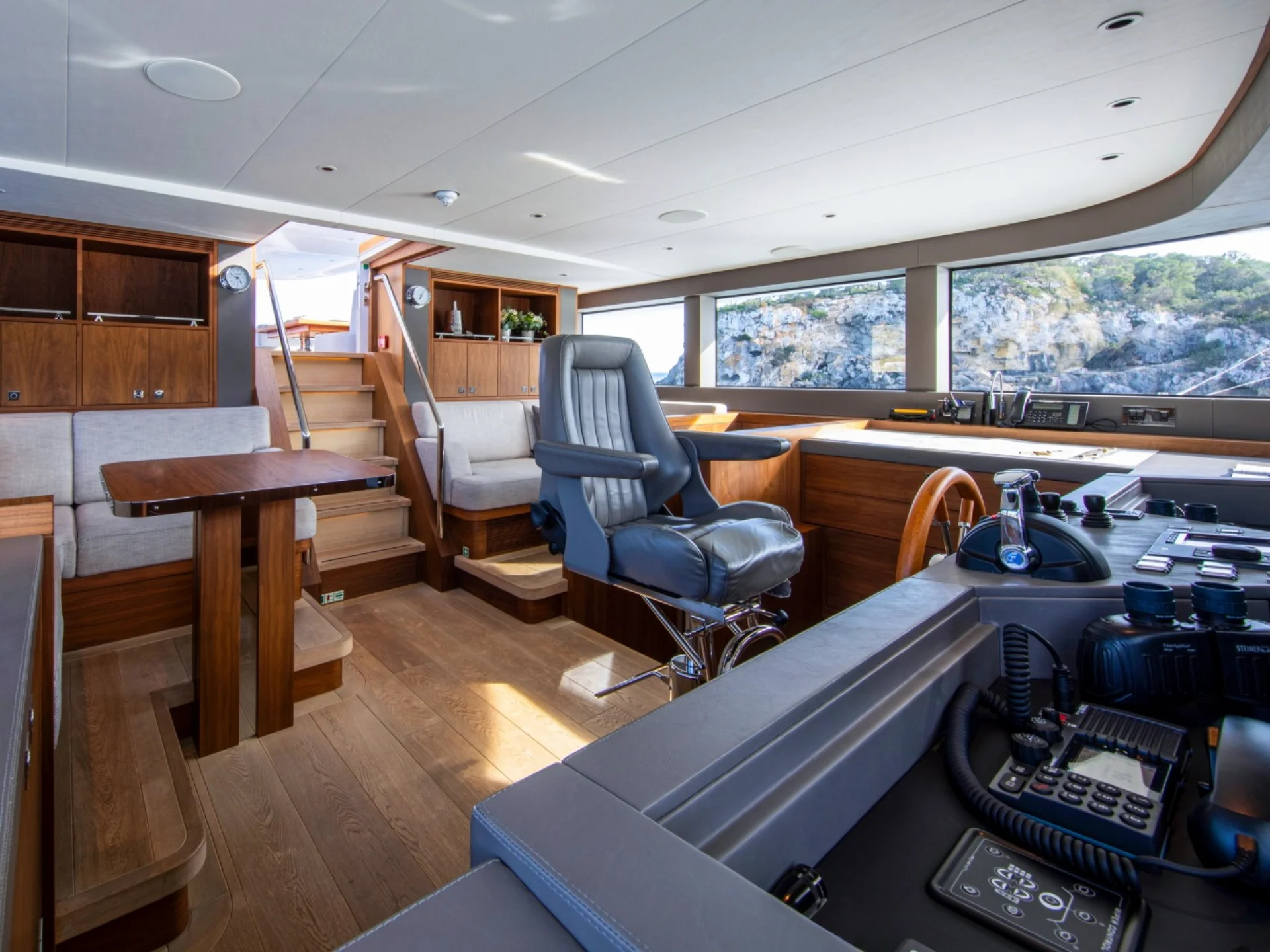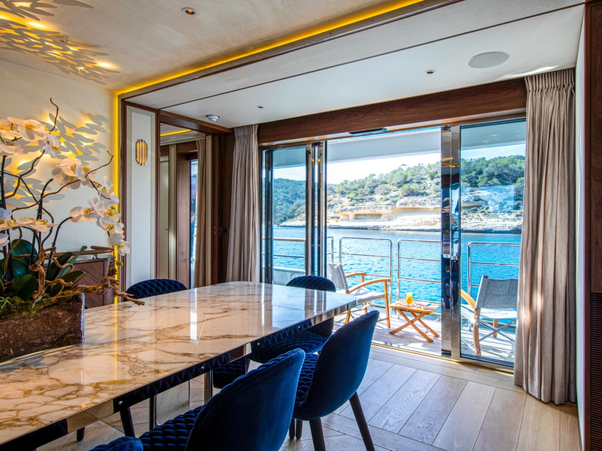 In perfect balance, the interior offers a bright and spacious atmosphere with a refined, contemporary design. The main salon features comfortable seating and an indoor dining area, enhanced by large windows that flood the space with natural light and offer panoramic sea views. Thoughtfully designed living areas create a welcoming environment for relaxing, dining, and spending time together on board.