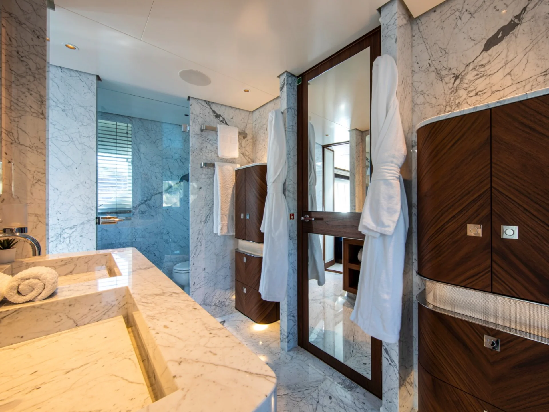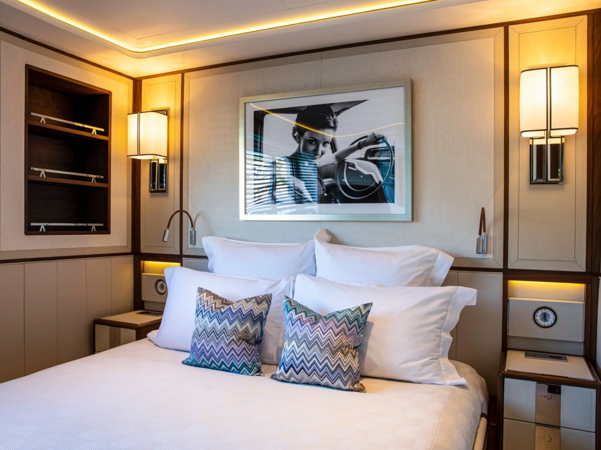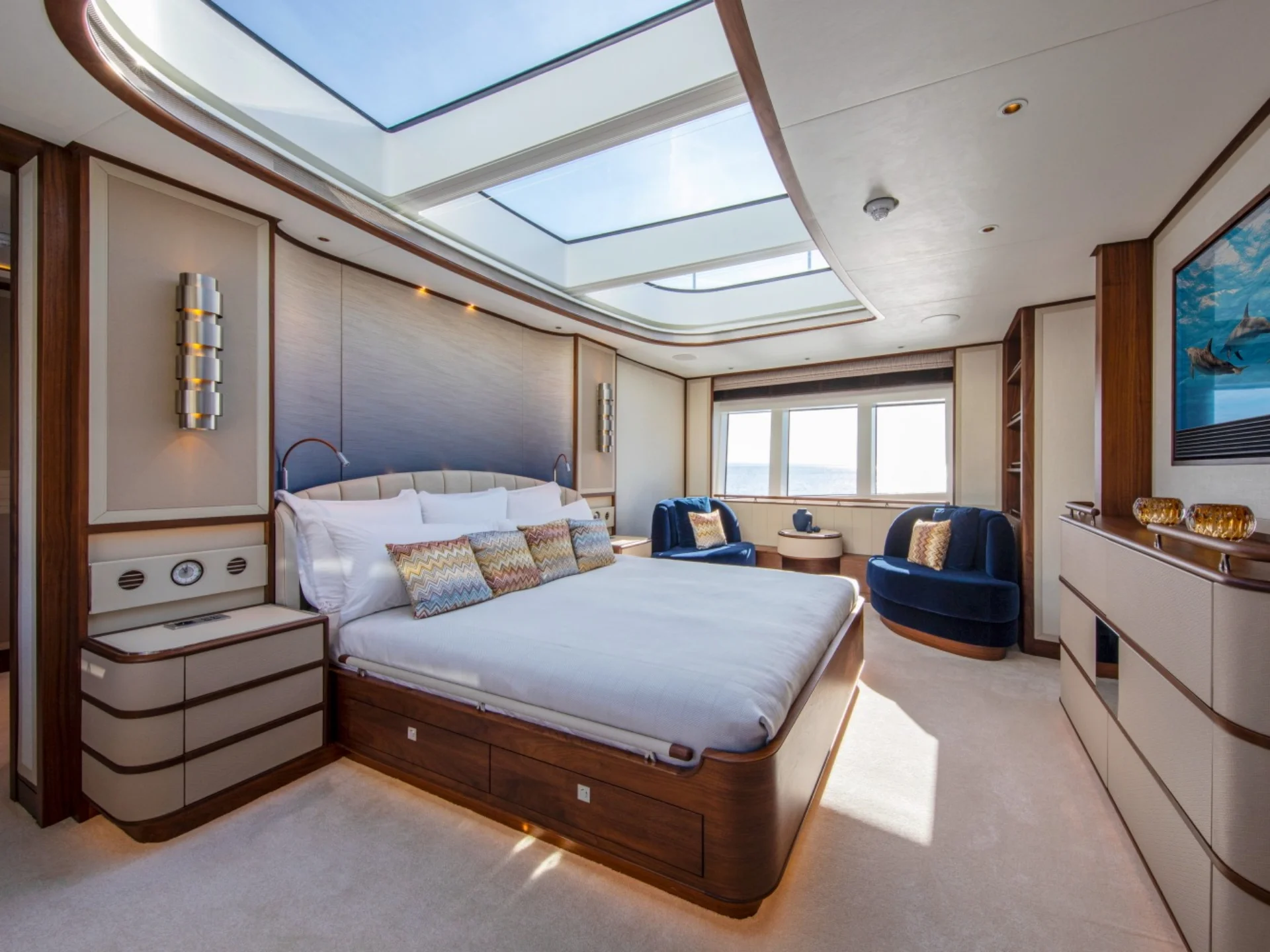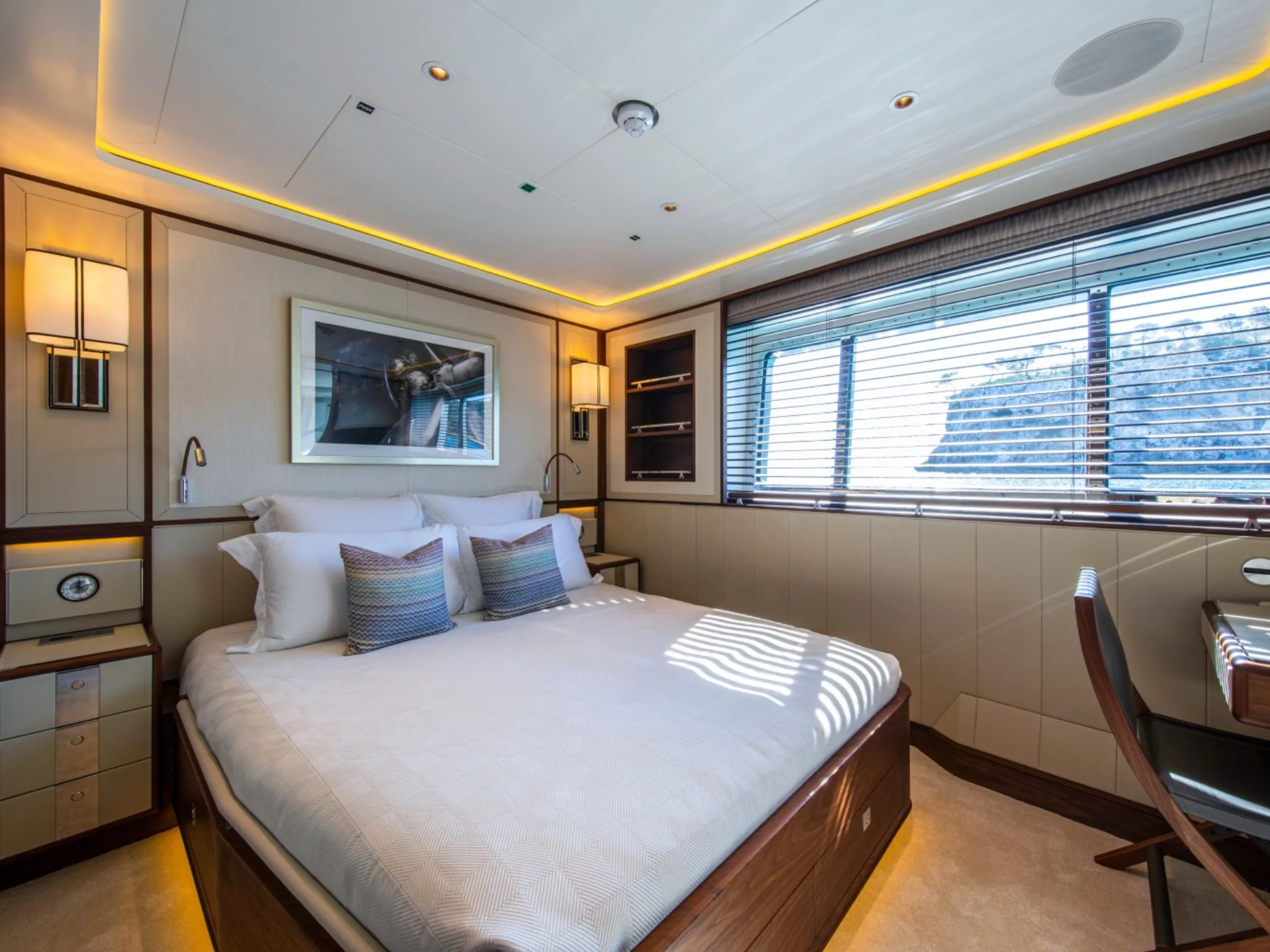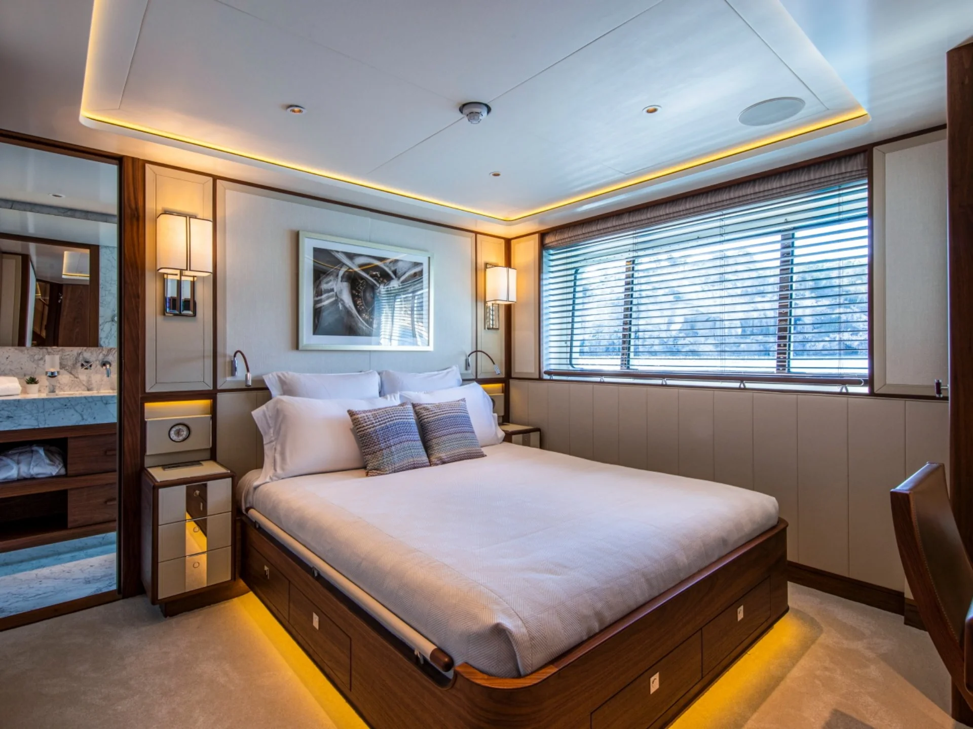In perfect balance, the interior offers a bright and spacious atmosphere with a refined, contemporary design. The main salon features comfortable seating and an indoor dining area, enhanced by large windows that flood the space with natural light and offer panoramic sea views. Thoughtfully designed living areas create a welcoming environment for relaxing, dining, and spending time together on board.