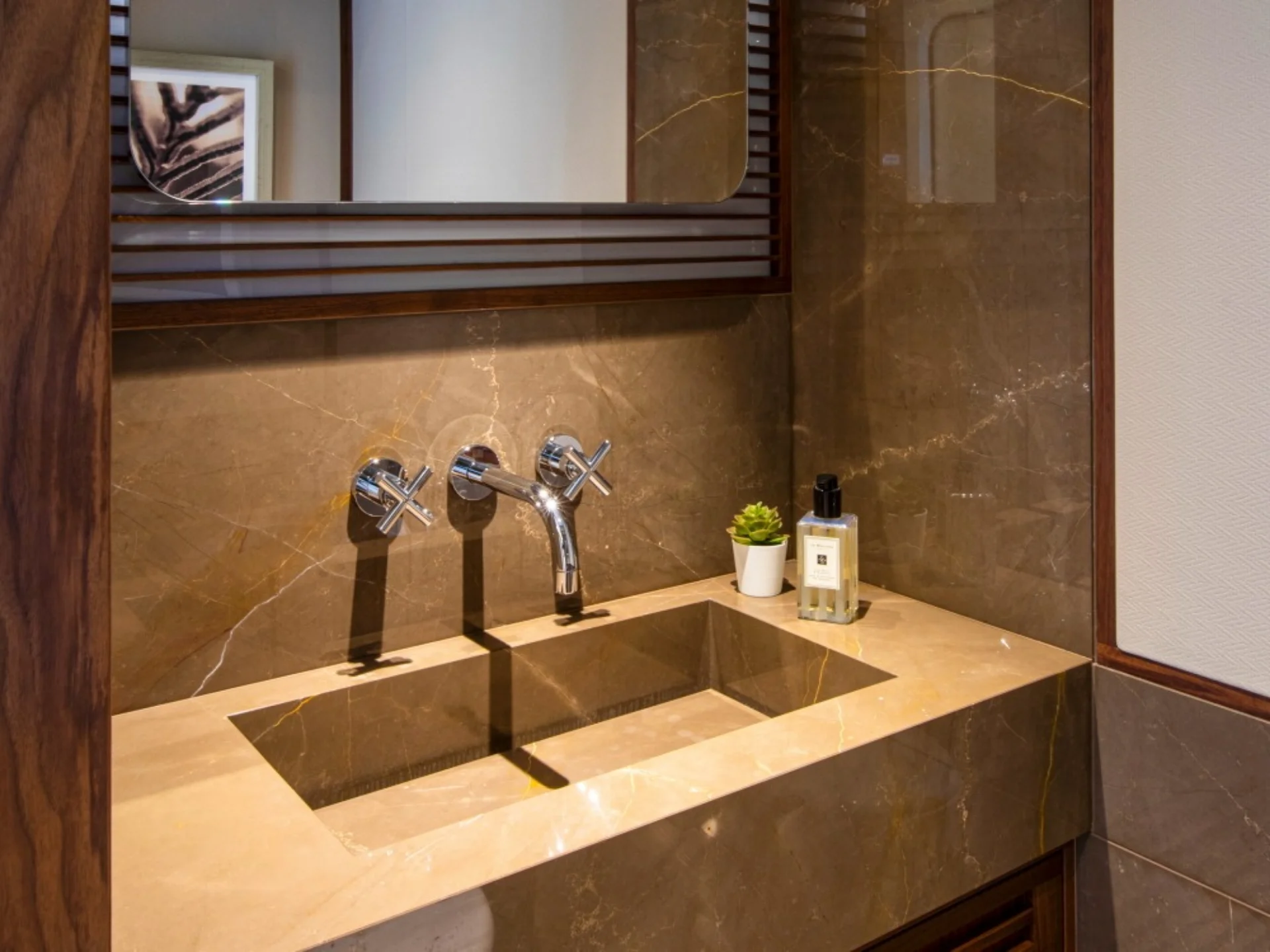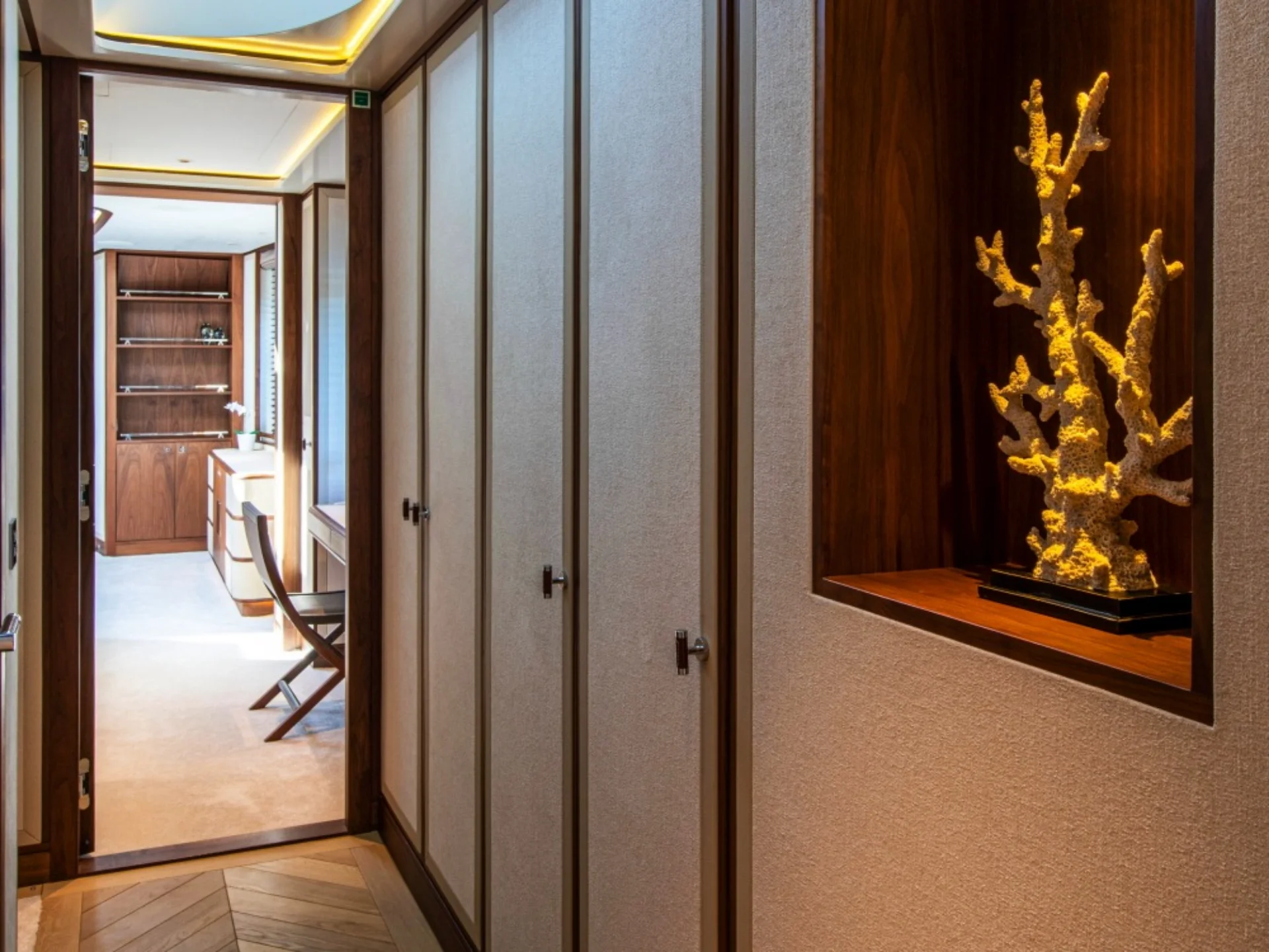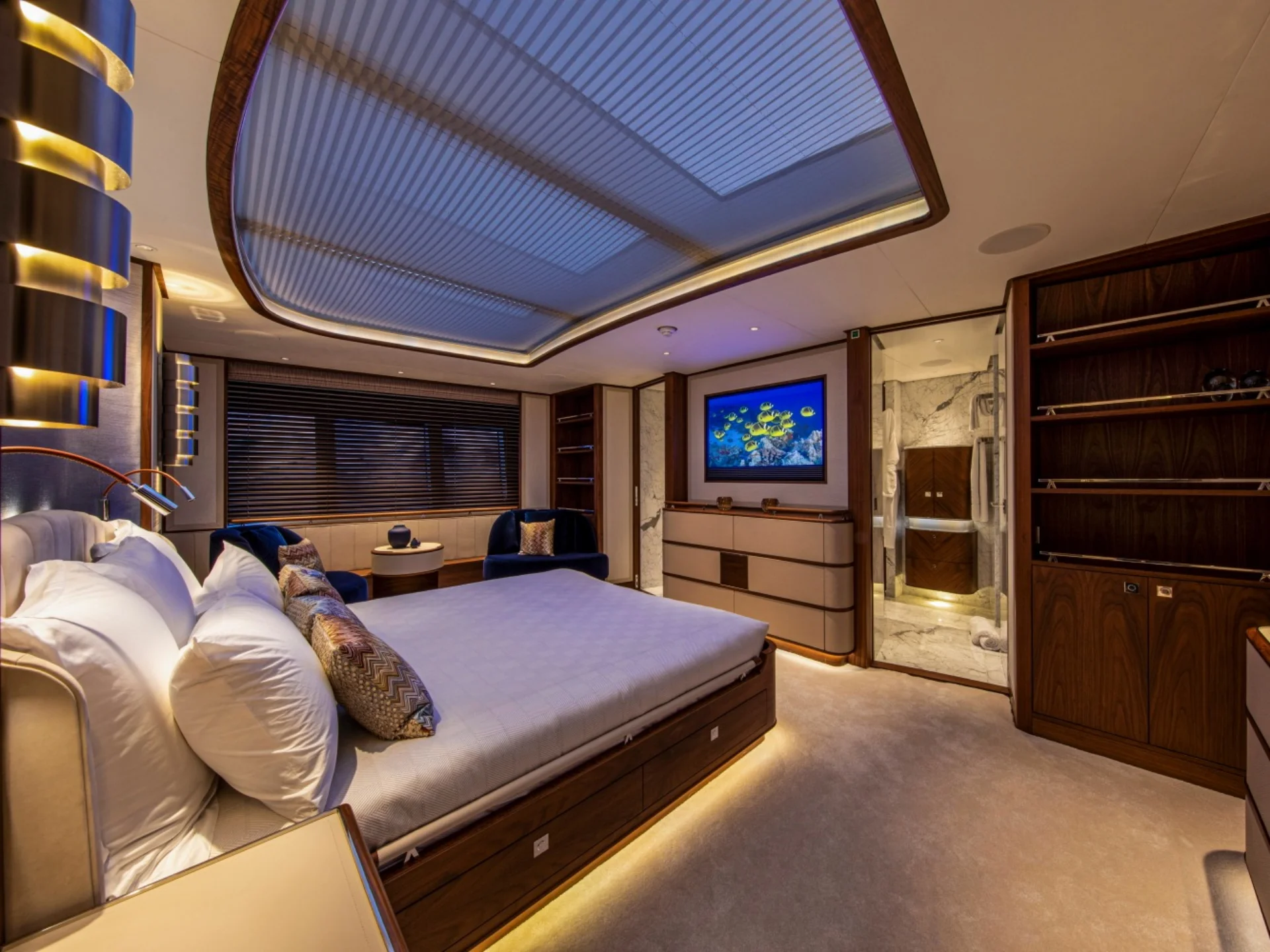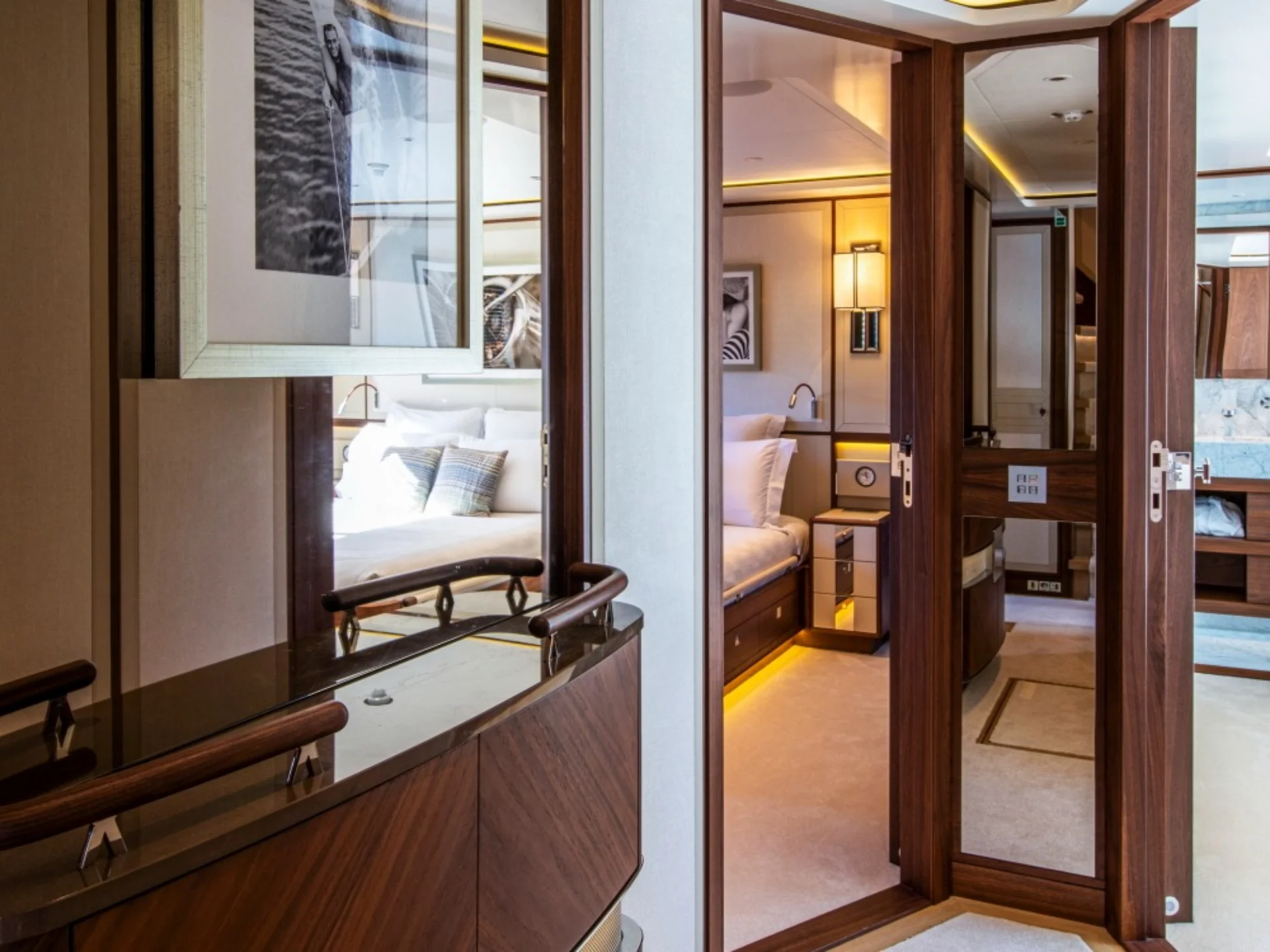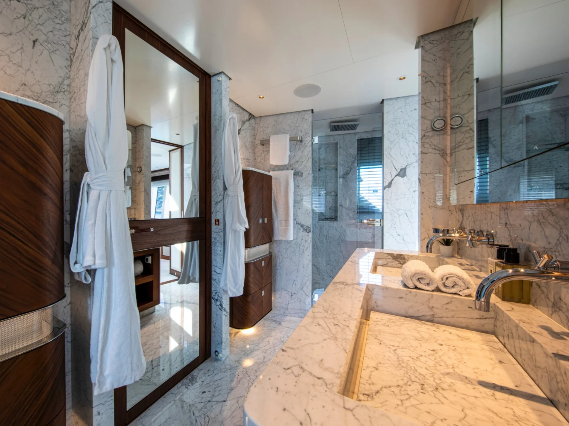 In perfect balance, the interior offers a bright and spacious atmosphere with a refined, contemporary design. The main salon features comfortable seating and an indoor dining area, enhanced by large windows that flood the space with natural light and offer panoramic sea views. Thoughtfully designed living areas create a welcoming environment for relaxing, dining, and spending time together on board.