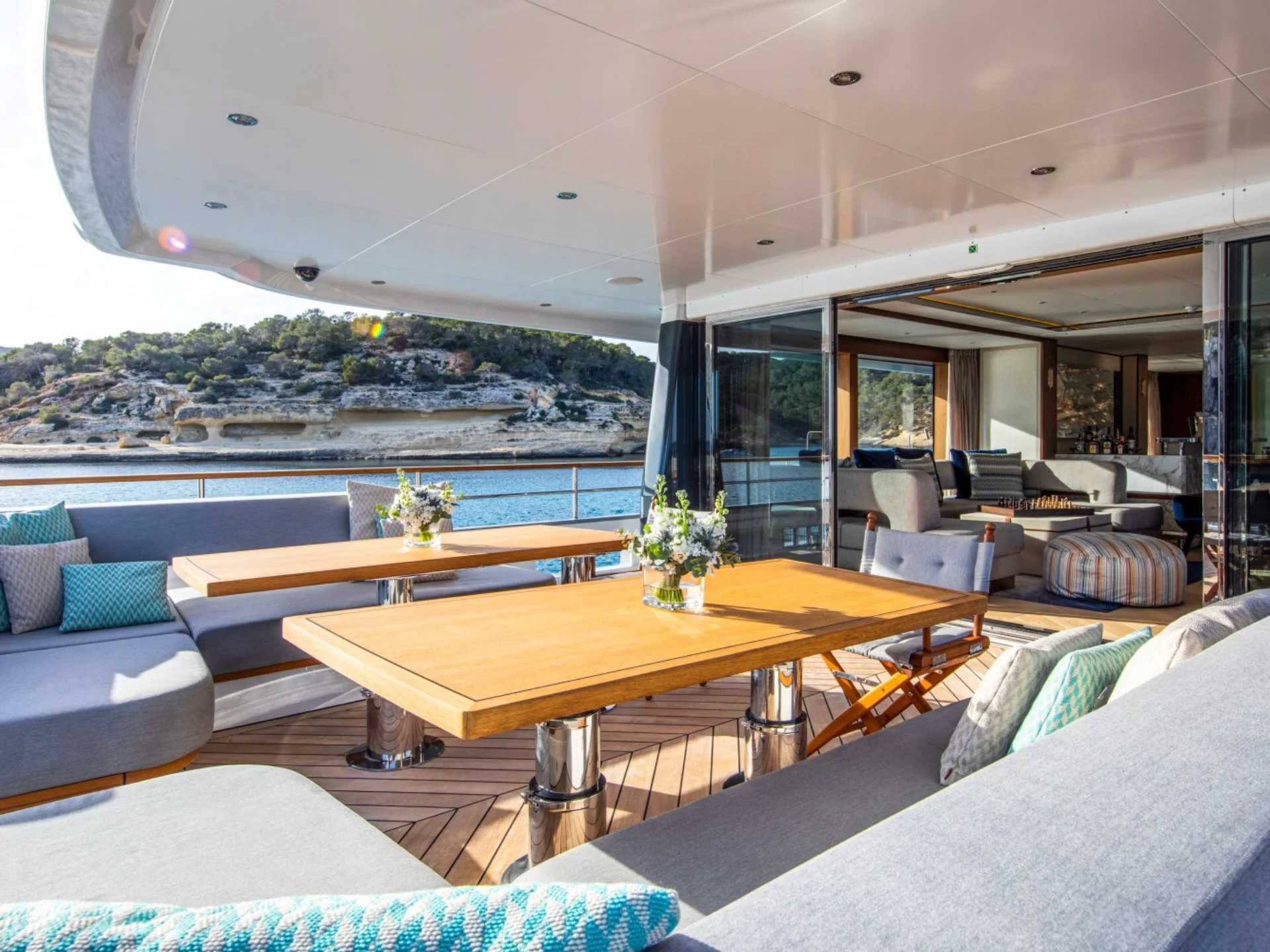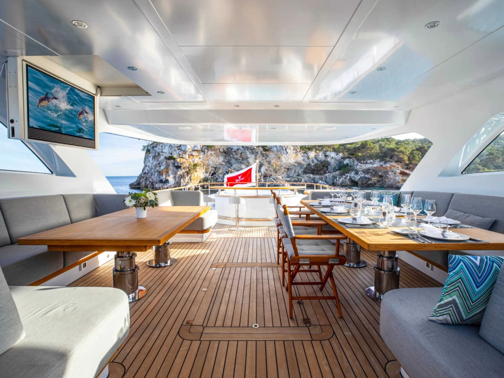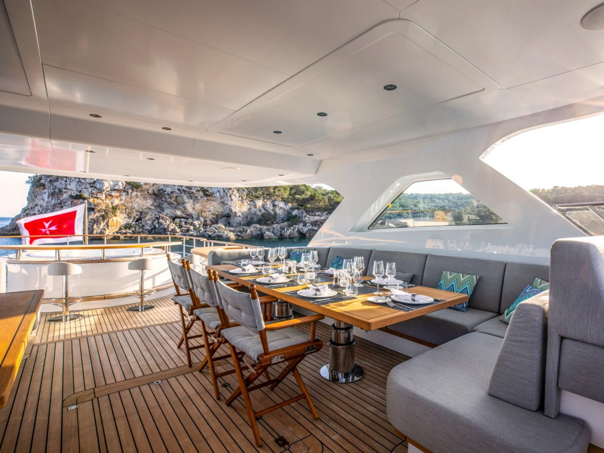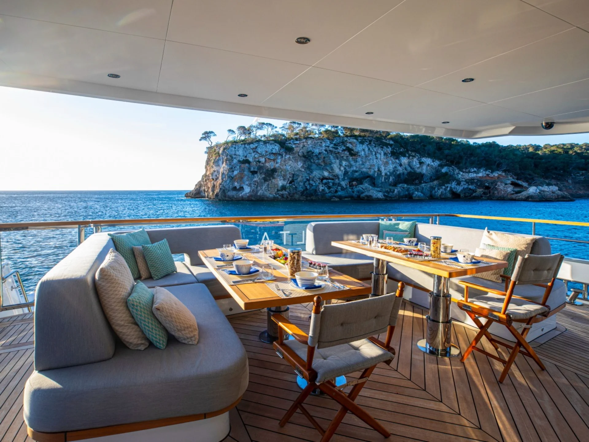 Her exterior spaces are designed for relaxed outdoor living and socialising. Guests can enjoy generous deck areas with comfortable seating and dining spaces, ideal for long lunches, sunset drinks, and time spent enjoying the surroundings. The sundeck offers ample space for lounging and entertaining, while the aft deck provides shaded seating and dining for effortless alfresco moments. Multiple outdoor areas allow guests to enjoy both sun and shade throughout the day.