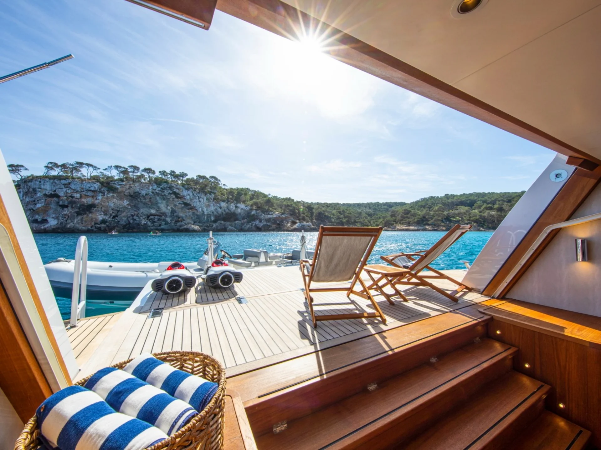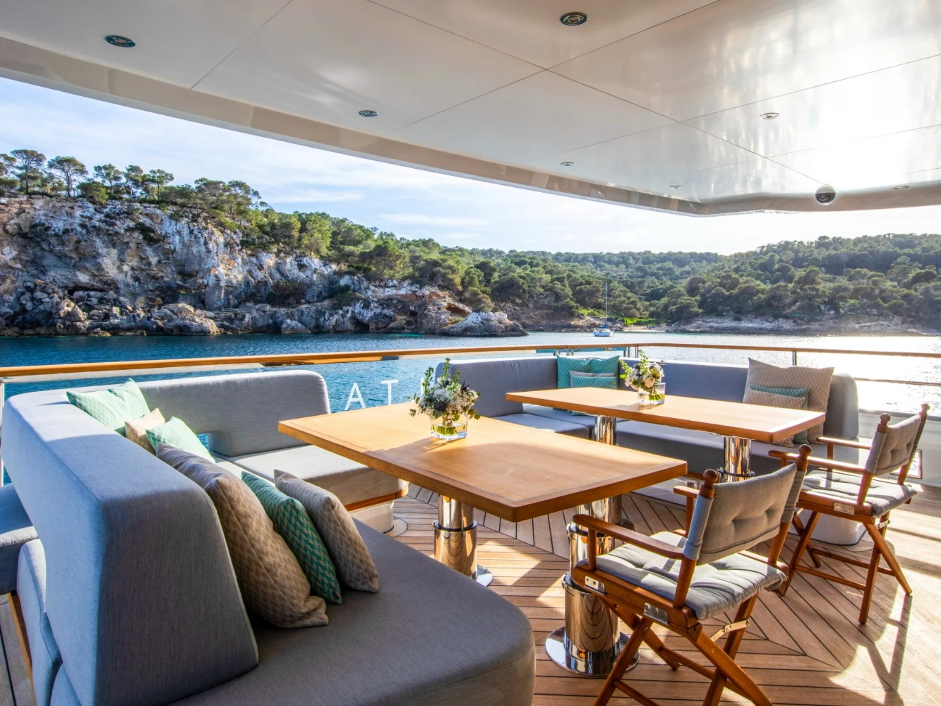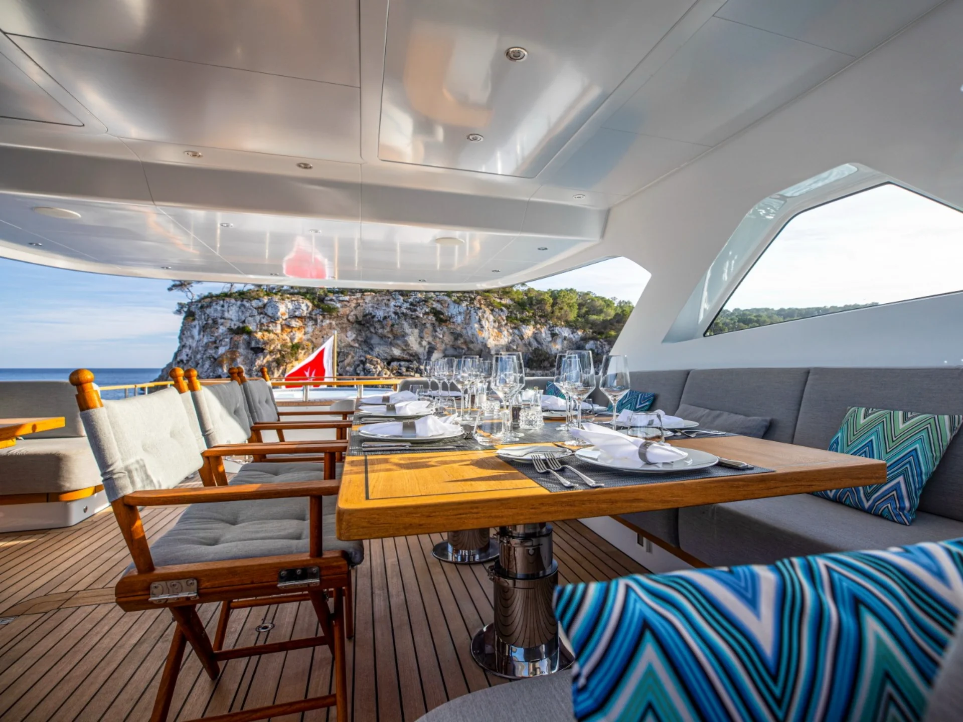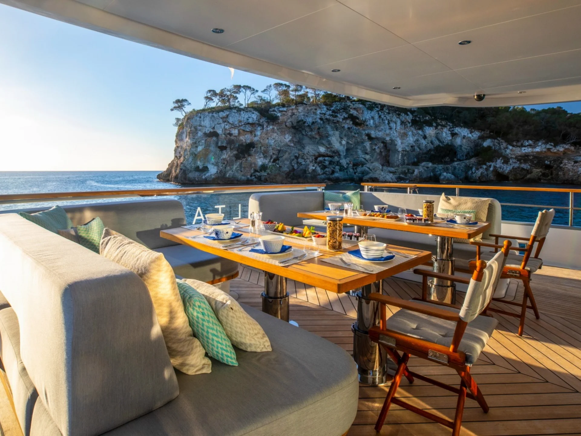 Her exterior spaces are designed for relaxed outdoor living and socialising. Guests can enjoy generous deck areas with comfortable seating and dining spaces, ideal for long lunches, sunset drinks, and time spent enjoying the surroundings. The sundeck offers ample space for lounging and entertaining, while the aft deck provides shaded seating and dining for effortless alfresco moments. Multiple outdoor areas allow guests to enjoy both sun and shade throughout the day.