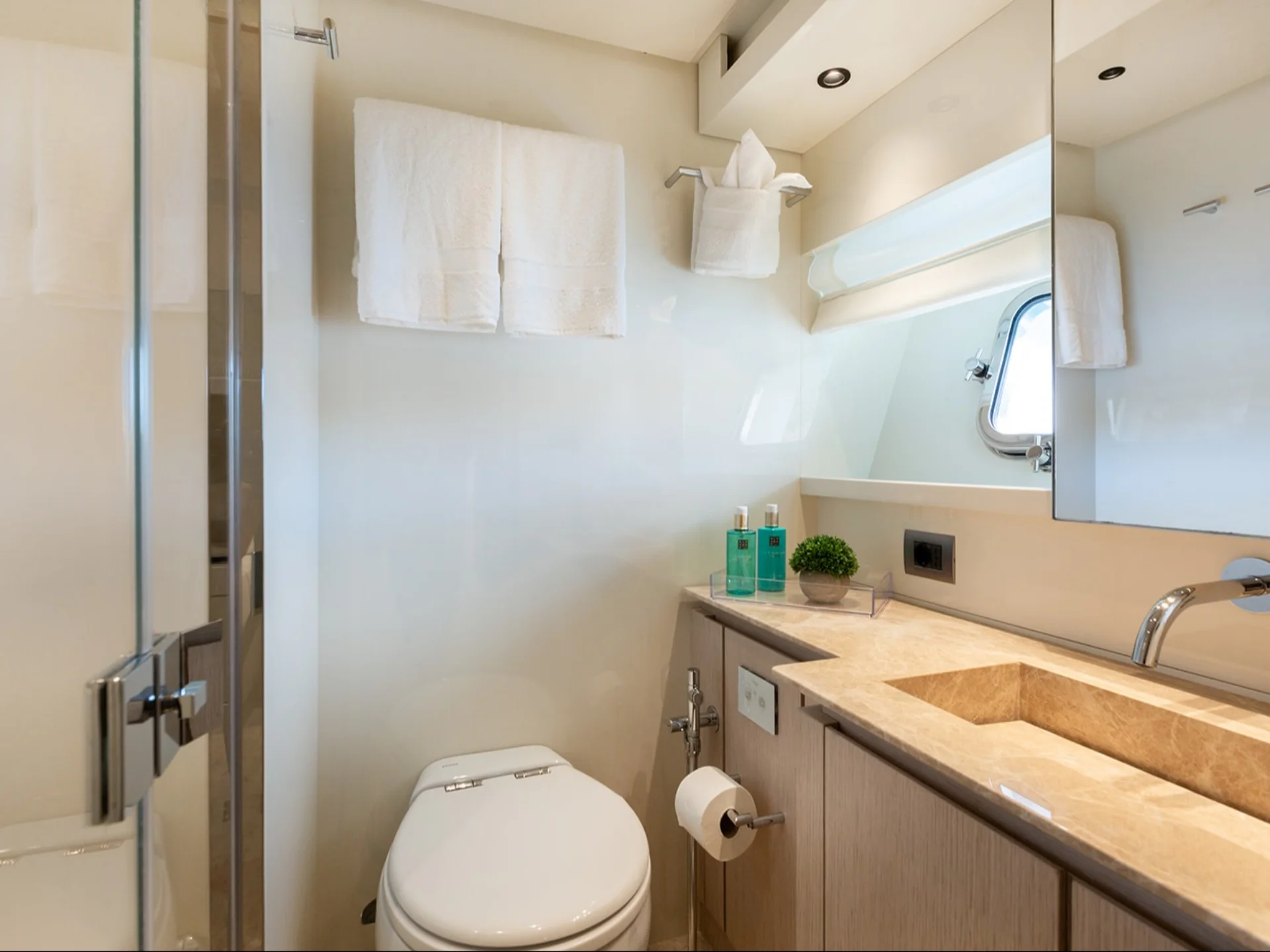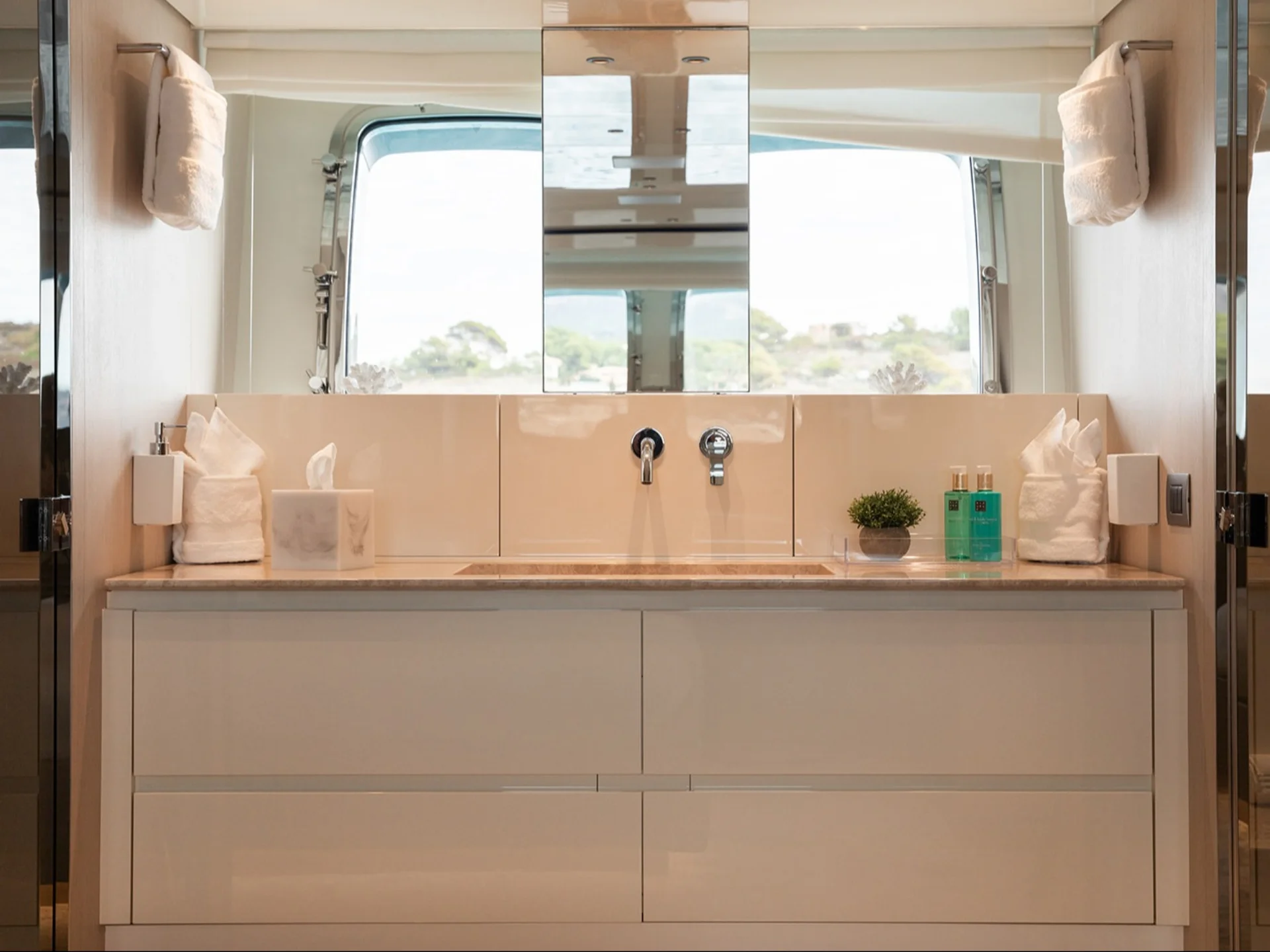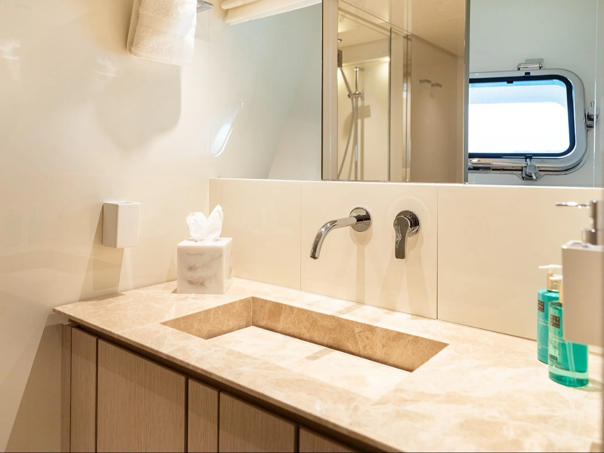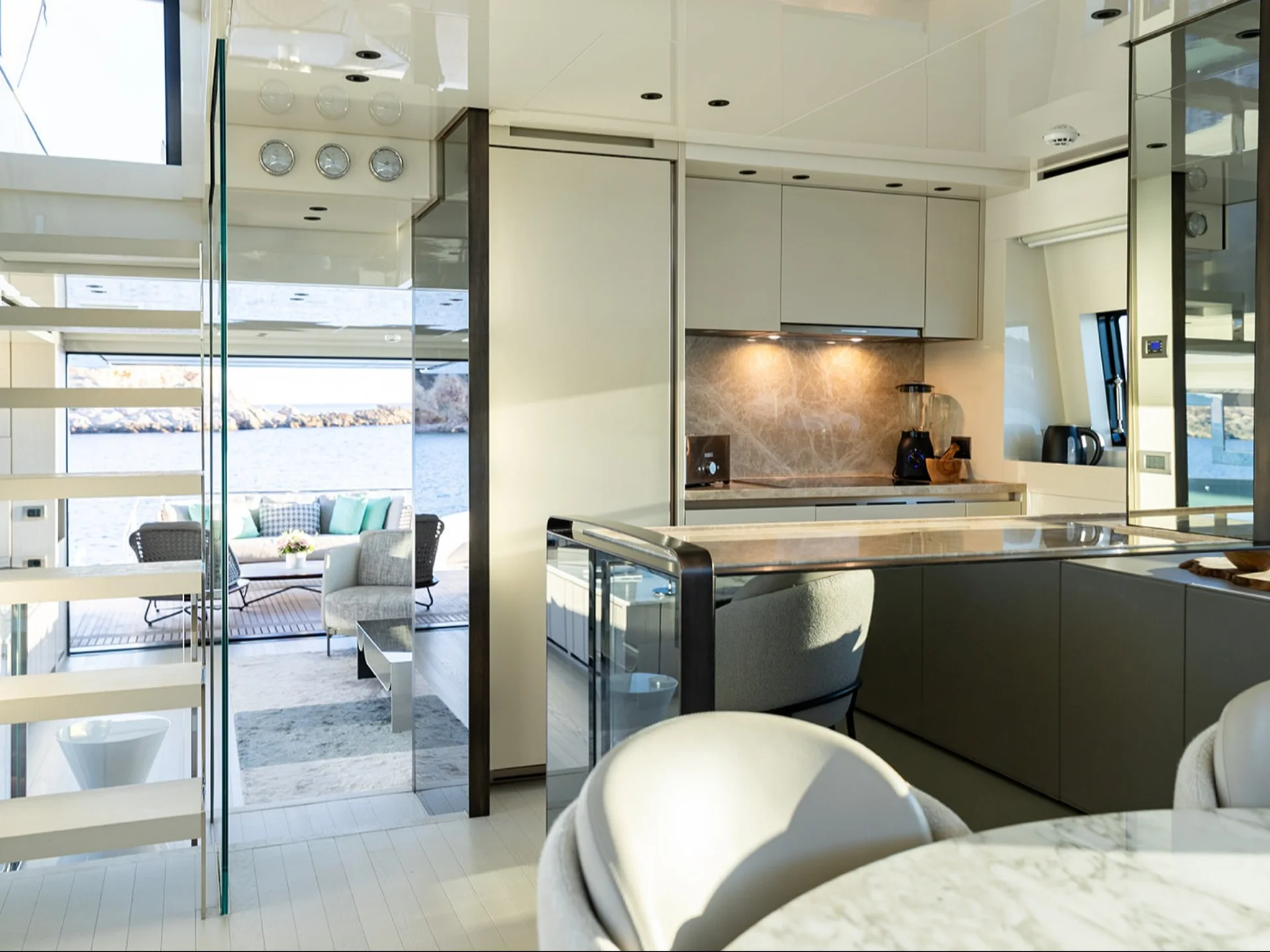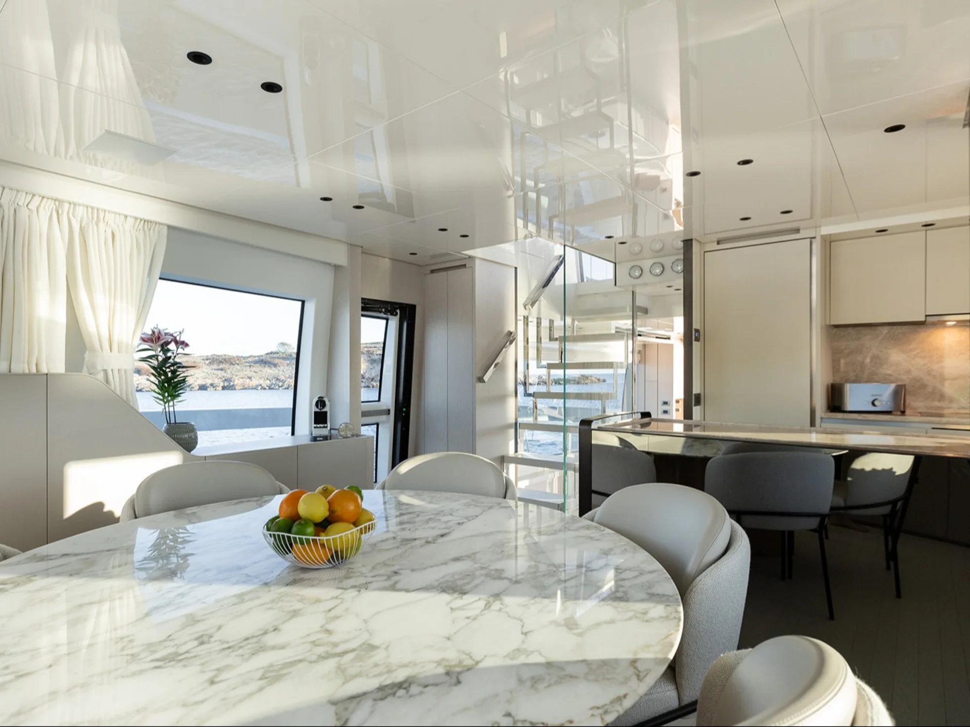 Inside, CLOUD IX offers a calm and sophisticated interior with understated elegance. Panoramic windows fill the main salon with natural light, enhancing the sense of space and connection to the sea. The open-plan salon, modern galley, and refined dining area create a welcoming environment for entertaining or unwinding in comfort. Accommodating six guests in three en-suite cabins, including a master stateroom and two guest cabins, CLOUD IX delivers a serene onboard atmosphere designed for pure relaxation.