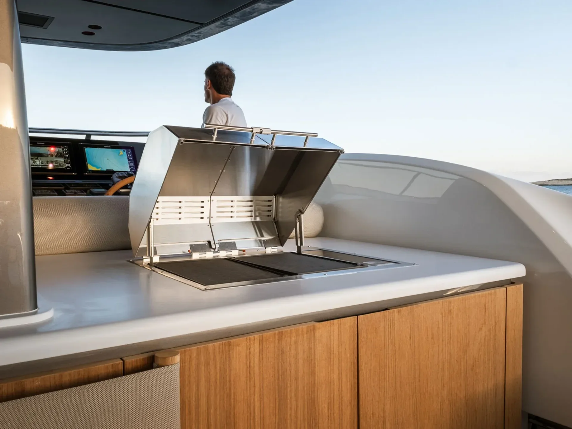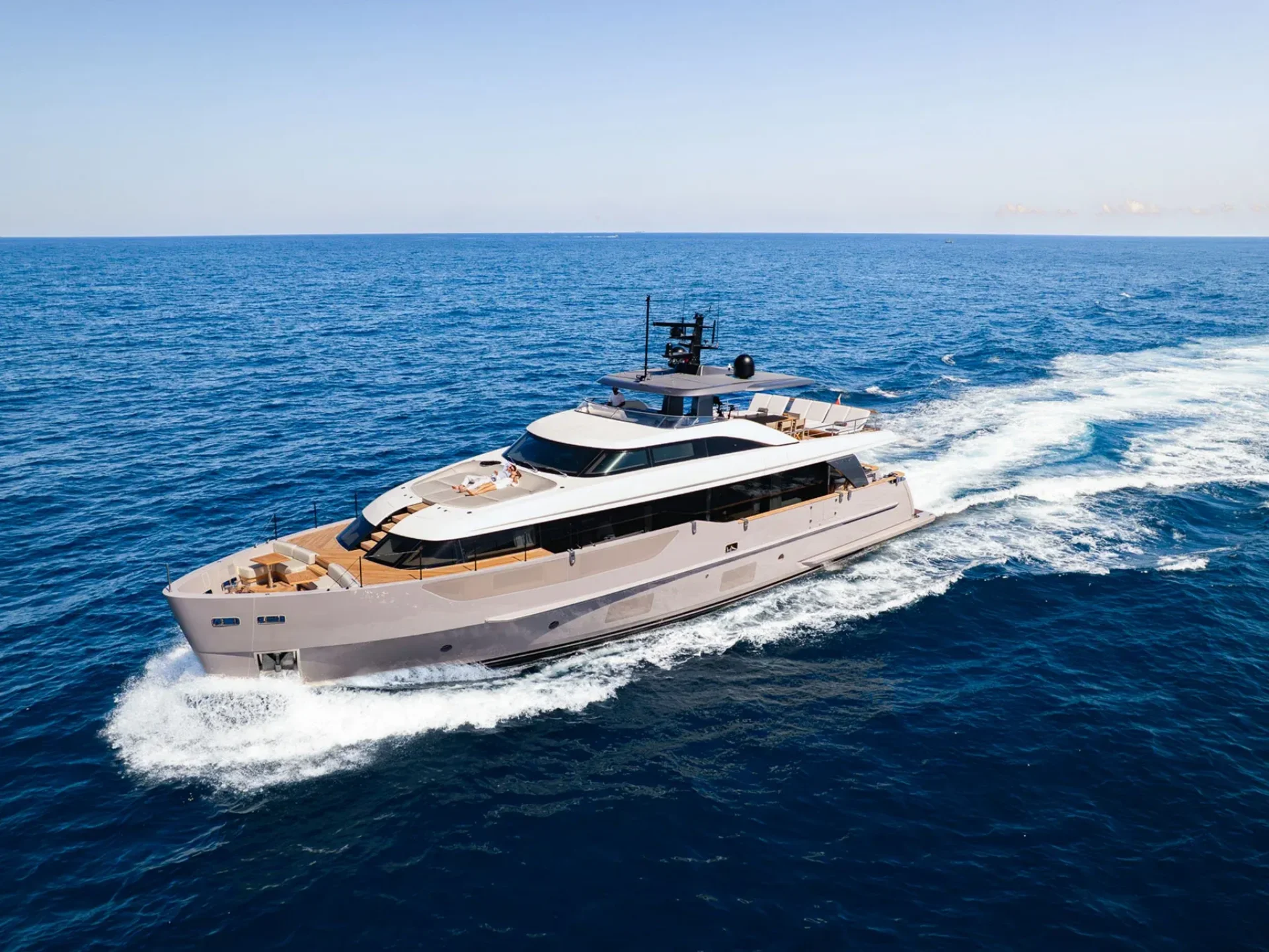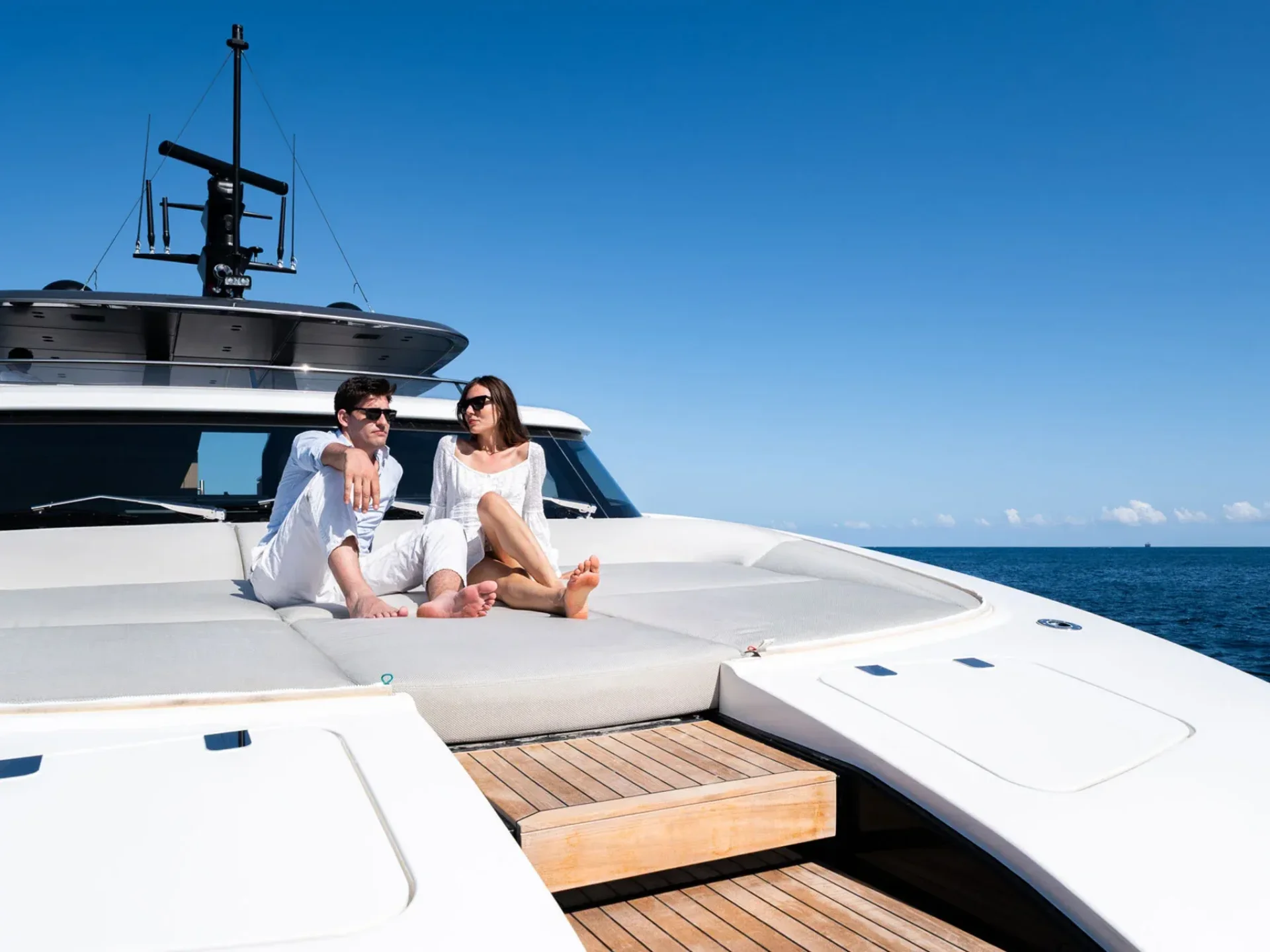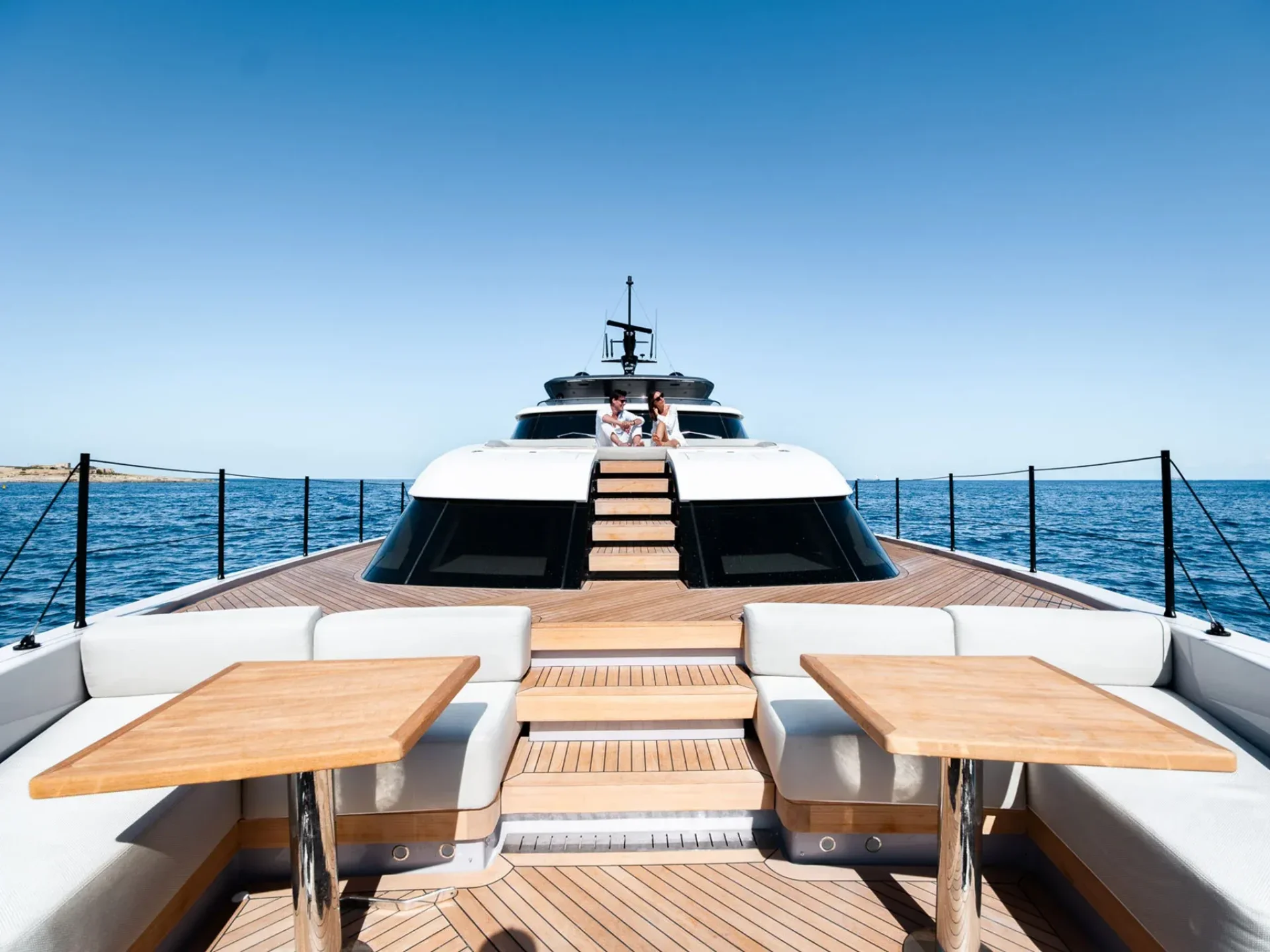The yacht’s bow is dedicated to ultimate relaxation, featuring a generous sunbathing area and a lounge zone fully surrounded by the sea, allowing guests to enjoy open views and a complete immersion in the surrounding marine environment. The flybridge is one of the yacht’s most exclusive spaces, designed for tranquil cruising or social moments, and equipped with a helm station, table, and sofas, offering an ideal setting for relaxing and spending time together on board.