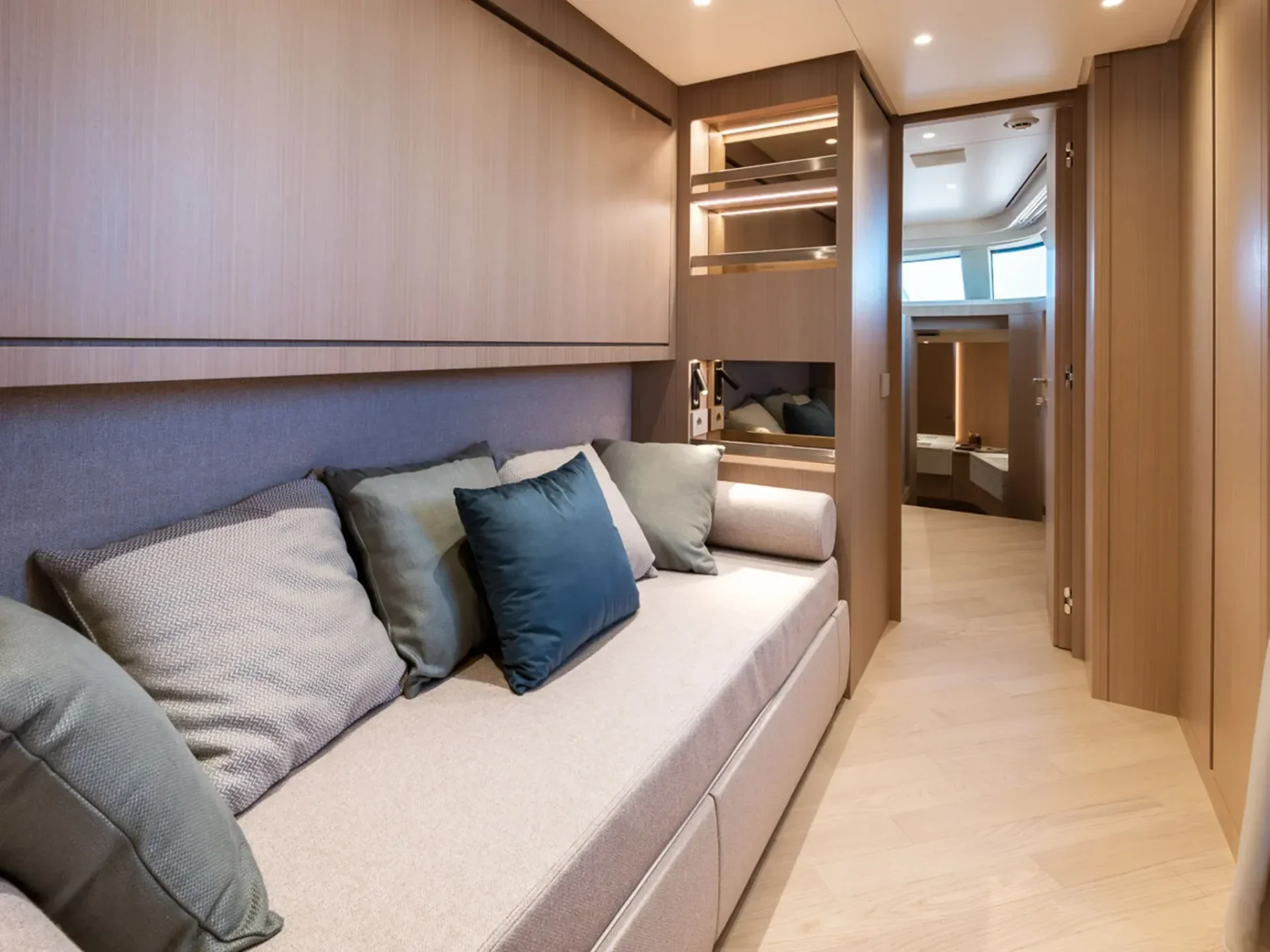 The interiors of Sanlorenzo SD90 Penguins are conceived to ensure a balance between aesthetic appeal and functionality, creating refined and welcoming environments throughout. On the main deck, the yacht features a spacious salon, a fully equipped kitchen, a service bathroom, and a generous owner’s cabin forward, designed to provide privacy and comfort. On the lower deck, three additional cabins complete the accommodation, including one VIP cabin and two twin cabins, one with convertible beds, both with Pullman berths, ensuring flexibility and comfort for all guests.