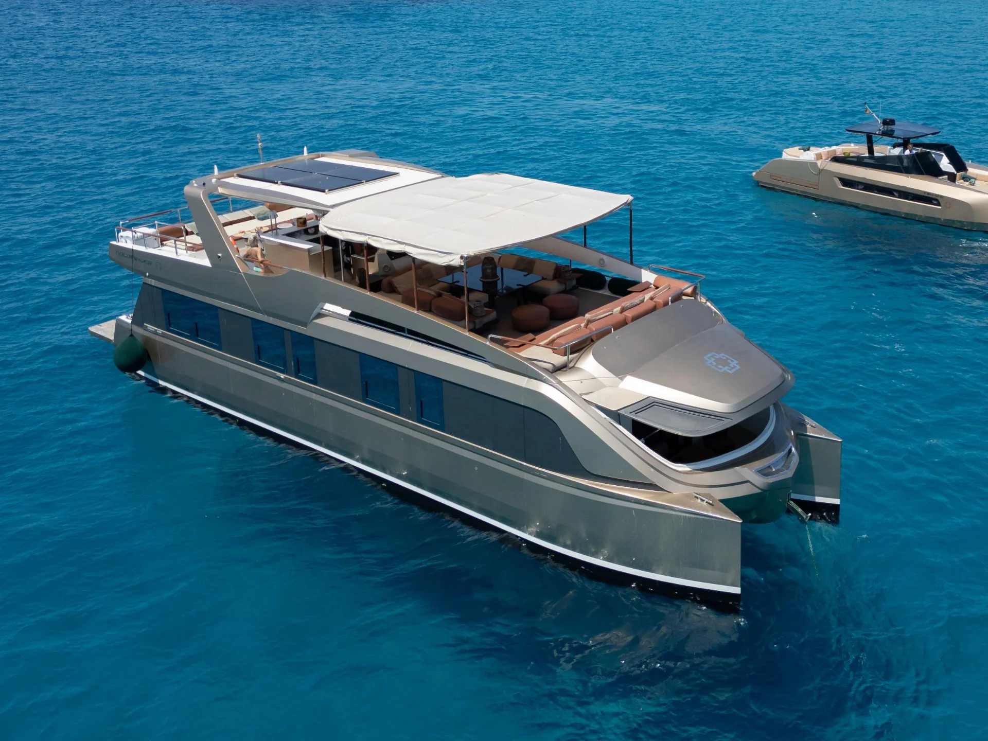 GOLDFINGER is not just a yacht — it is a floating designer residence created for guests who value space, privacy, and understated luxury. Inspired by iconic design and tailored for the Balearics, this one-of-a-kind power catamaran offers the comfort of a boutique hotel combined with the freedom of life at sea.
