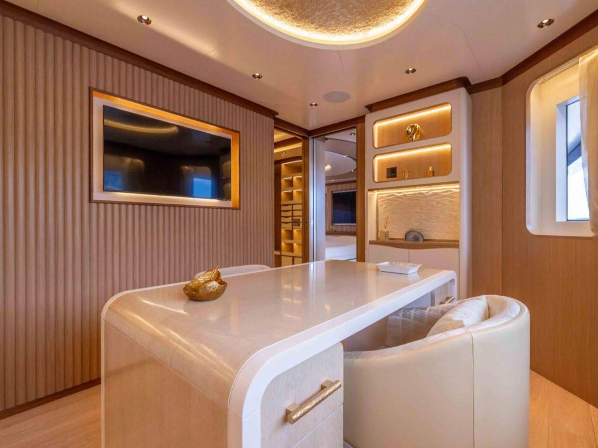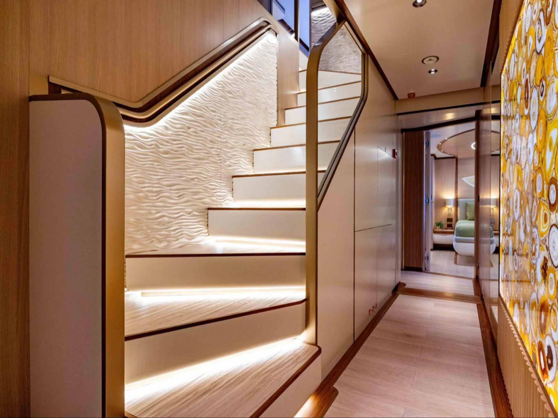 ANJELIF’s interior combines luxury and functionality, with open-plan living areas that emphasize comfort and style. She features five well-appointed staterooms, providing accommodations for 11 guests, including a master suite and four guest cabins. Each cabin is designed for ultimate comfort with refined furnishings and elegant touches, offering guests a serene retreat after a day on the water.