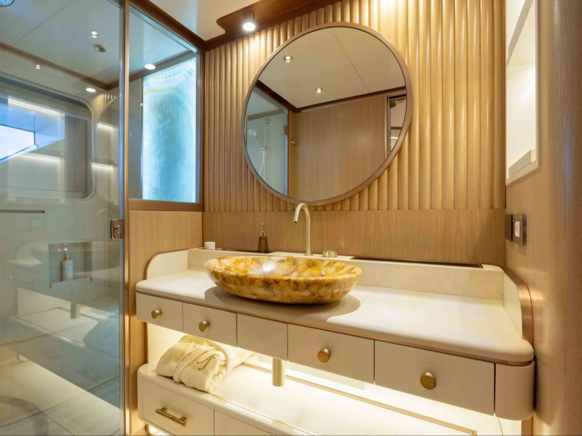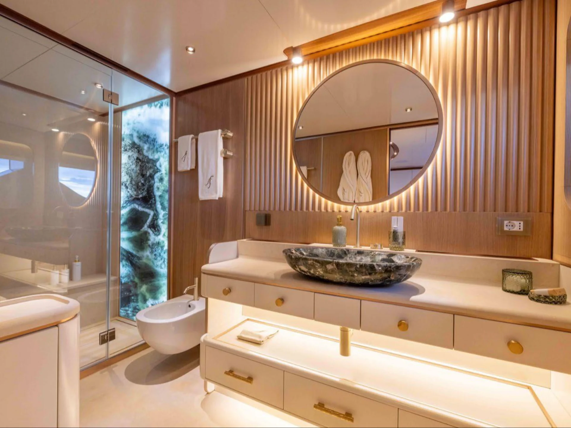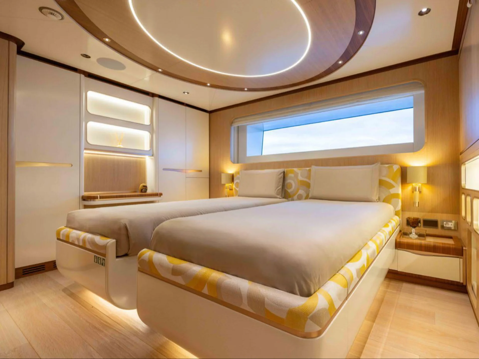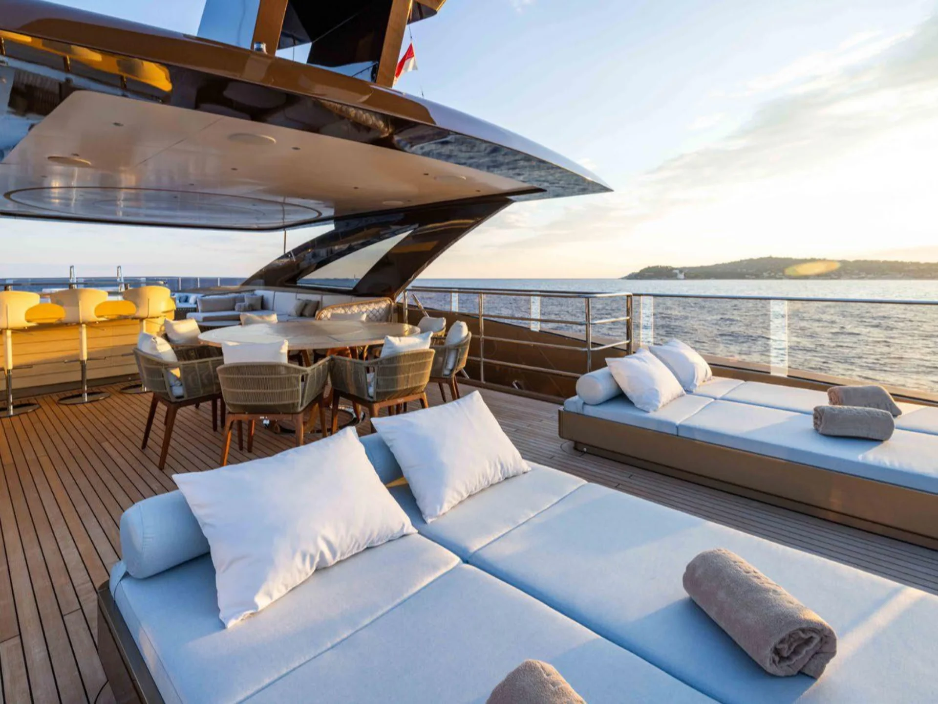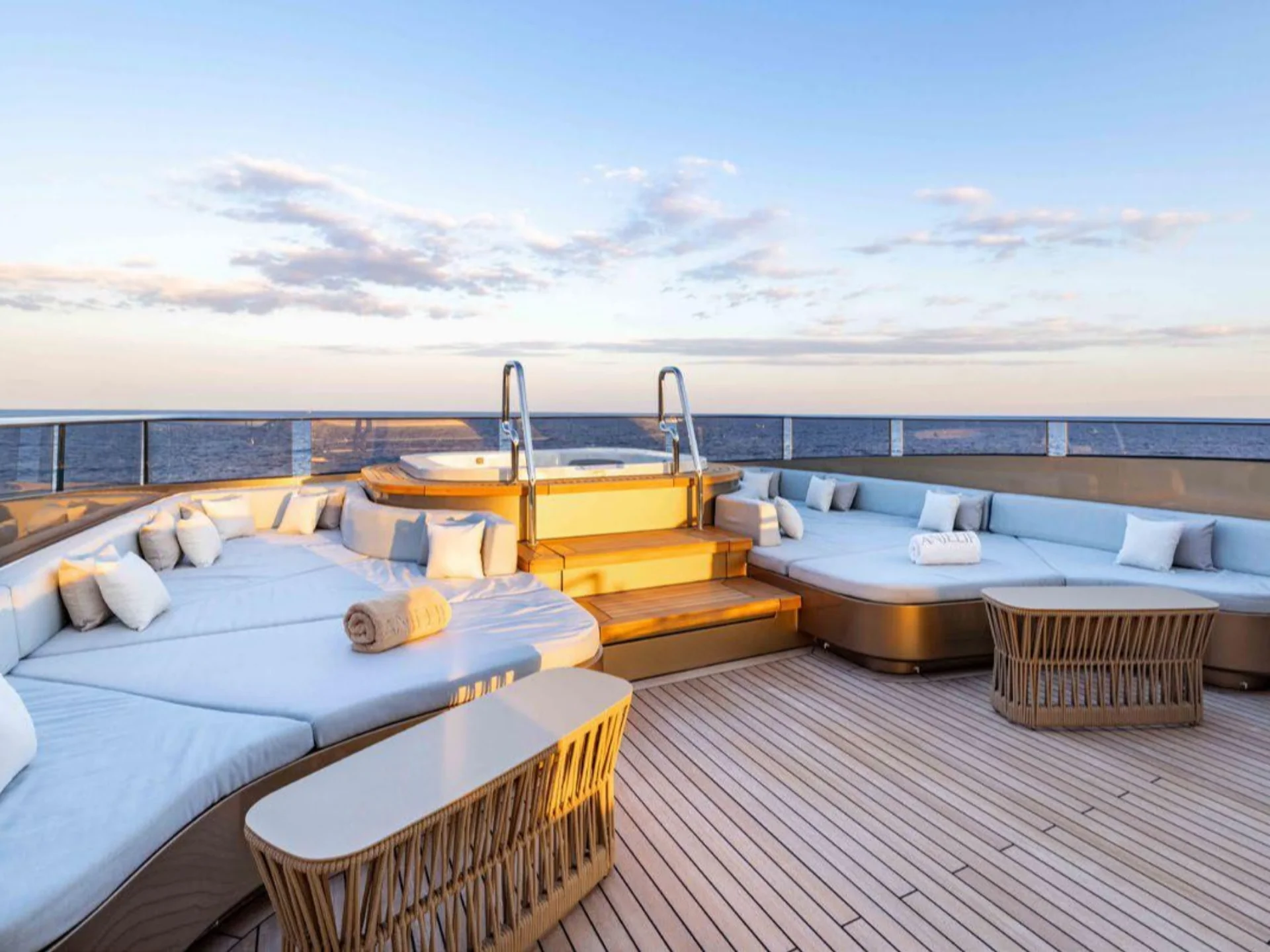 ANJELIF’s sleek and contemporary lines are a testament to Columbus’ design innovation, making her a standout on the water. Her impressive deck spaces offer multiple relaxation zones, including shaded lounging areas and spacious sun pads, ideal for both sunbathing and socializing. Her hybrid capabilities also allow for eco-friendly cruising without compromising on performance or luxury.