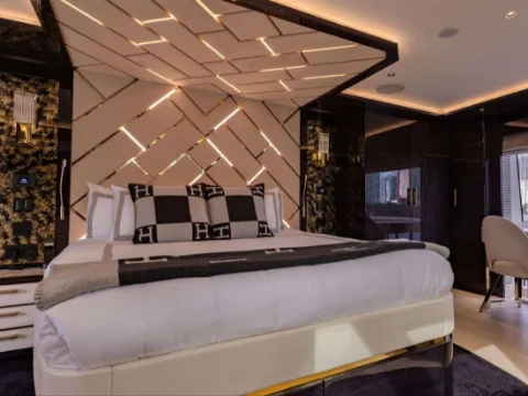Inside, the interior is elegantly appointed with high-quality materials and contemporary furnishings. The main salon offers a spacious seating area with large windows that flood the space with natural light, creating an inviting atmosphere. The open-plan layout seamlessly connects the salon to the dining area, providing a perfect setting for socializing and relaxation.