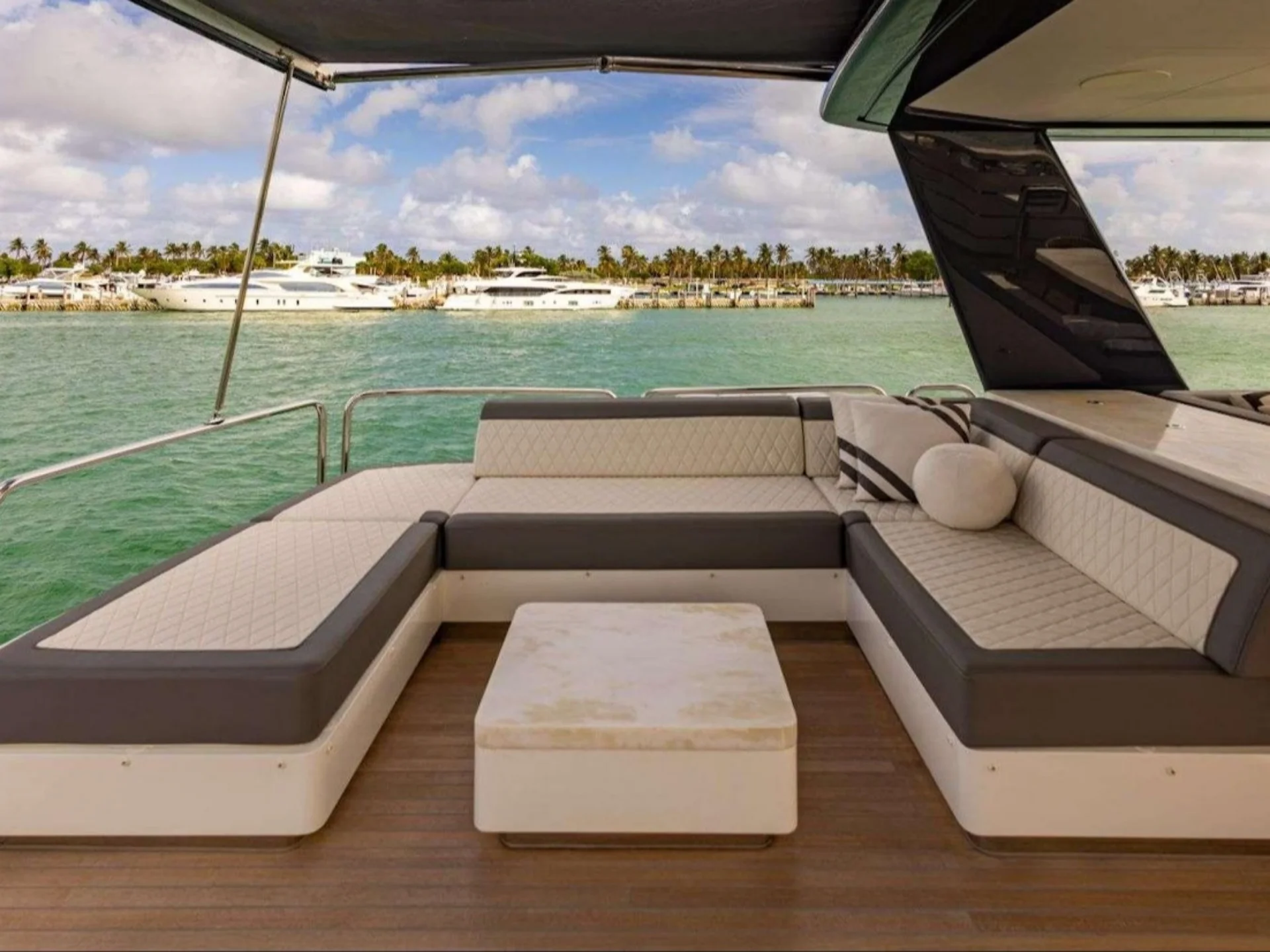 The exterior of Olympus features expansive deck areas designed for relaxation and entertainment. Guests can enjoy alfresco dining on the aft deck, lounge on the flybridge with panoramic views, or sunbathe on the foredeck's sun pads. A swim platform provides easy access to the water, enhancing the overall outdoor experience.