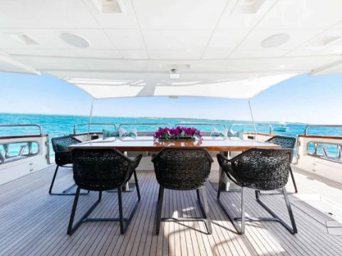 Her exterior spaces provide ample room for socializing and unwinding. The spacious aft deck is perfect for alfresco dining, while the sundeck features a Jacuzzi, sun loungers, and a fully equipped wet bar. Guests can also enjoy the foredeck sun pads, ideal for soaking up the sun while taking in the breathtaking ocean views. A hydraulic swim platform makes it easy to enjoy the yacht’s collection of water toys.