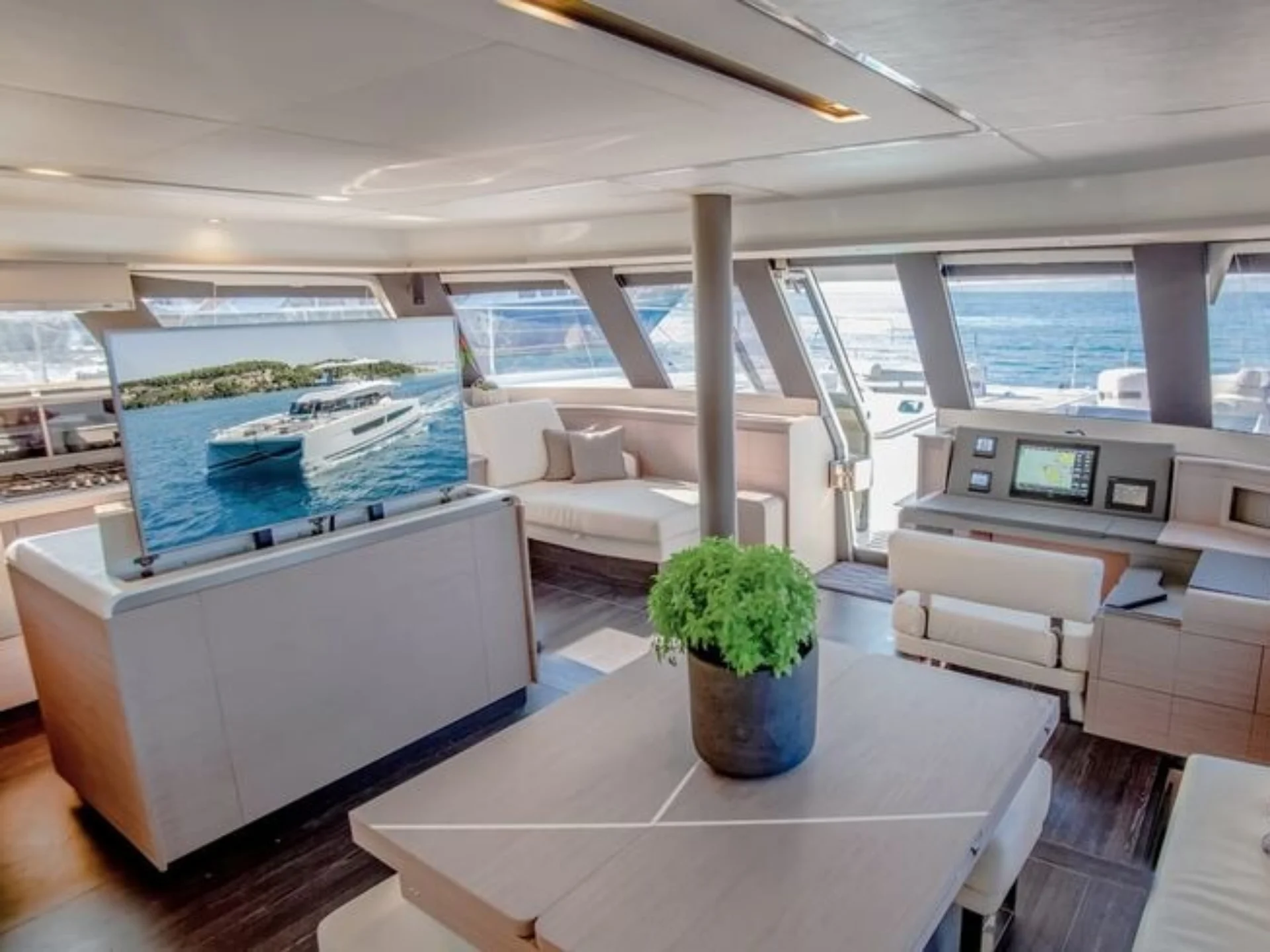 Inside, the yacht boasts a bright and elegant interior with panoramic windows, allowing natural light to flood the salon. The open-plan living area includes a spacious lounge, dining table, and a fully equipped galley. High-end finishes and modern amenities create a serene atmosphere throughout the yacht.