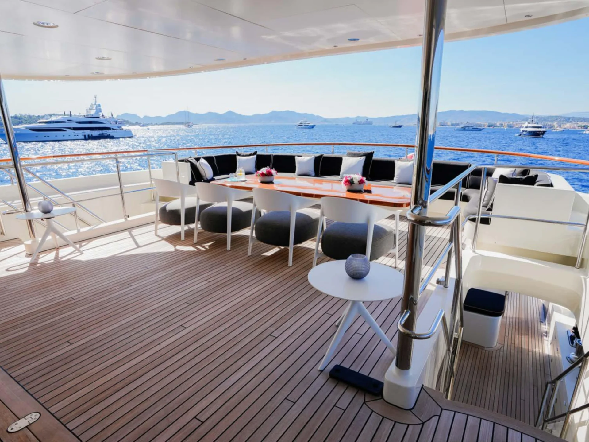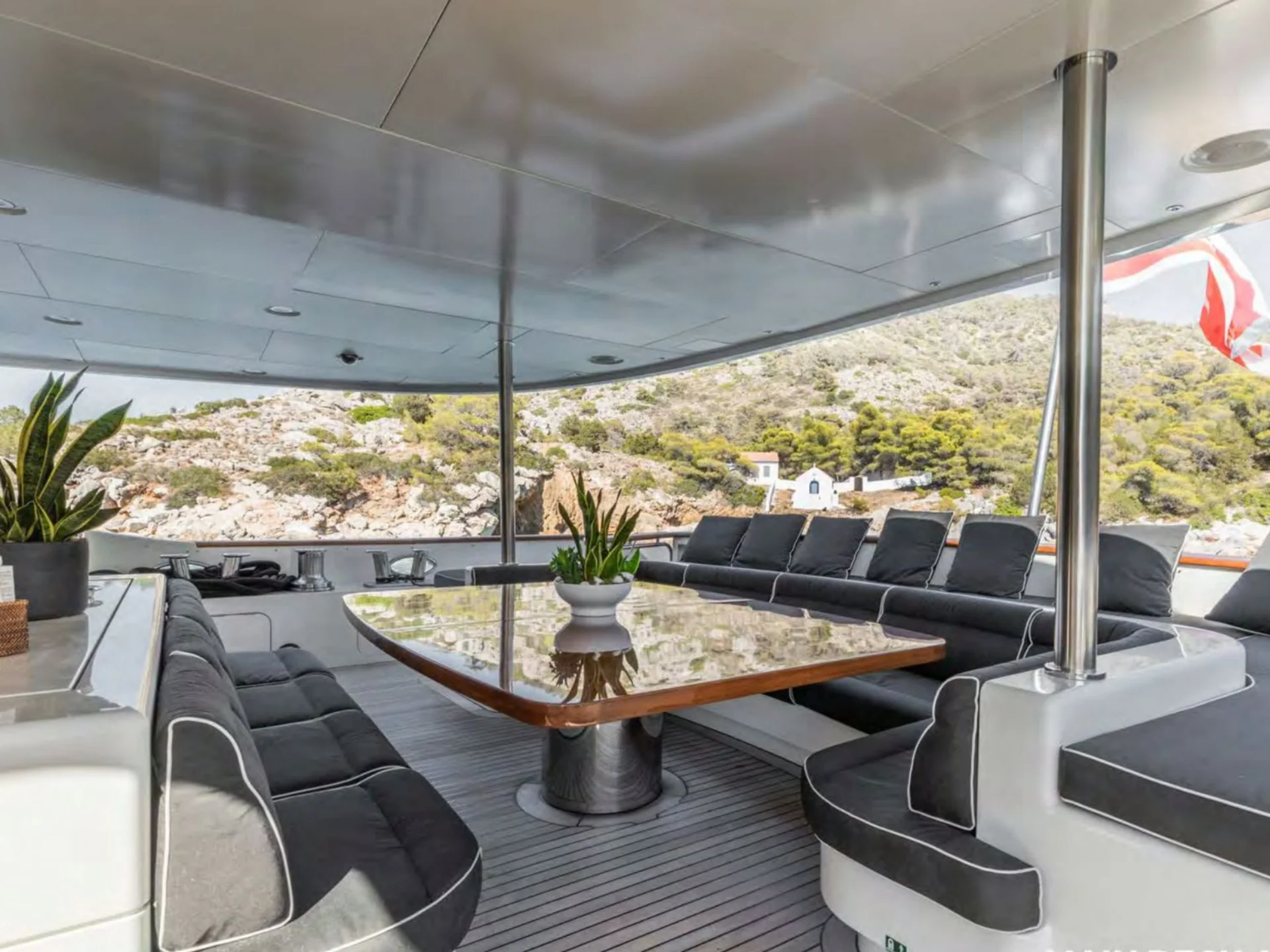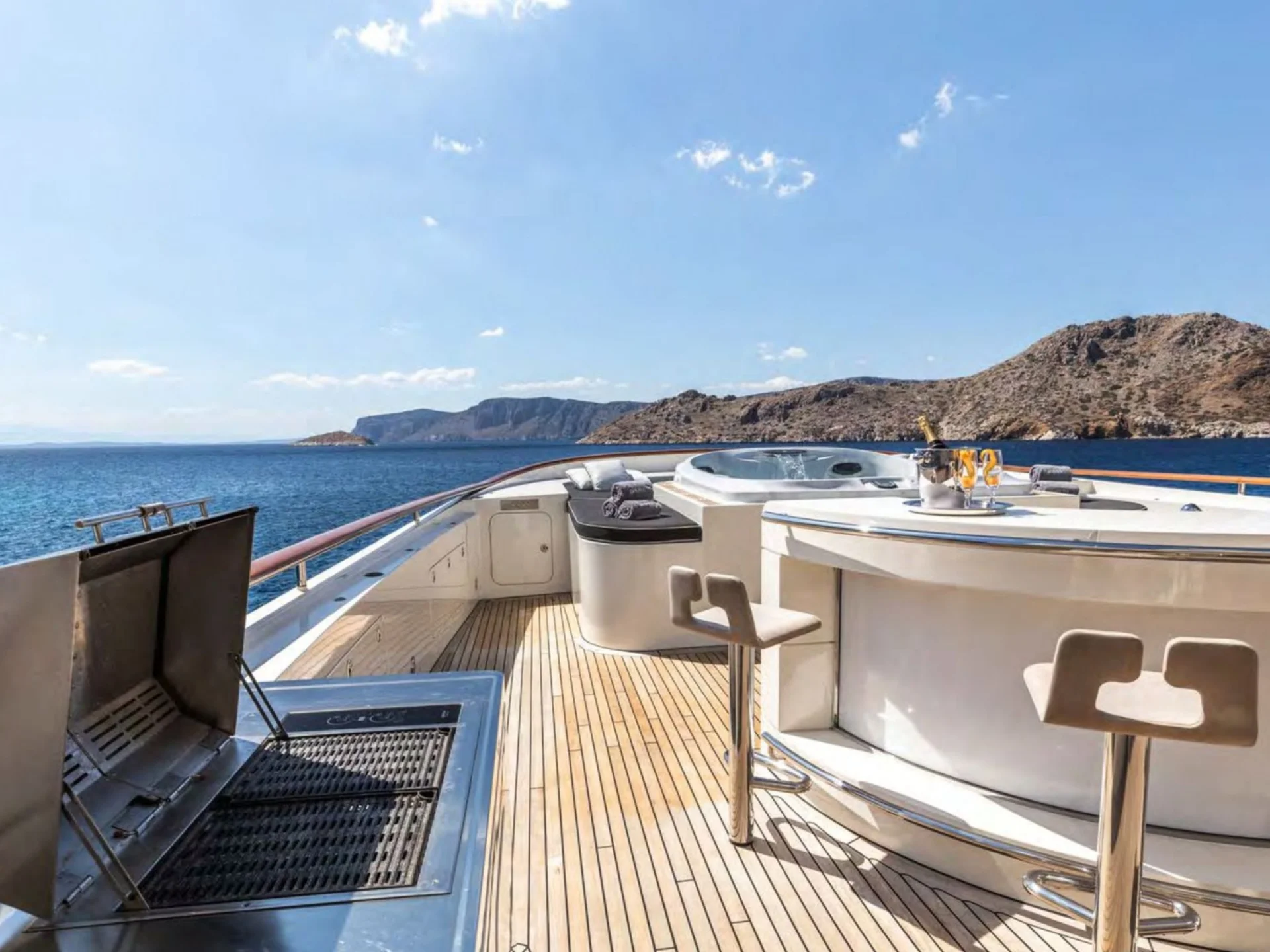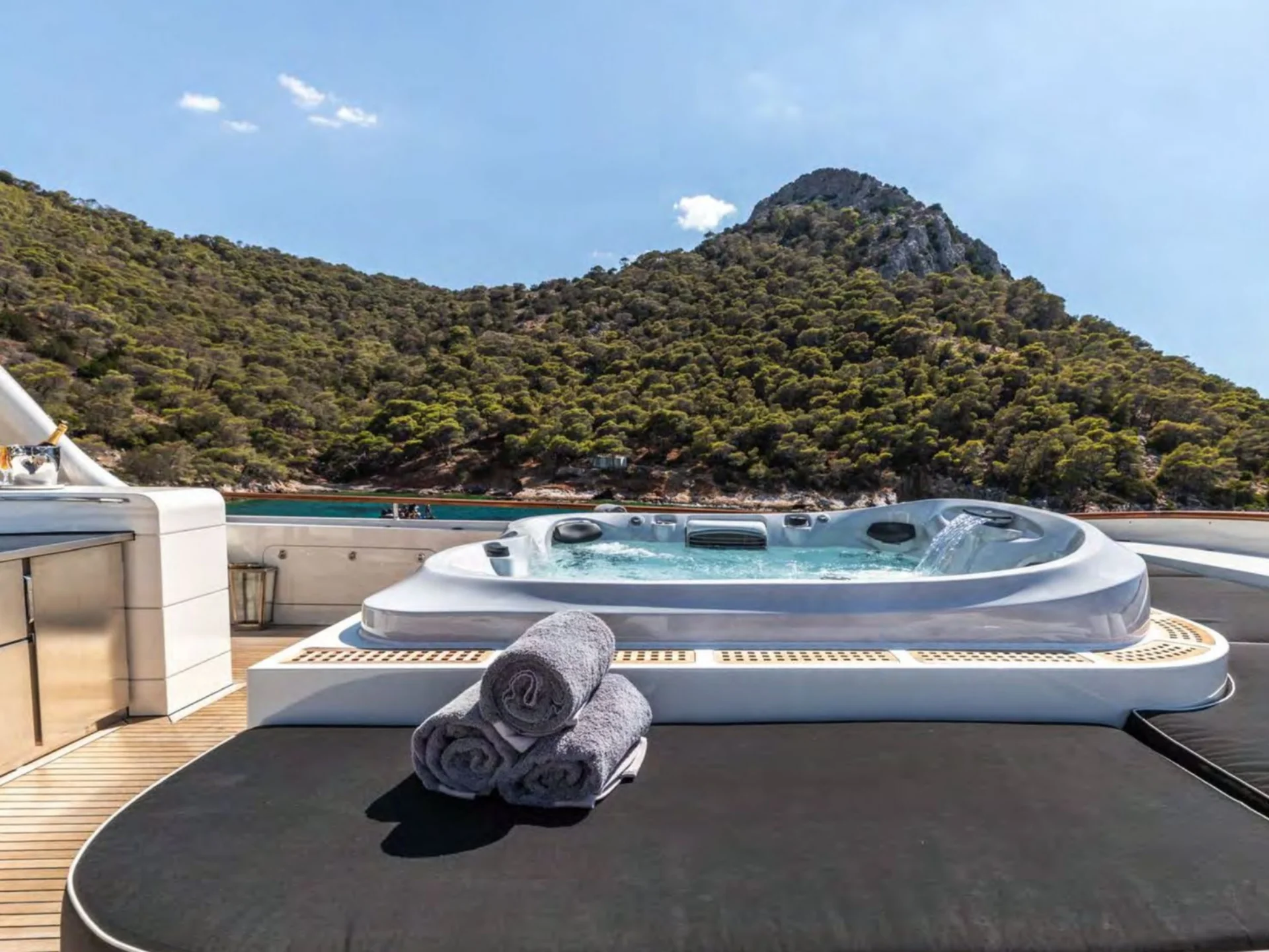 Expansive exterior decks feature multiple dining and lounge areas, a Jacuzzi on the sundeck, and a hydraulic swim platform for effortless access to the sea. Equipped with zero-speed stabilisers, she ensures exceptional comfort both underway and at anchor.