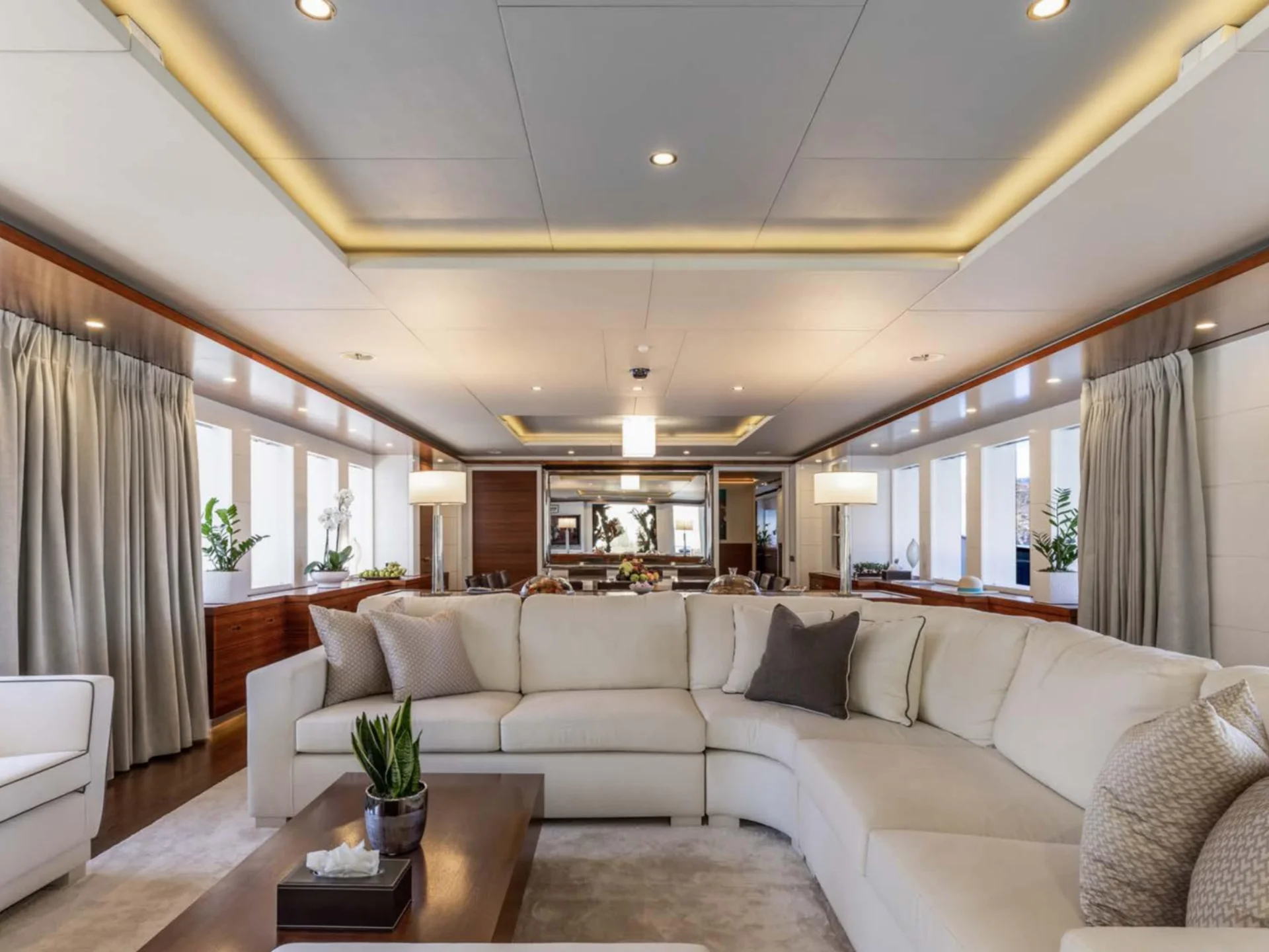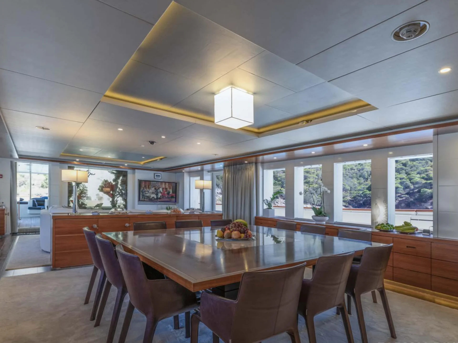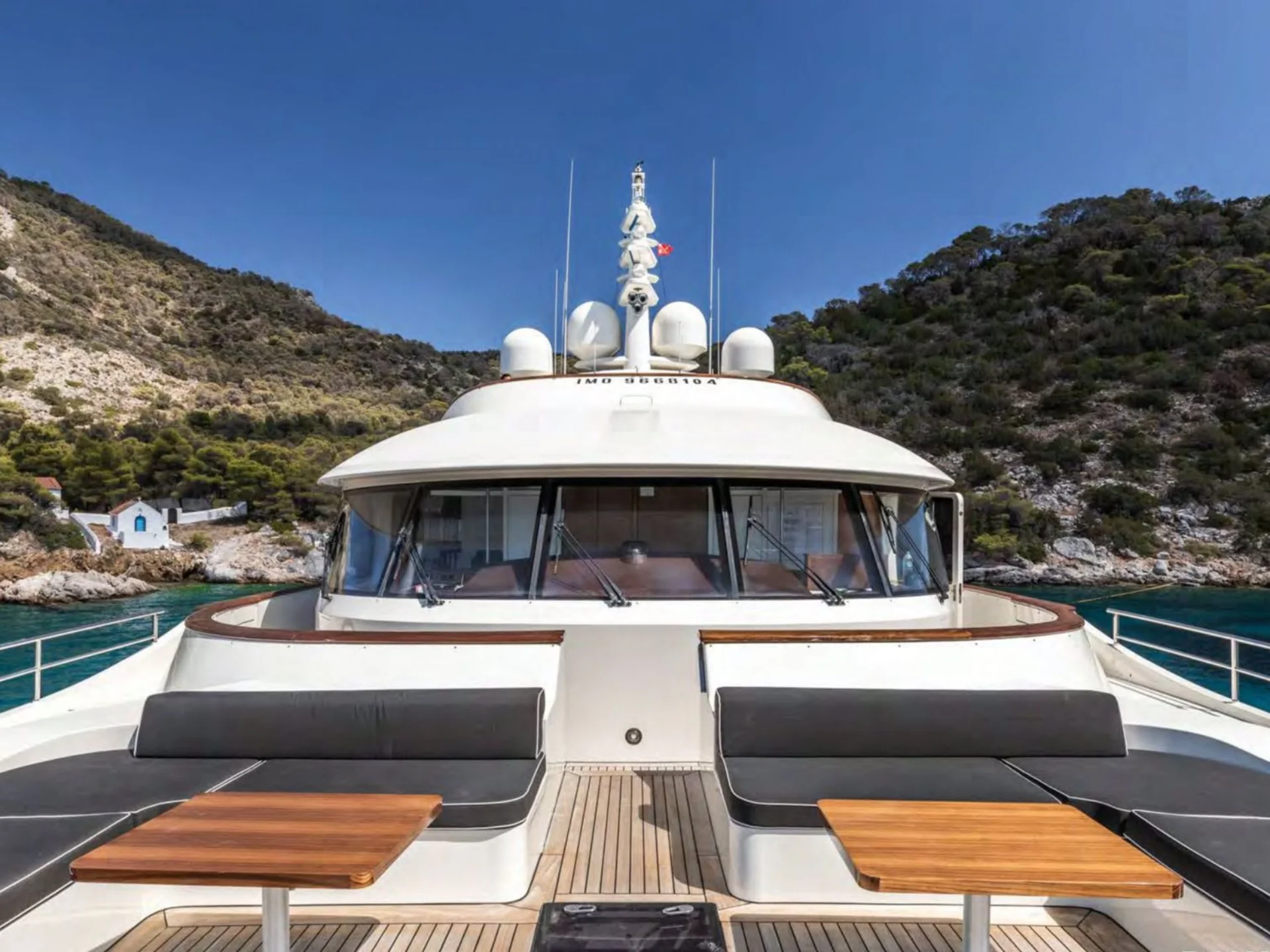 Expansive exterior decks feature multiple dining and lounge areas, a Jacuzzi on the sundeck, and a hydraulic swim platform for effortless access to the sea. Equipped with zero-speed stabilisers, she ensures exceptional comfort both underway and at anchor.