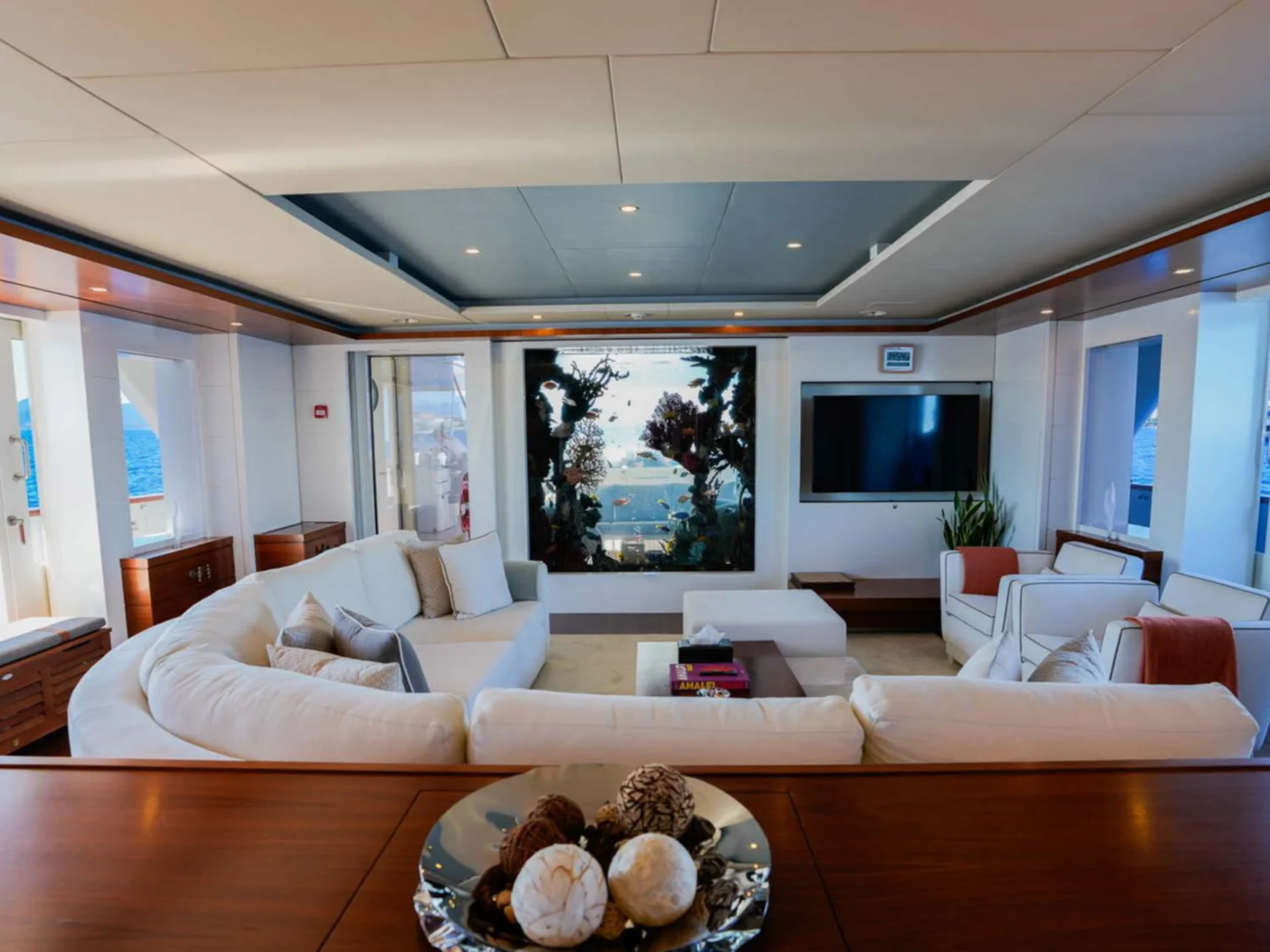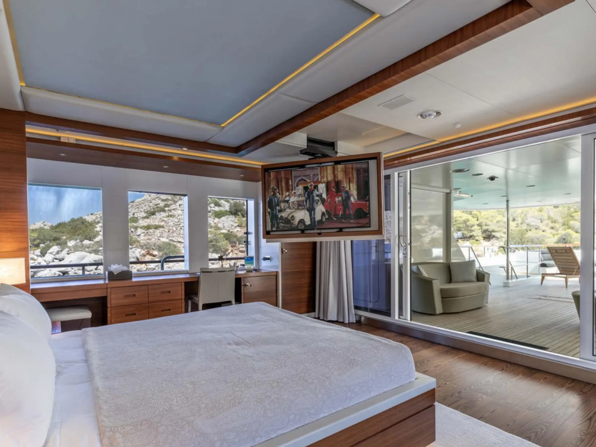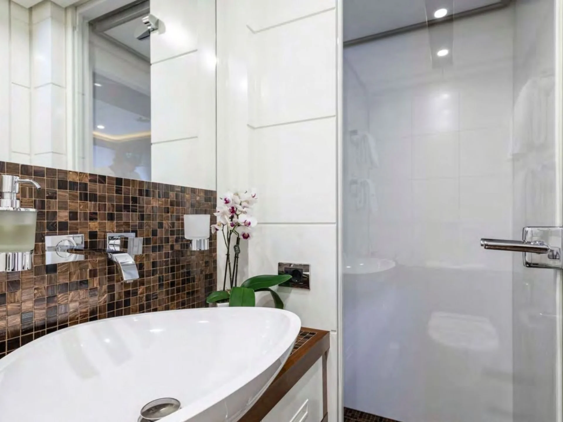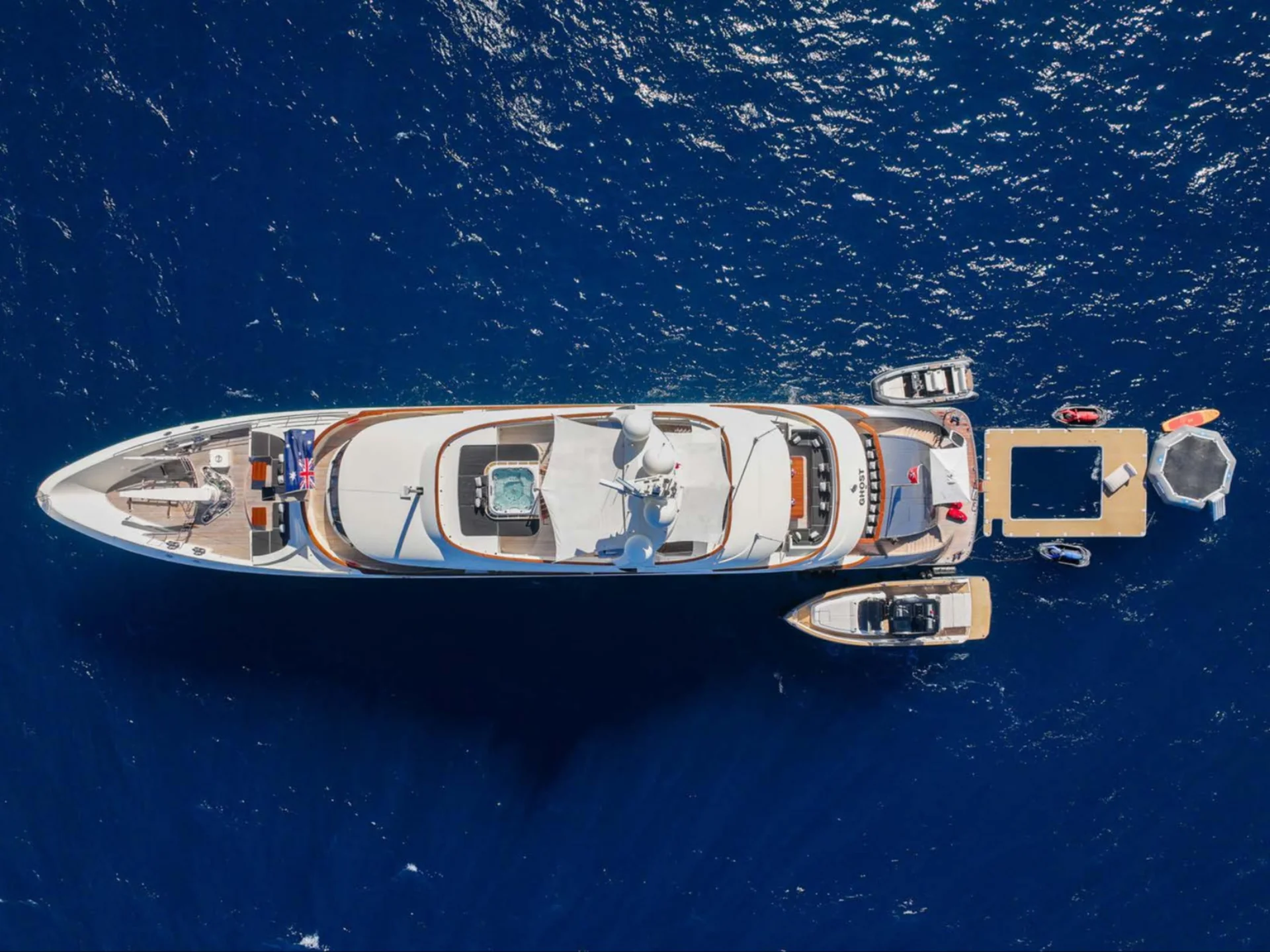 Expansive exterior decks feature multiple dining and lounge areas, a Jacuzzi on the sundeck, and a hydraulic swim platform for effortless access to the sea. Equipped with zero-speed stabilisers, she ensures exceptional comfort both underway and at anchor.