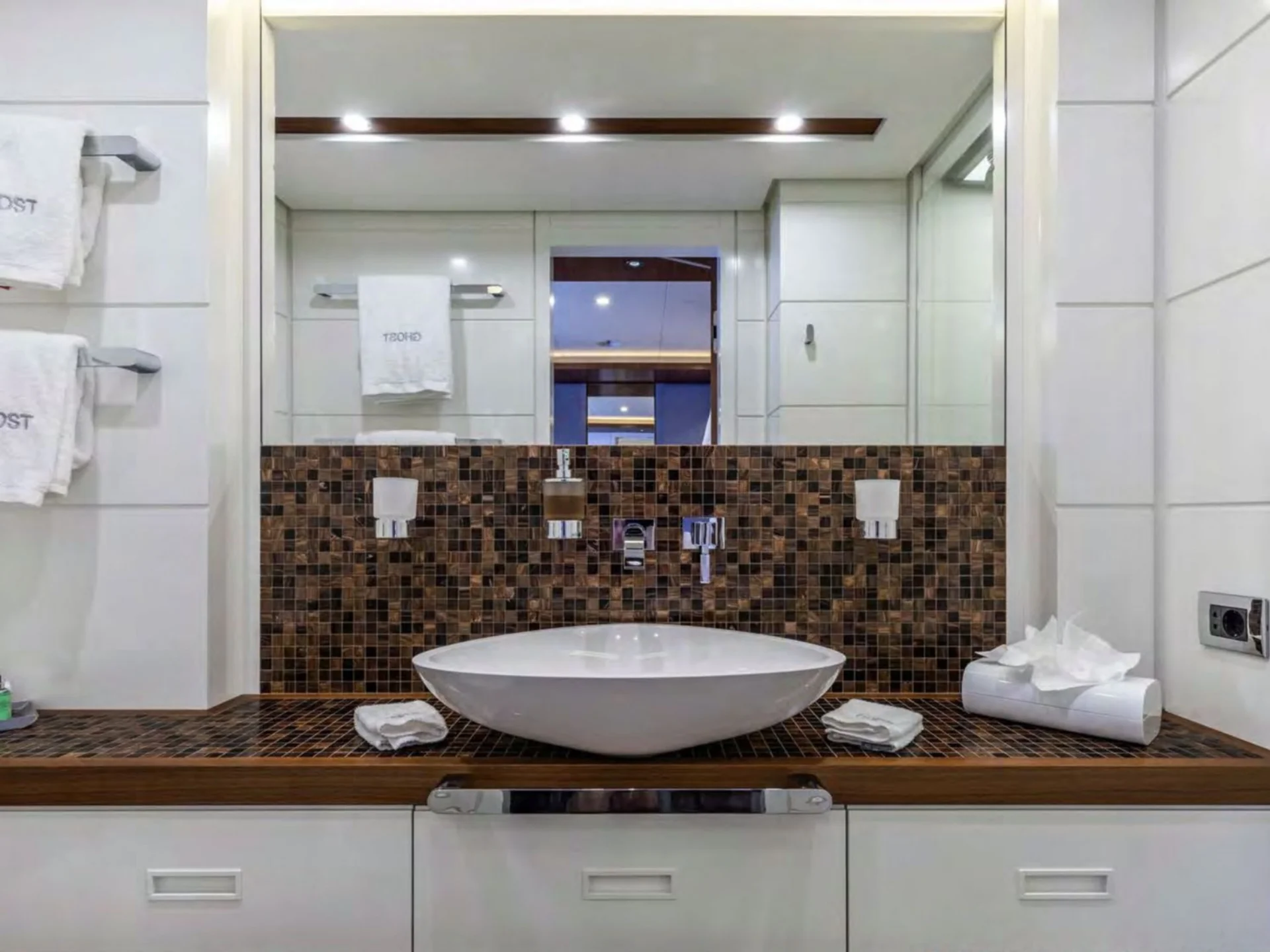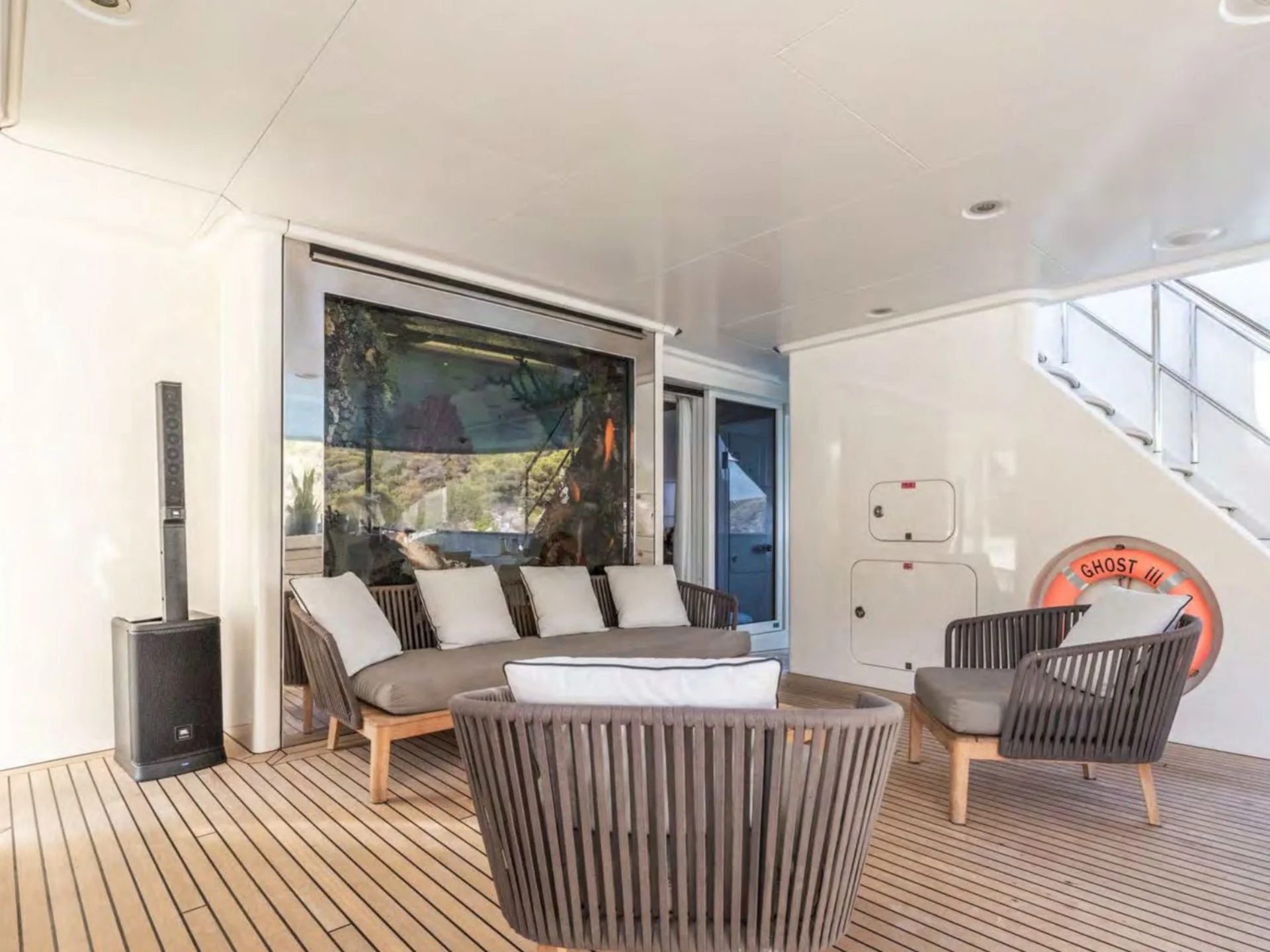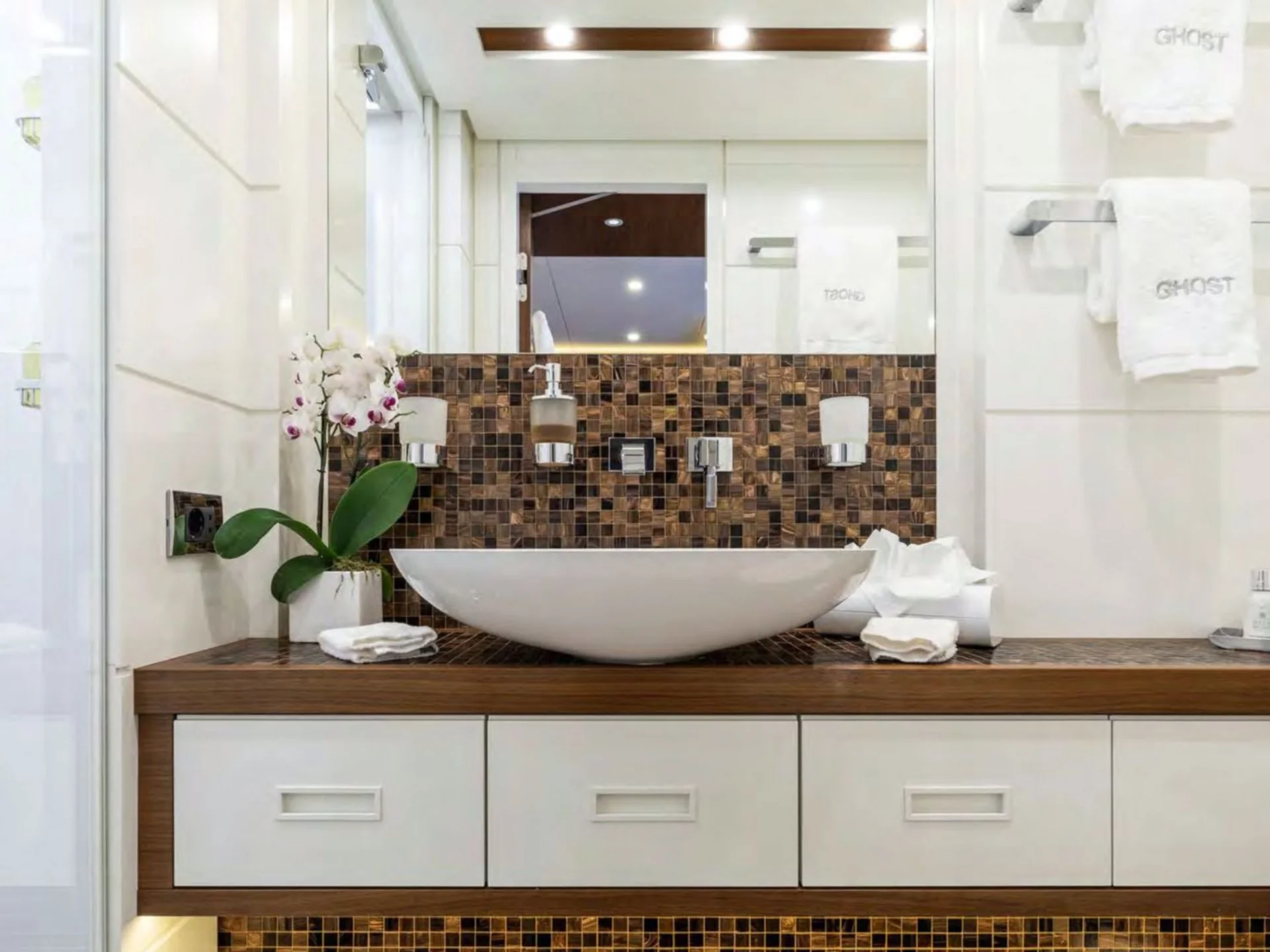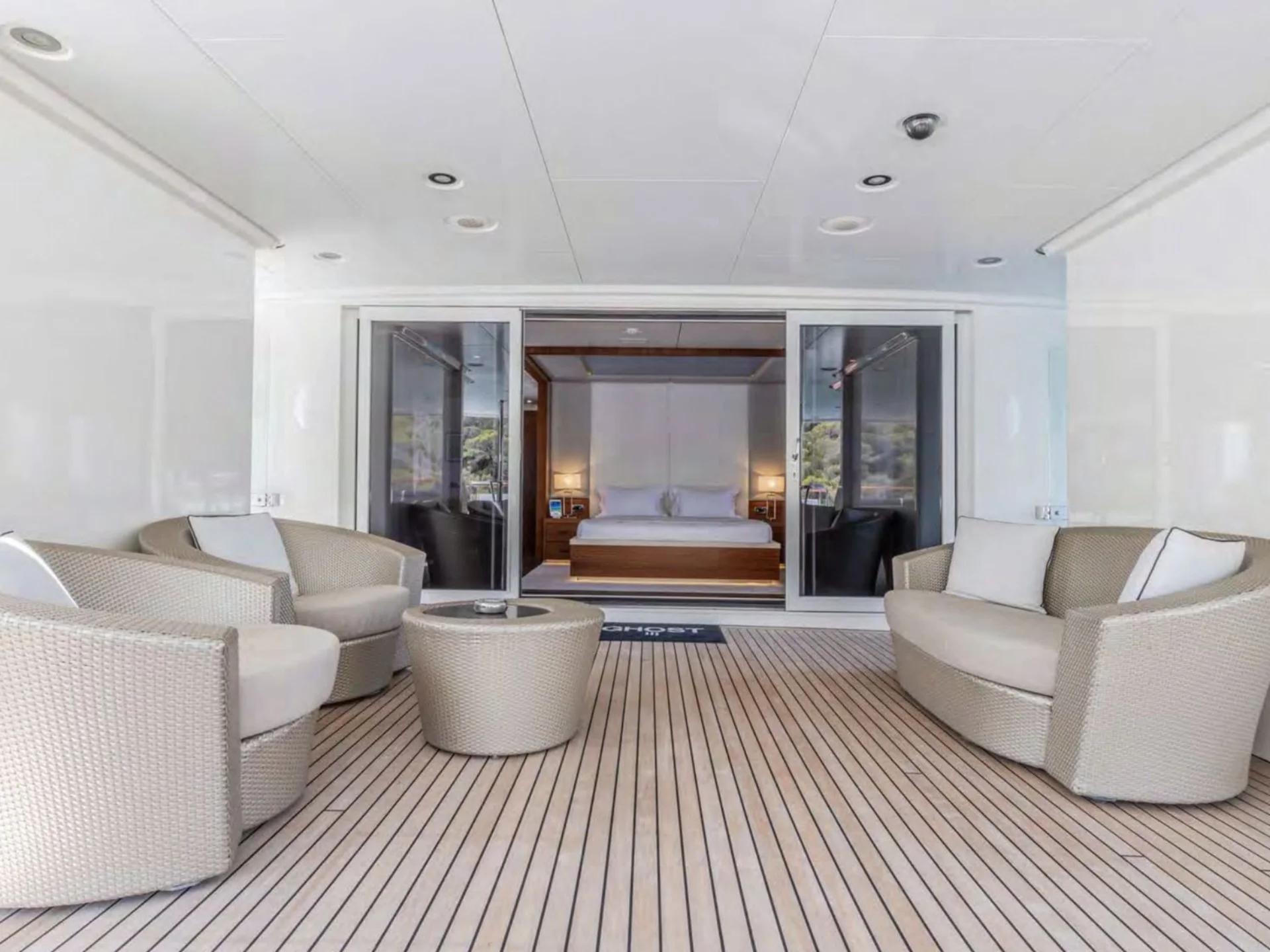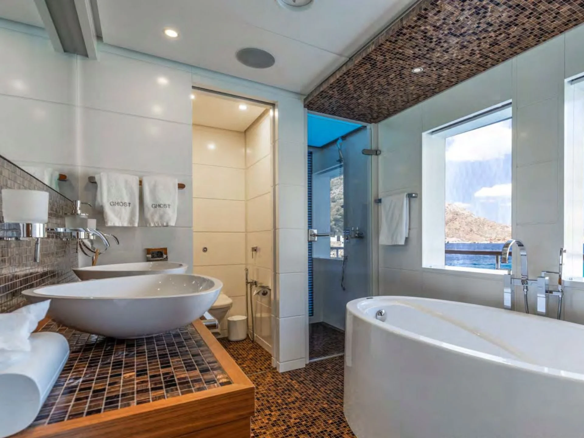 Her sleek exterior lines and modern profile house a spacious, light-filled interior designed for relaxation and entertainment. GHOST III accommodates up to 12 guests in six luxurious staterooms, including a full-beam master suite with private lounge, panoramic windows, and ensuite bath.