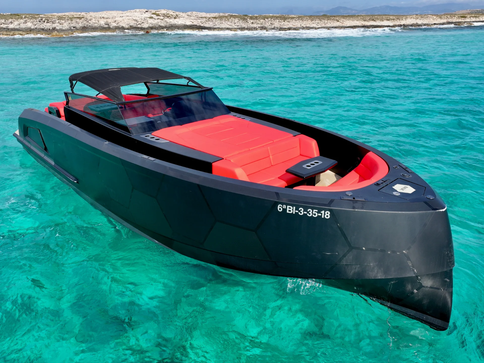 Featuring the iconic look of the BALR brand, her sleek black exterior and custom details make her a real head-turner that is easy to recognise. With an amazing sound system, this yacht is ideal for younger groups who love the BALR brand and want to stand out and be noticed while enjoying a day on the water. On board, guests enjoy a premium drinks package, linen and towels, and full insurance coverage. The BALR VQ45 combines style, brand identity, and comfort for an unforgettable day at sea.