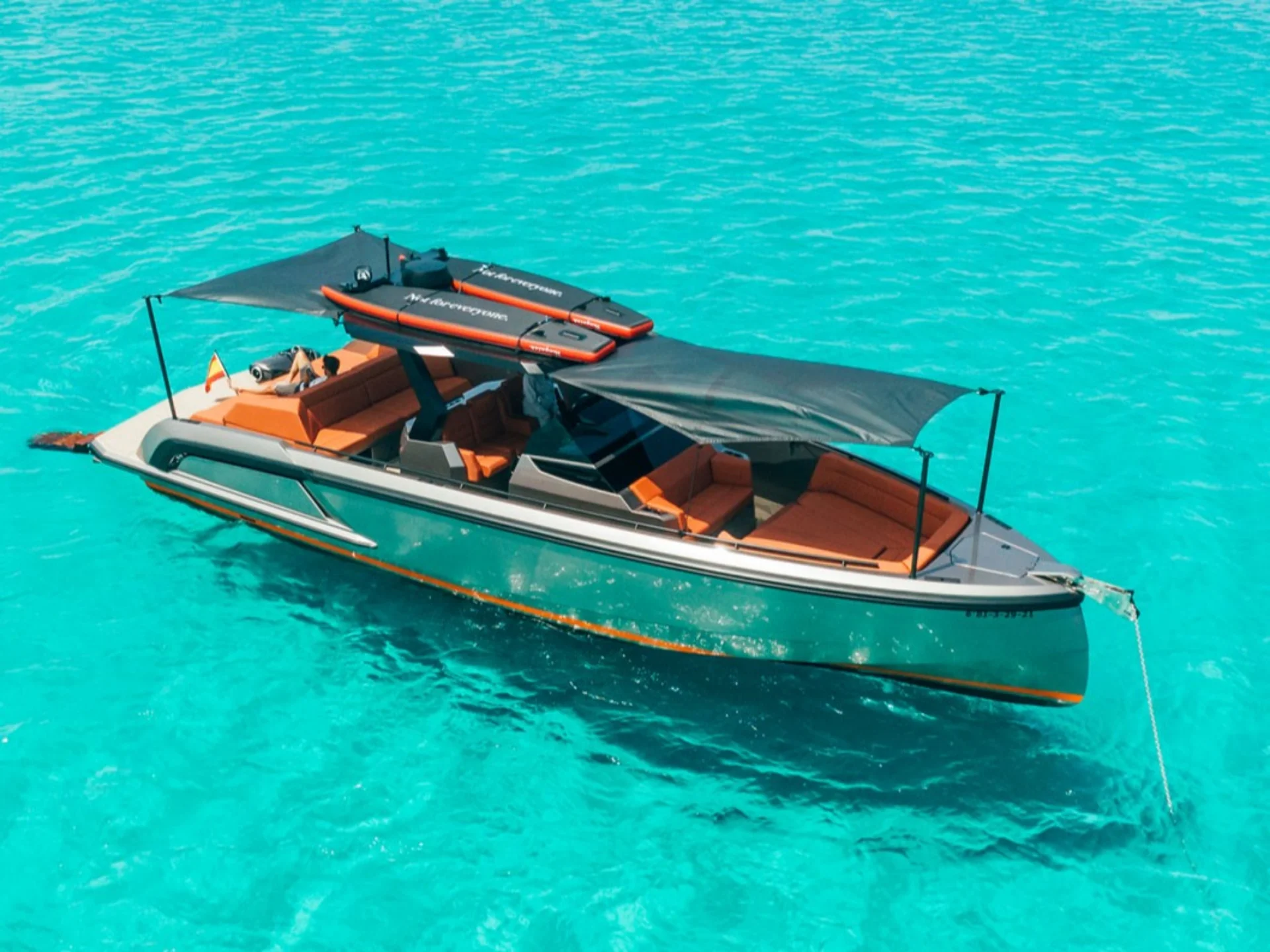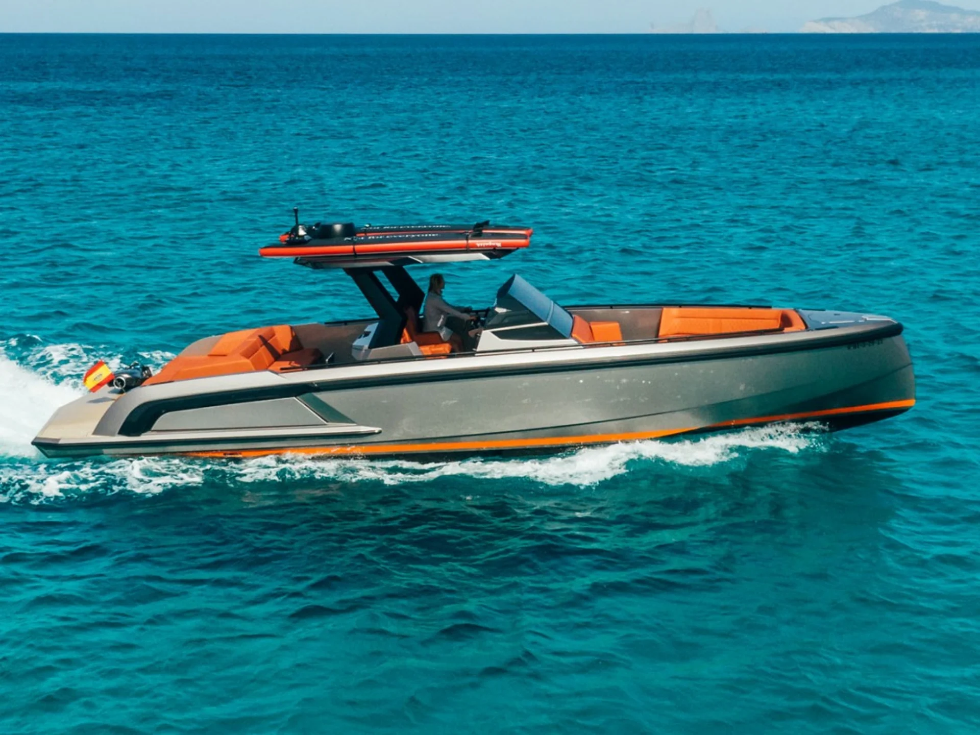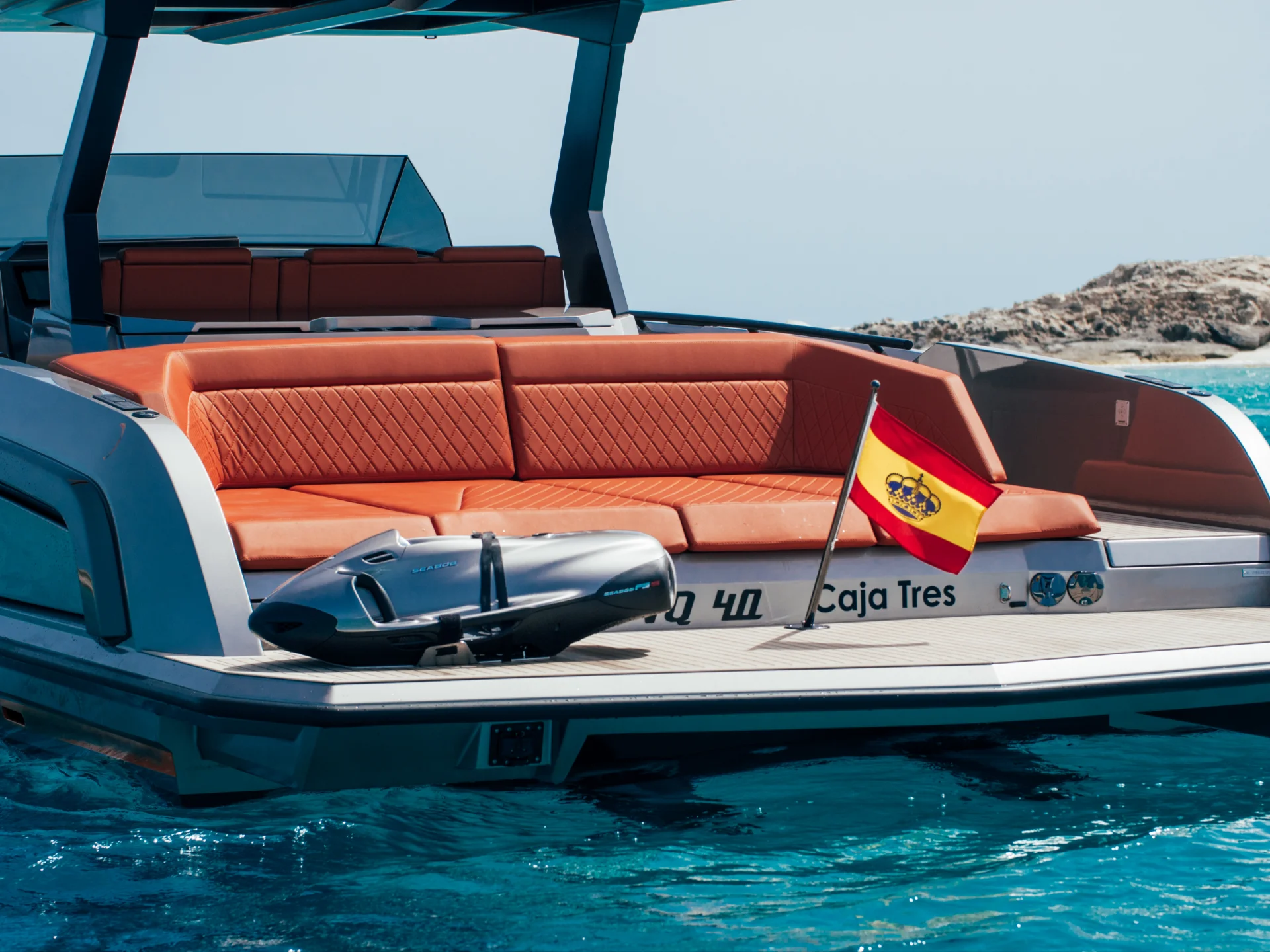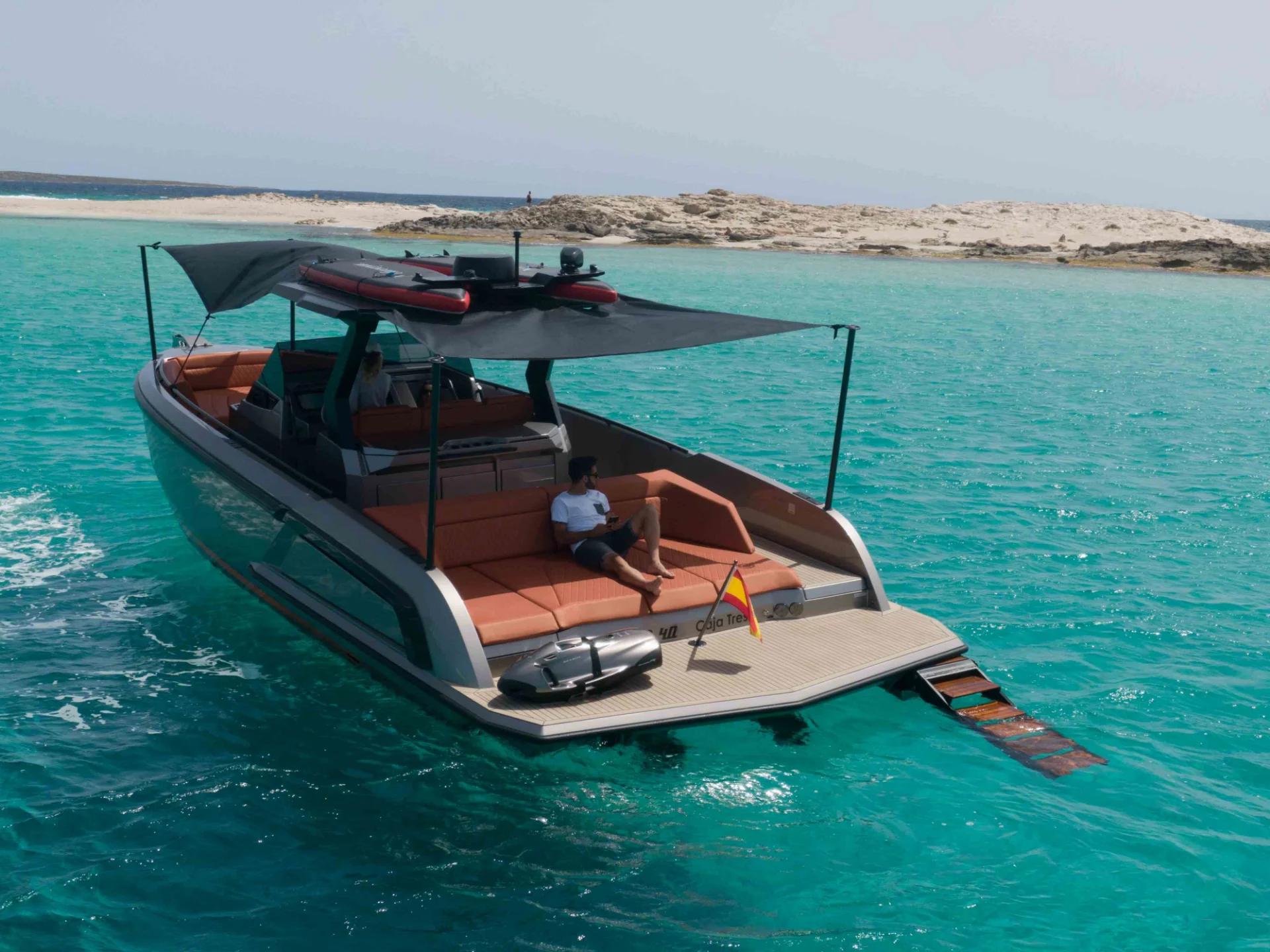 There is no yacht as eye-catching as the VQ40 in the smaller yacht market. This yacht's sleek design and high performance will impress its guests and provide an amazing opportunity to enjoy the crystal clear waters of Ibiza and Formentera like never before. She has a large swimming platform and plenty of sunbed space to soak in the sun.