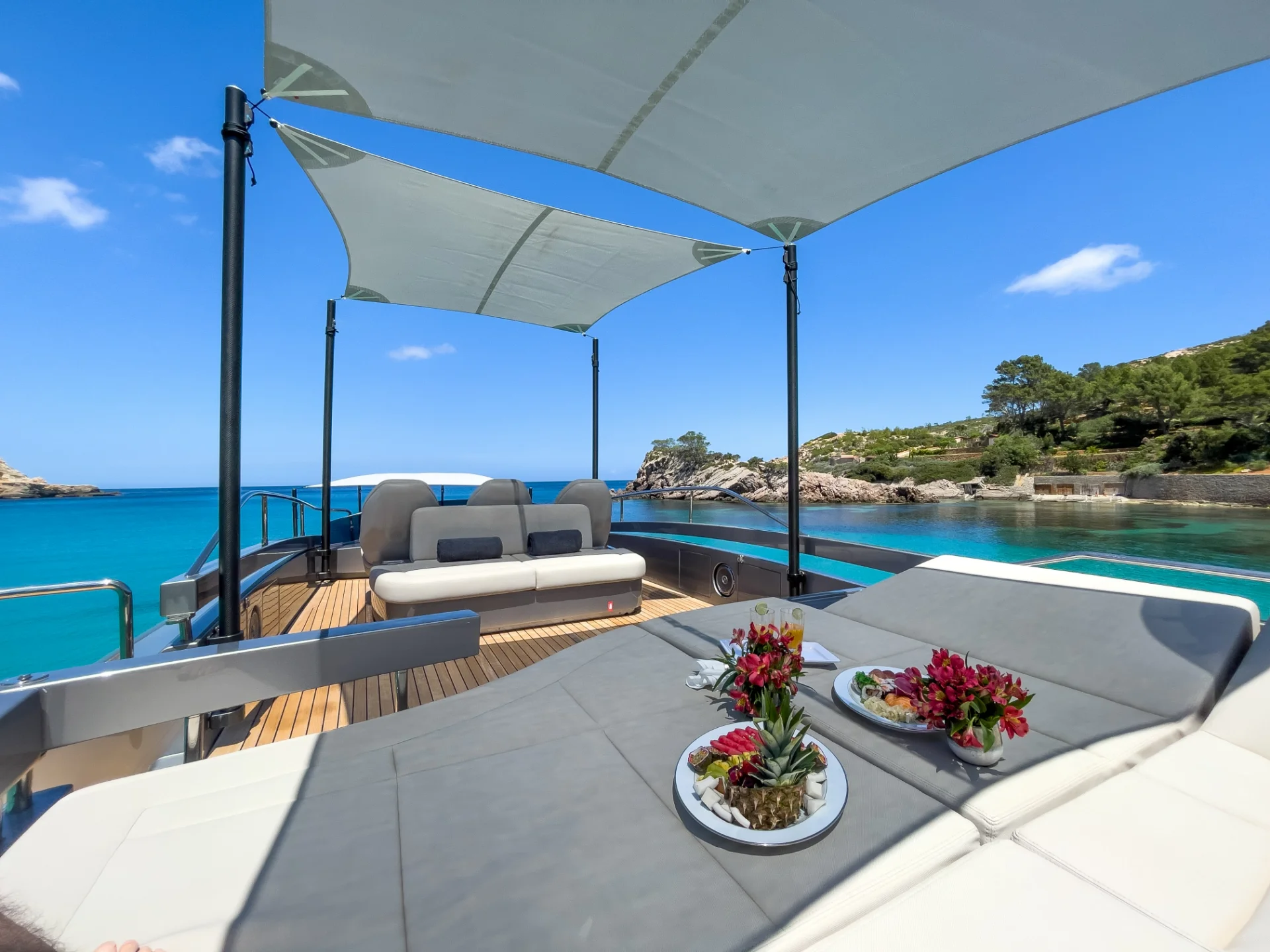 Este elegante Pershing 8X es mucho más que un yate rápido, todos y cada uno de los componentes están diseñados para sorprender. Cuenta con un nuevo y sorprendente Music Hull: es un sistema de audio integrado en el casco que le permite a usted y a su invitado escuchar su música favorita bajo el agua en un estilo muy IBIZA.