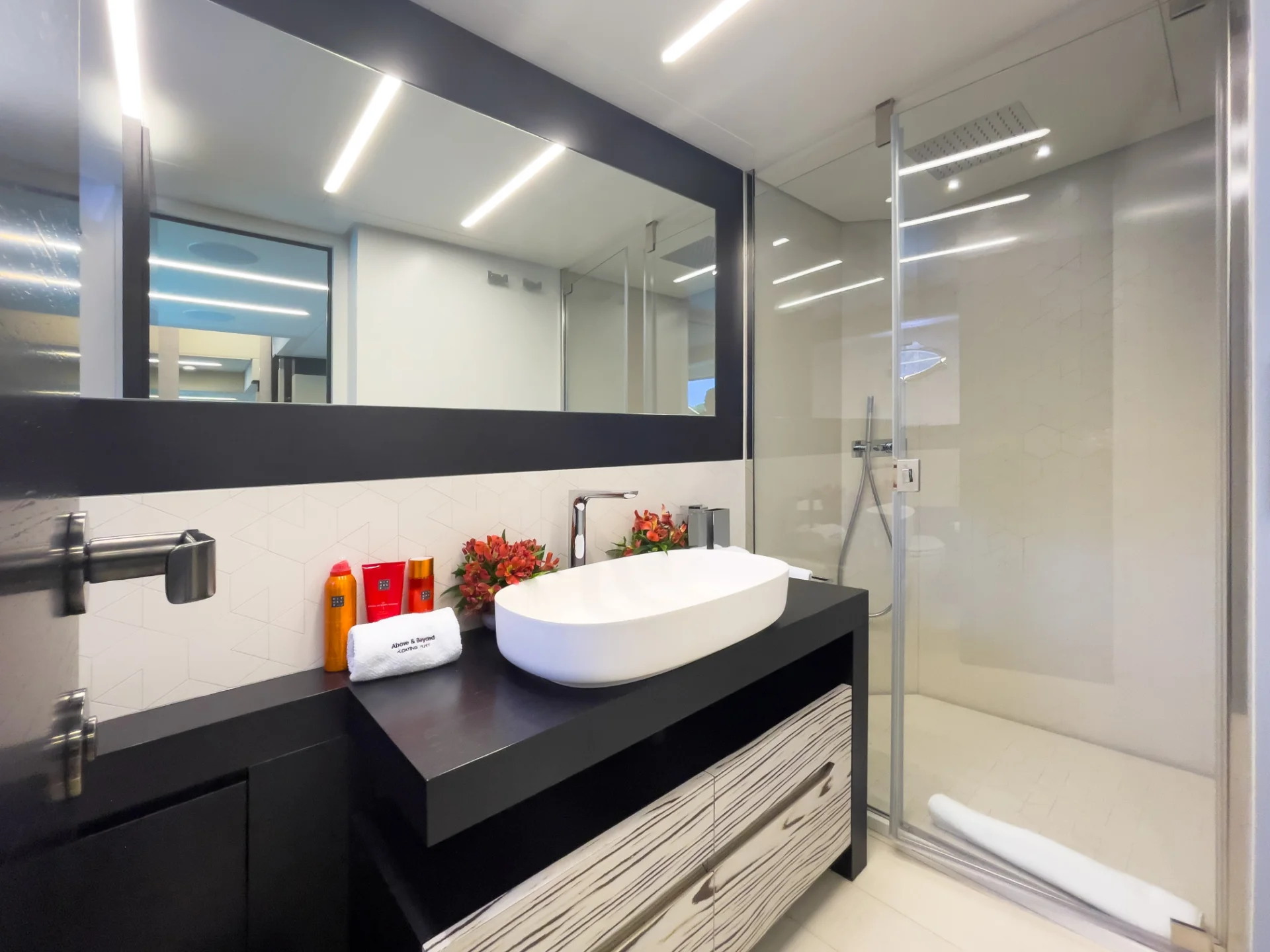 Motor Yacht Beyond 8X tiene 4 cabinas dobles para hasta 9 personas: la suite principal de viga completa en el medio, la VIP a proa y las dos habitaciones a lo largo del pasillo. Una de las cabinas dobles cuenta con dos camas más una tercera litera, lo que la convierte en el yate perfecto para un alquiler de yates con amigos y familiares.
