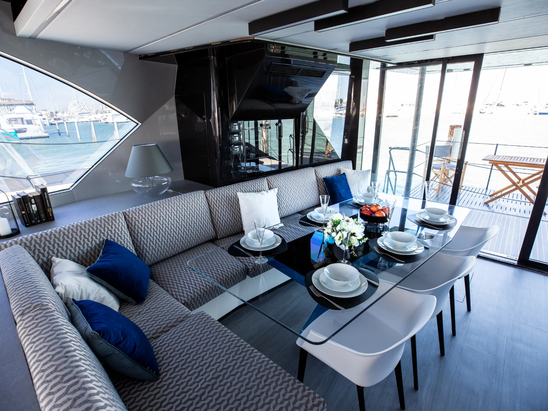 Inside, Wave 50 features bright, open living spaces filled with natural light. Comfortable seating, a formal dining area, and a fully equipped galley combine with modern amenities such as independent air conditioning, Wi-Fi, and satellite TV to create a welcoming and functional interior. Large windows connect the living areas to the surrounding sea, enhancing the sense of space and tranquility.