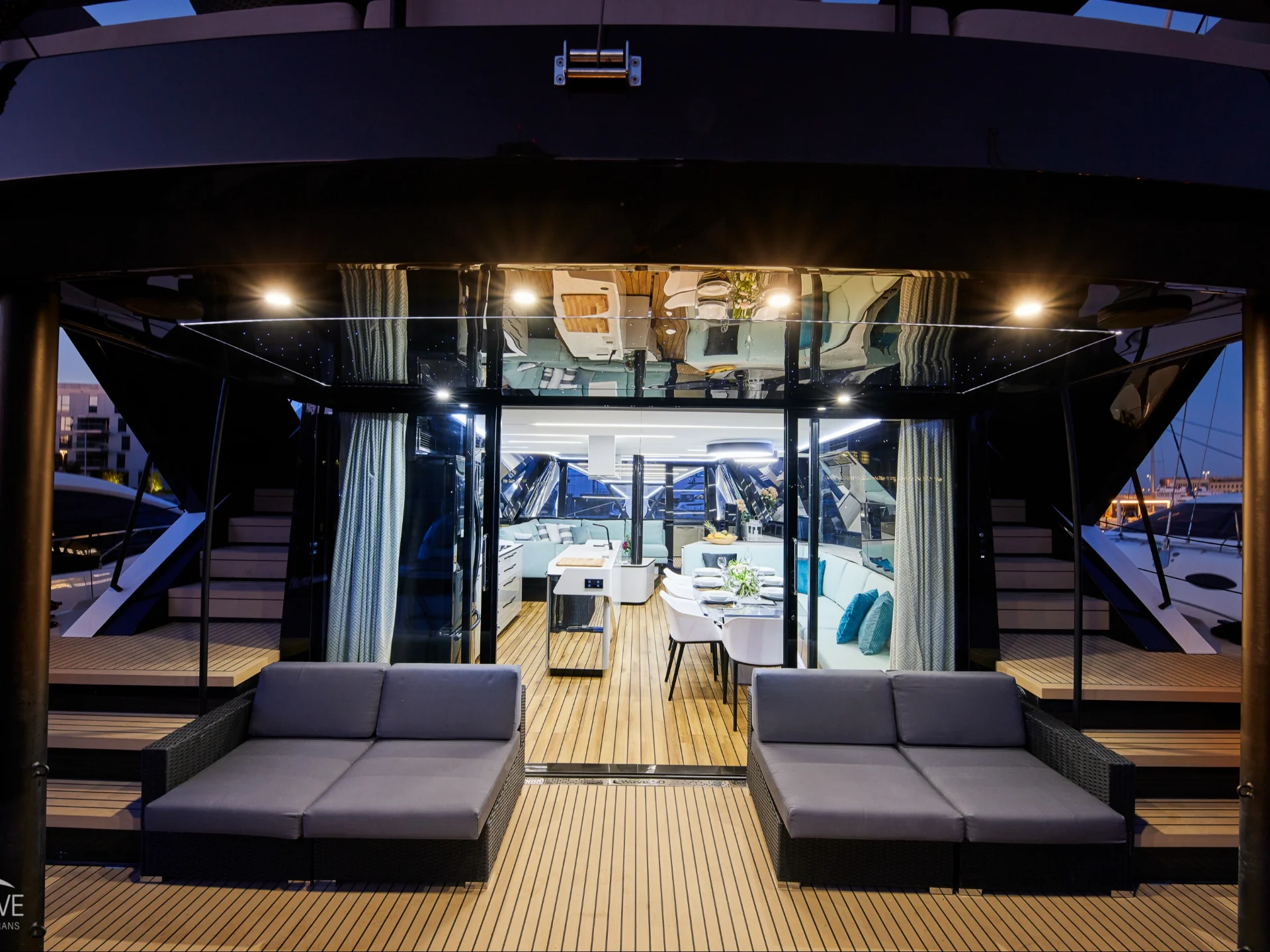 - Outdoor spaces include a flybridge and cockpit, perfect for sunbathing and relaxing.