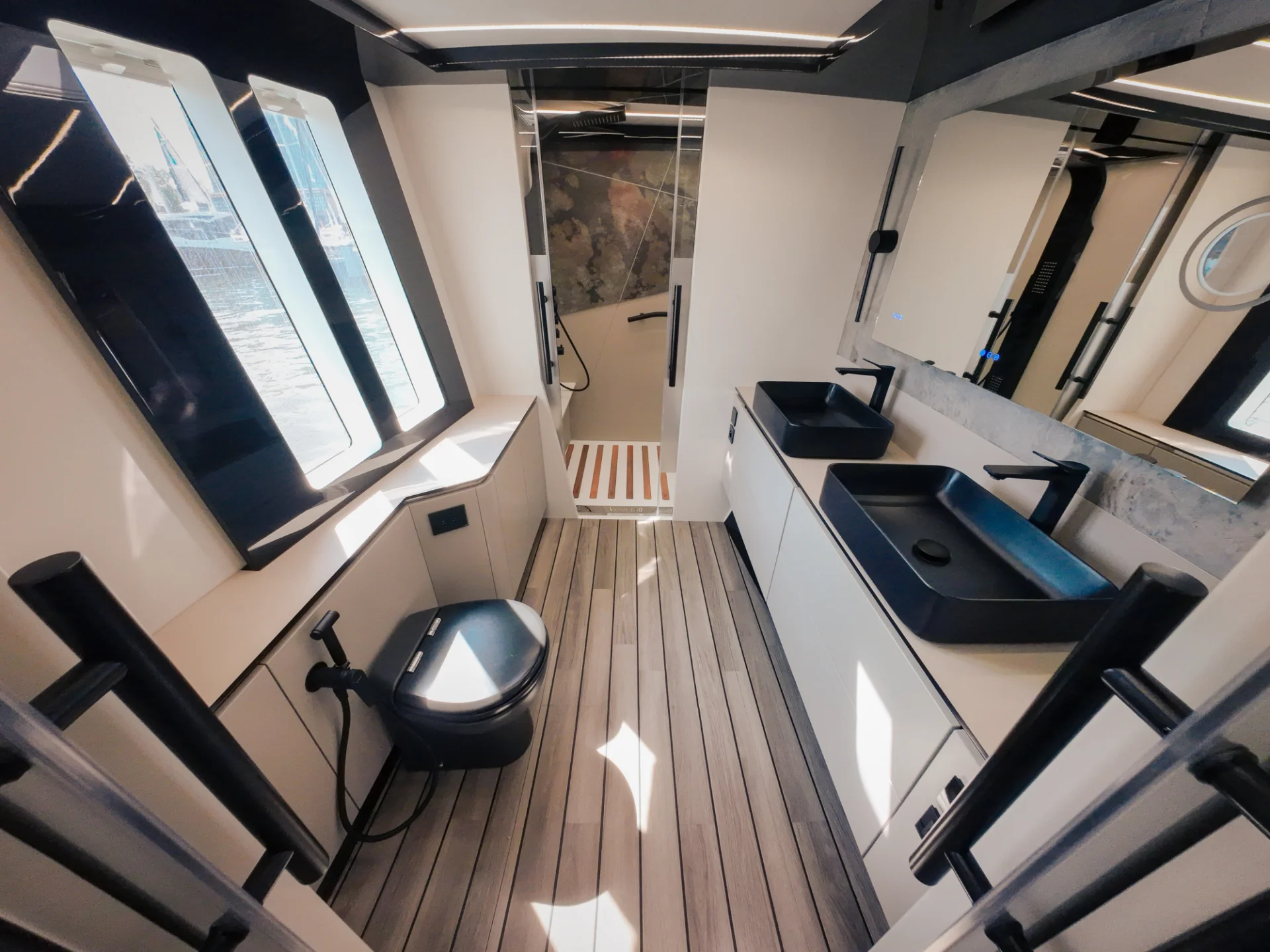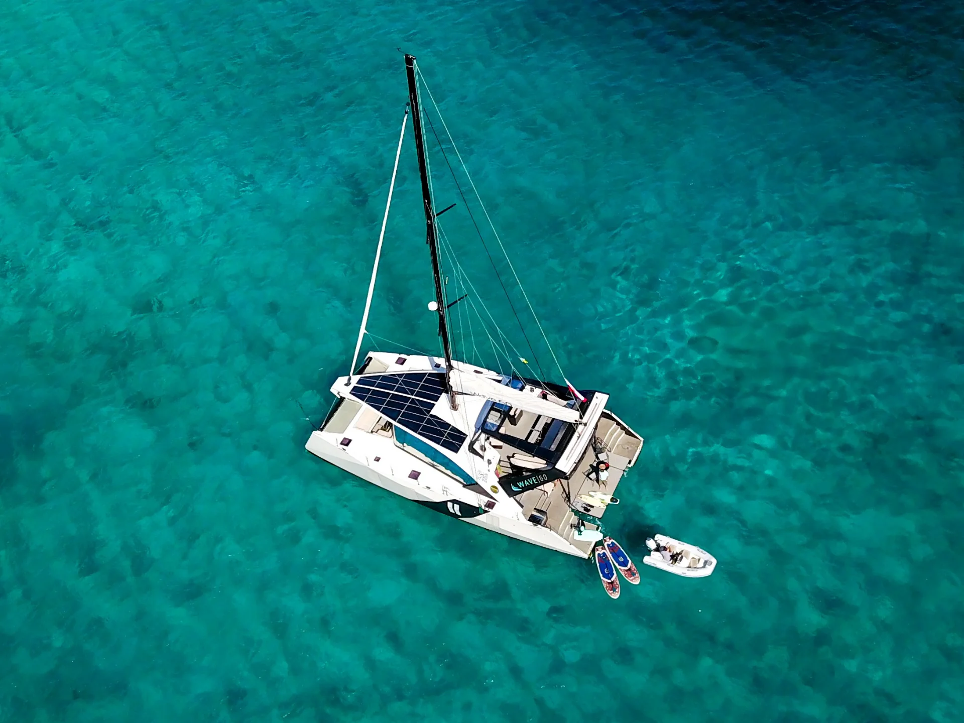 Wave 60 accommodates up to six guests across two expansive owner’s suites and one additional guest cabin, each with a private bathroom. The dedicated two-person crew enjoys separate quarters, providing service while preserving guests’ privacy. Every detail is carefully designed to elevate the onboard experience, from luxury finishes to spacious layouts that encourage relaxation and the joy of sailing.