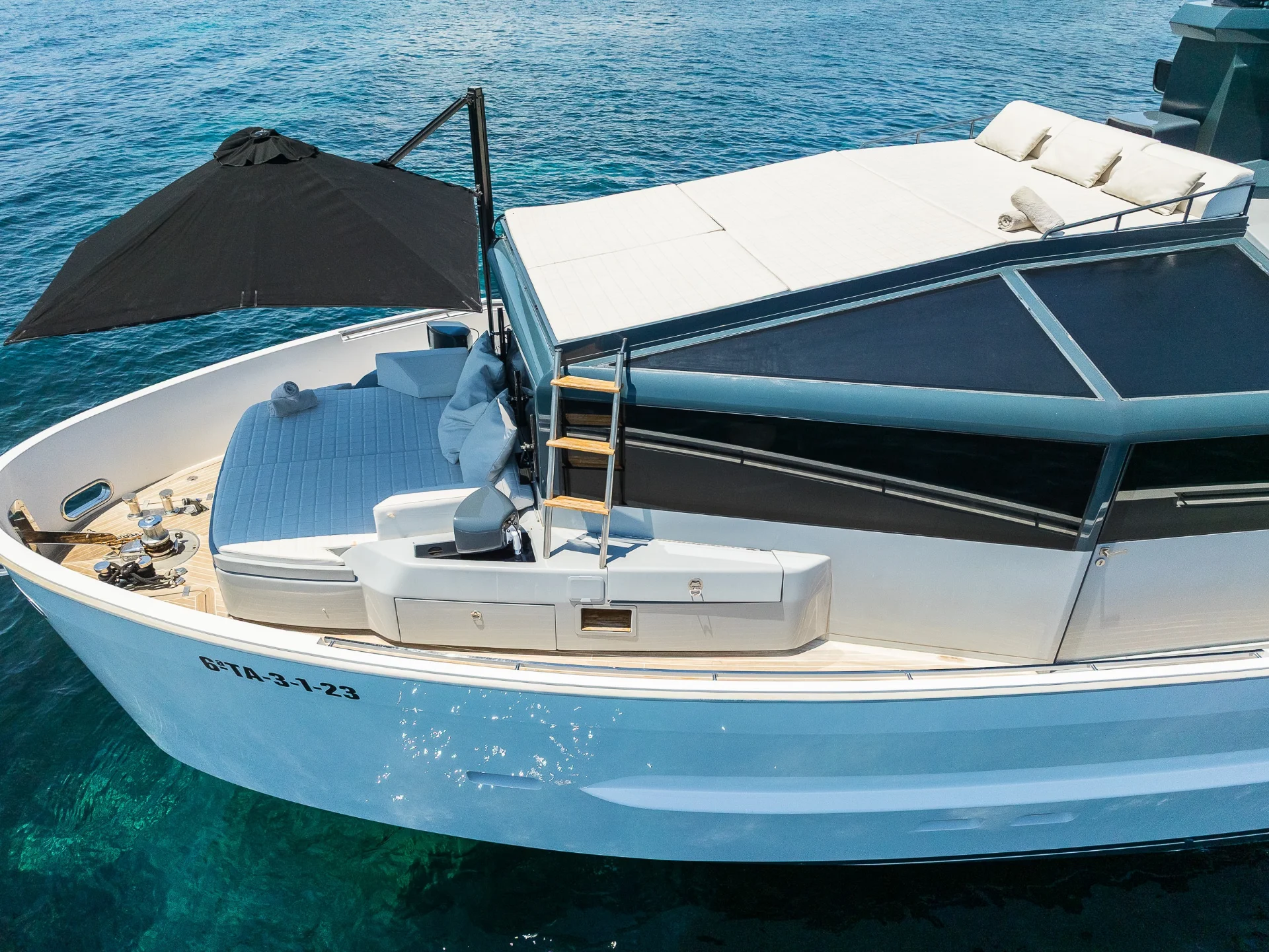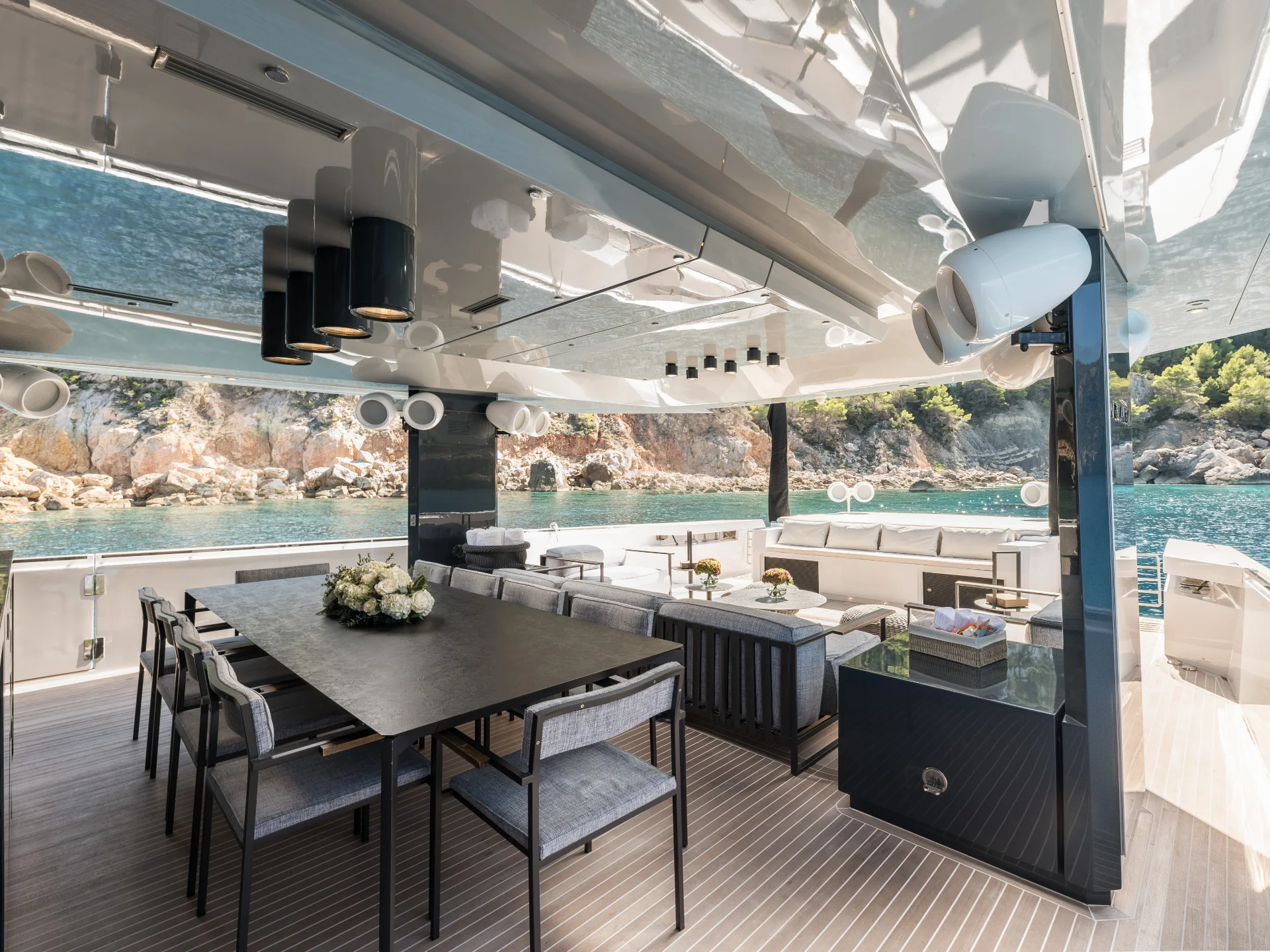 Dhamma II's standout feature is her expansive aft deck, a floating terrace designed for unparalleled comfort and socializing. This area is furnished with plush sofas and sofa beds, creating the perfect spot for relaxing by the sea. The large dining table offers an inviting setting for alfresco meals under the stars or sun-dappled lunches. The bow provides additional relaxation space, complete with sunbeds that offer sweeping views of the horizon, making it ideal for sunbathing or tranquil moments.