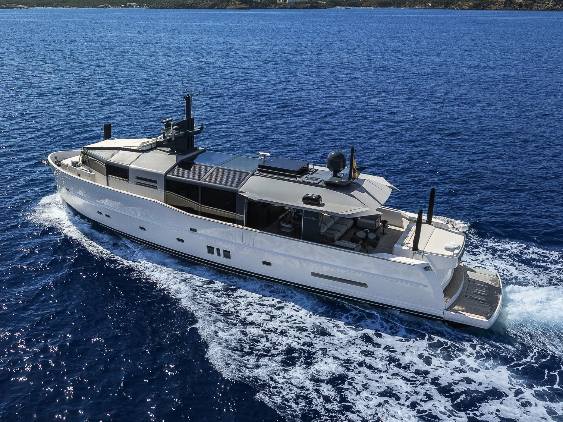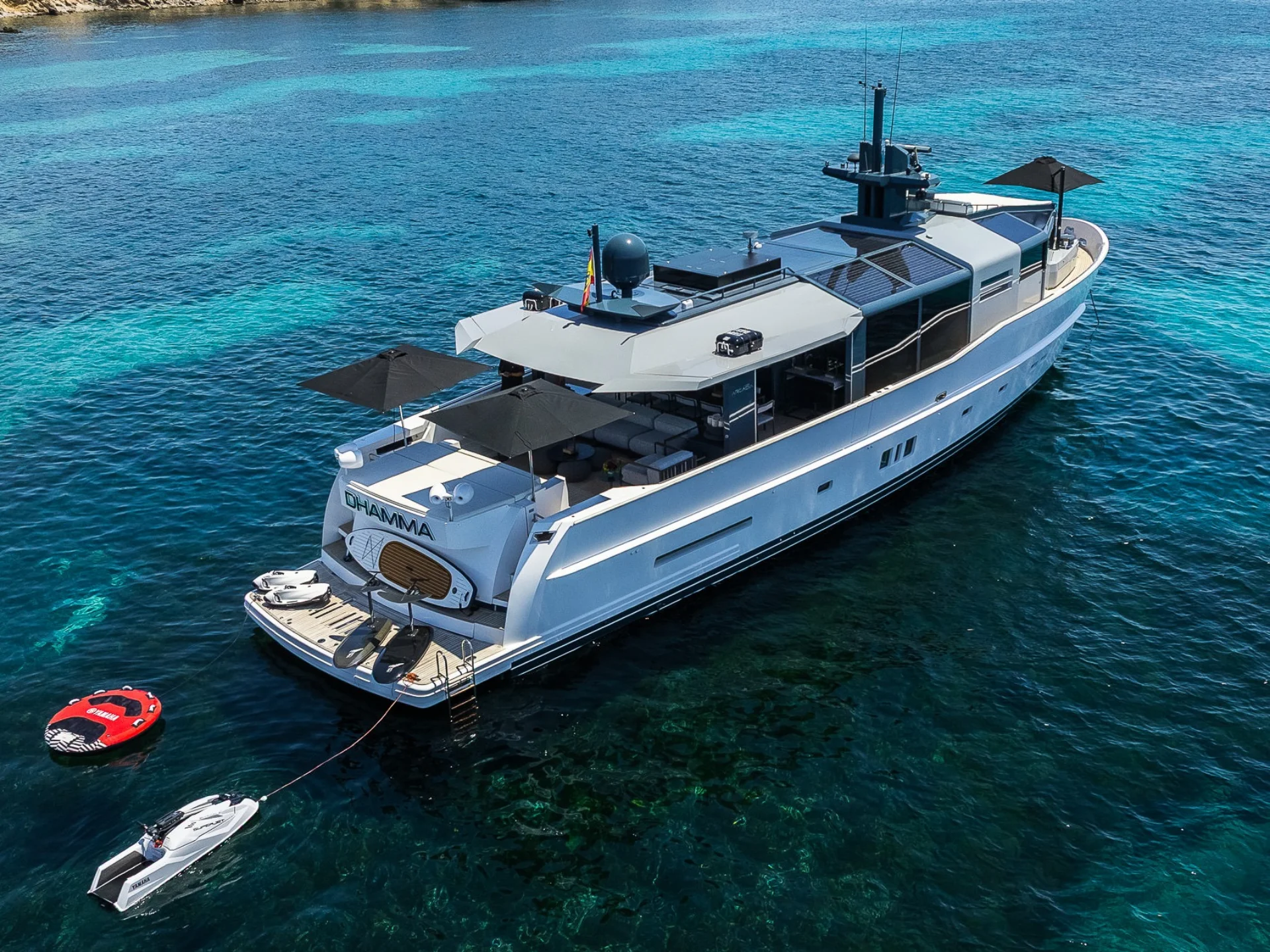 M/Y Dhamma II, an extraordinary 24-meter Arcadia 85, is now available for charter in the Balearic Islands, offering a unique blend of eco-friendly innovation, luxurious comfort, and seamless outdoor-indoor living. Built by the acclaimed Italian shipyard Arcadia in 2011 and comprehensively refitted in 2023, this yacht embodies a sophisticated approach to sustainability and elegance. With a spacious design and modern amenities, Dhamma II is perfect for those looking to experience the Mediterranean with style and a mindful approach to nature.